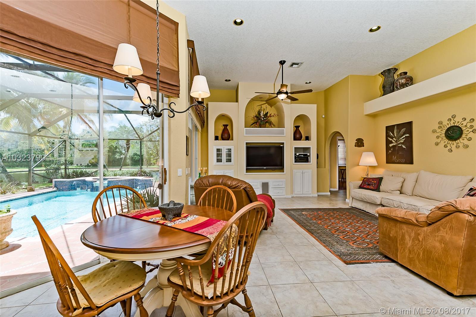 PRICE TO SELL ! Mediterranean flair tucked on a private lake front lot in Jasmine Island. One story home featuring 5 bedrooms and 4 full baths. Custom screened solar heated pool with raised spa and custom design pool deck. Open floor plan, volume ceilings tile in living areas and hardwood floors in bedrooms.Kitchen boasts wood and glass cabinetry, center island ,granite counter tops . SS Appliances. Living room , breakfast area ,family room all with relaxing pool and lake view.Accordion shutters