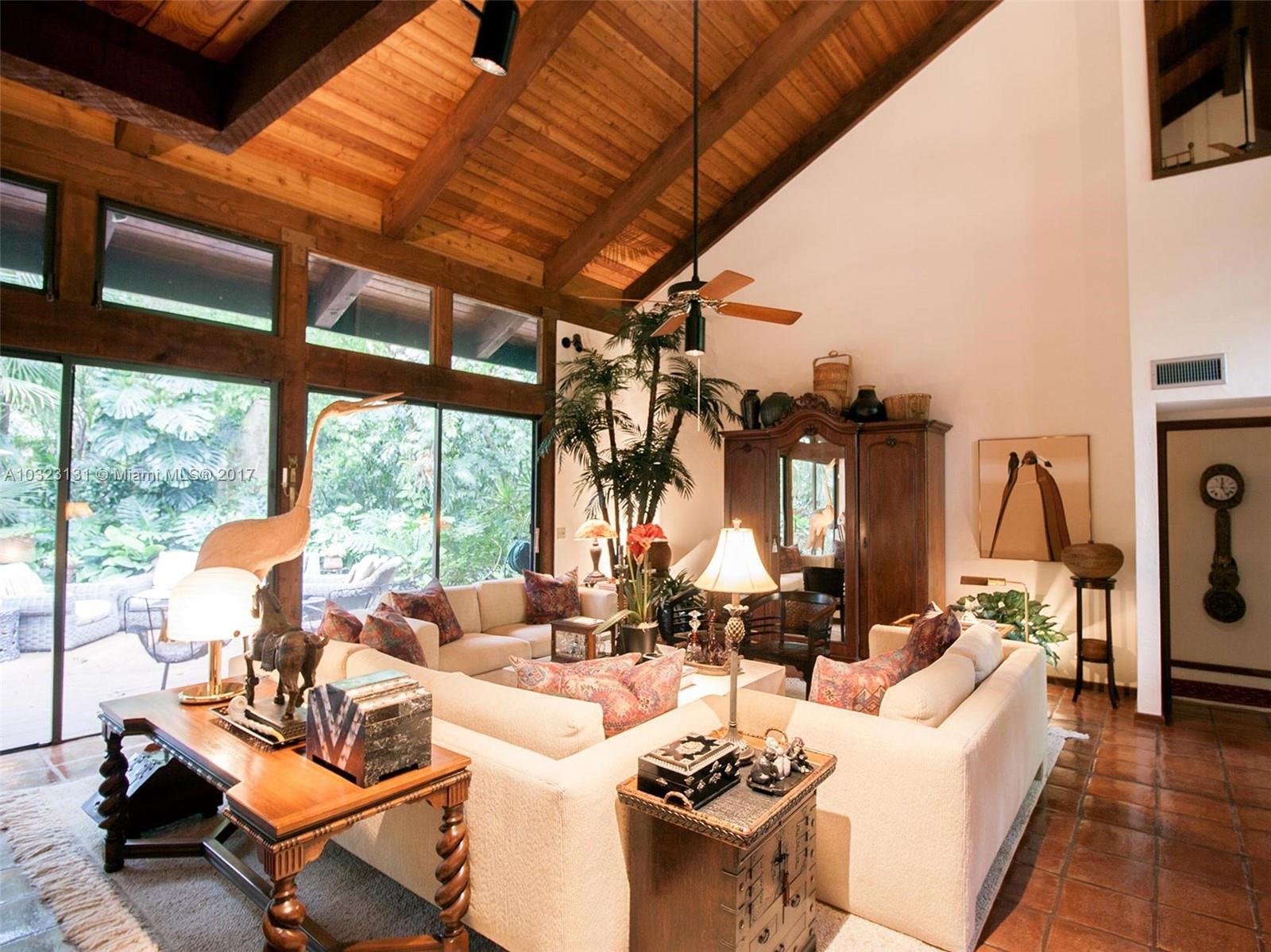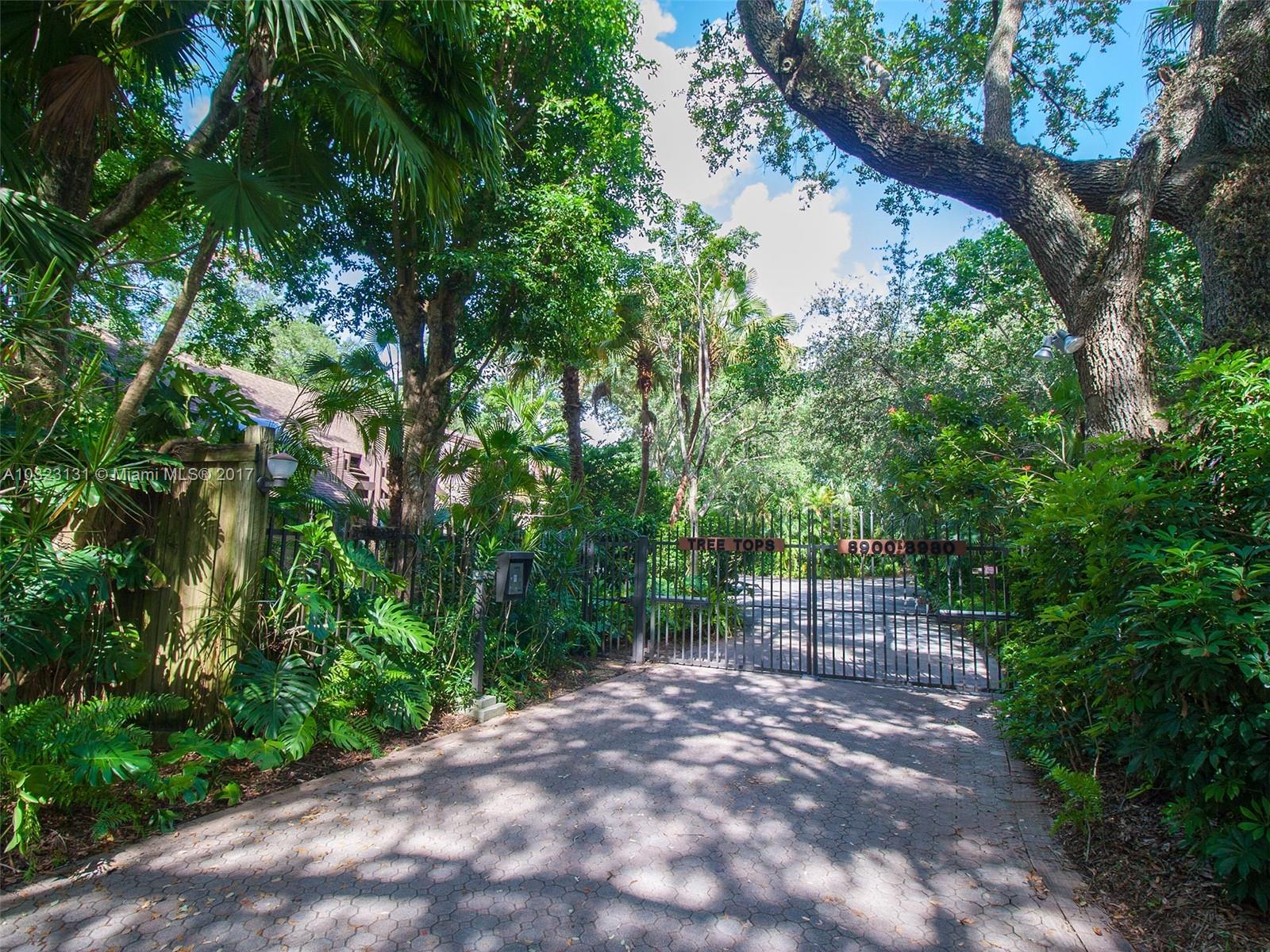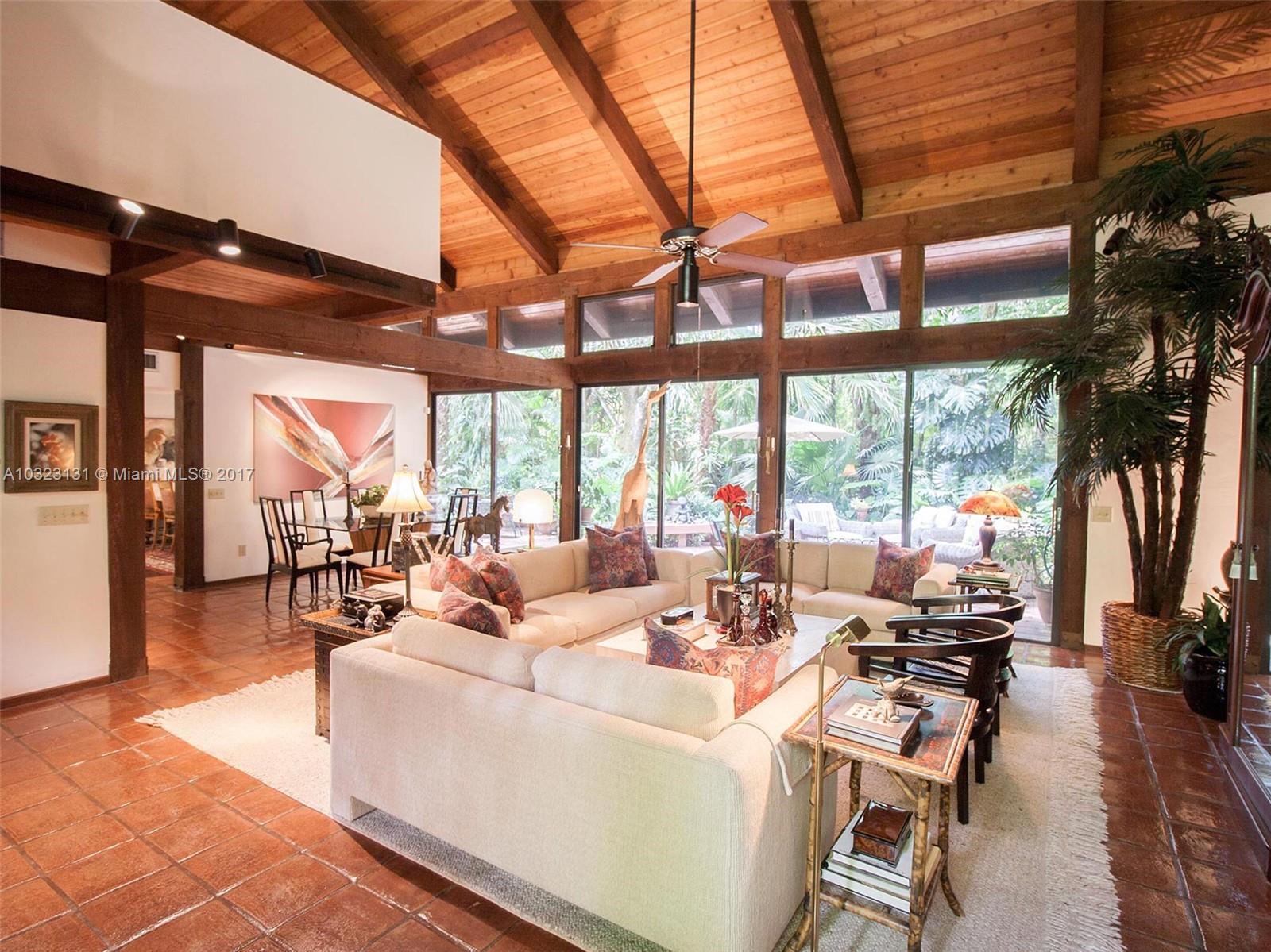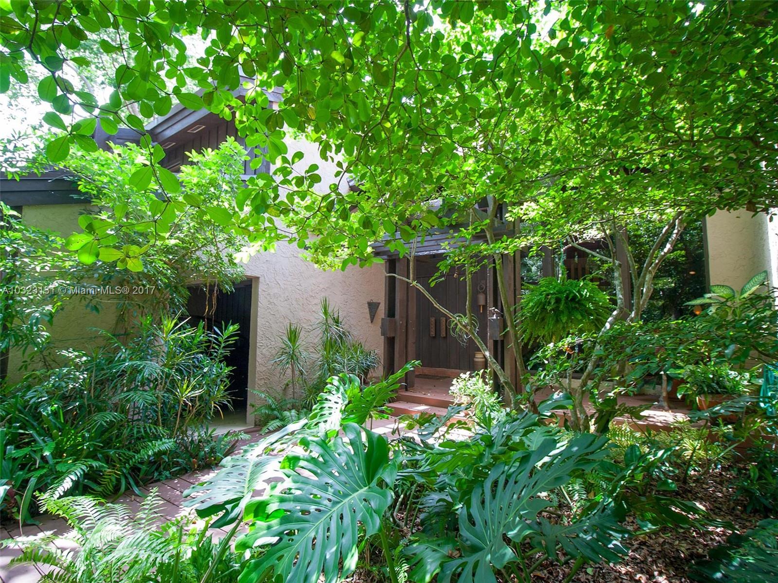Live in a dream tree-house! There's nothing else like it! Private. Secure. Unique natural paradise in N. Pinecrest. Six homes on gated 3 acres architected by Charles Sieger share large pool and N-S lit tennis court. Original owner/community designer ready to sell! Amazing builder's model boasts 24' soaring ceilings w/tongue & groove exposed natural wood. Post & beam construction w/CBS walls. New roof. Open floor plan w/unique lofted spaces makes this home perfect for entertaining. Mexican tile mix w/wood & carpeting. Master suite located downstairs with lofted study, huge walk-in closet & cavernous master bathroom w/skylight. Other two BRs on separate loft space w/family room. Gorgeous back patio area w/lush tropical plantings on largest lot backs to quiet acre estates. Modernize to taste.