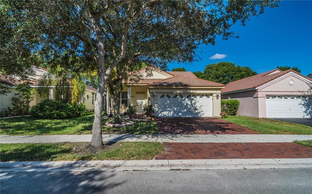 Beautiful home in The Falls. Popular Corinne Model on private berm lot. Open floor plan with extended screened patio, renovated Kitchen with granite tops and newer appliances, 3 bedrooms with 2 full baths, tile floors in living areas, berber carpet in bedrooms, french doors, renovated baths, pavered driveway, walking closets, laundry room and 2 car garage. Very well kept. A must see!