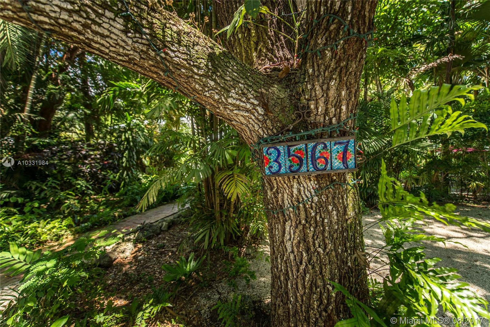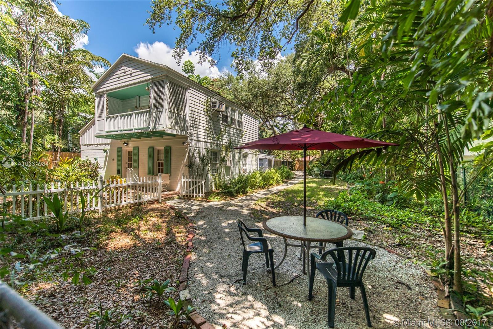 Quintessential Grove bungalow featured in the book The Tropical Cottage. A Key West-style home built in 1939 as a 2-story duplex and a separate guest cottage with an “Old Miami-style” screened porch. Potential to convert 3/2 main house into a single family home. Original architectural details include wood-beamed ceilings, pecky cypress paneling & 2 fireplaces. Updated plumbing & impact glass throughout. Oversized gated lot with lush tropical foliage canopied by mature oaks. Walk to the village.