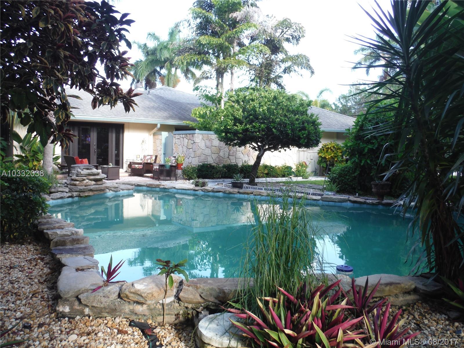 Beautifully landscaped, waterfront ranch style home on just under 1/2 acre. Features split bedroom floor plan. Spacious master bedroom with his & her walk in closets and french doors that walk out to gorgeous pool with waterfall. Master bathroom with powder area. Access to private courtyard from master bathroom and pool area. 2nd Bathroom recently remodeled has new vanity, ceiling fan, subway tiles and cedar wood ceiling. Fenced yard. Mango & Avocado trees. Circular driveway. Rock garden. Large screened patio w/3 ceiling fans. Lots more! Don't miss it!
