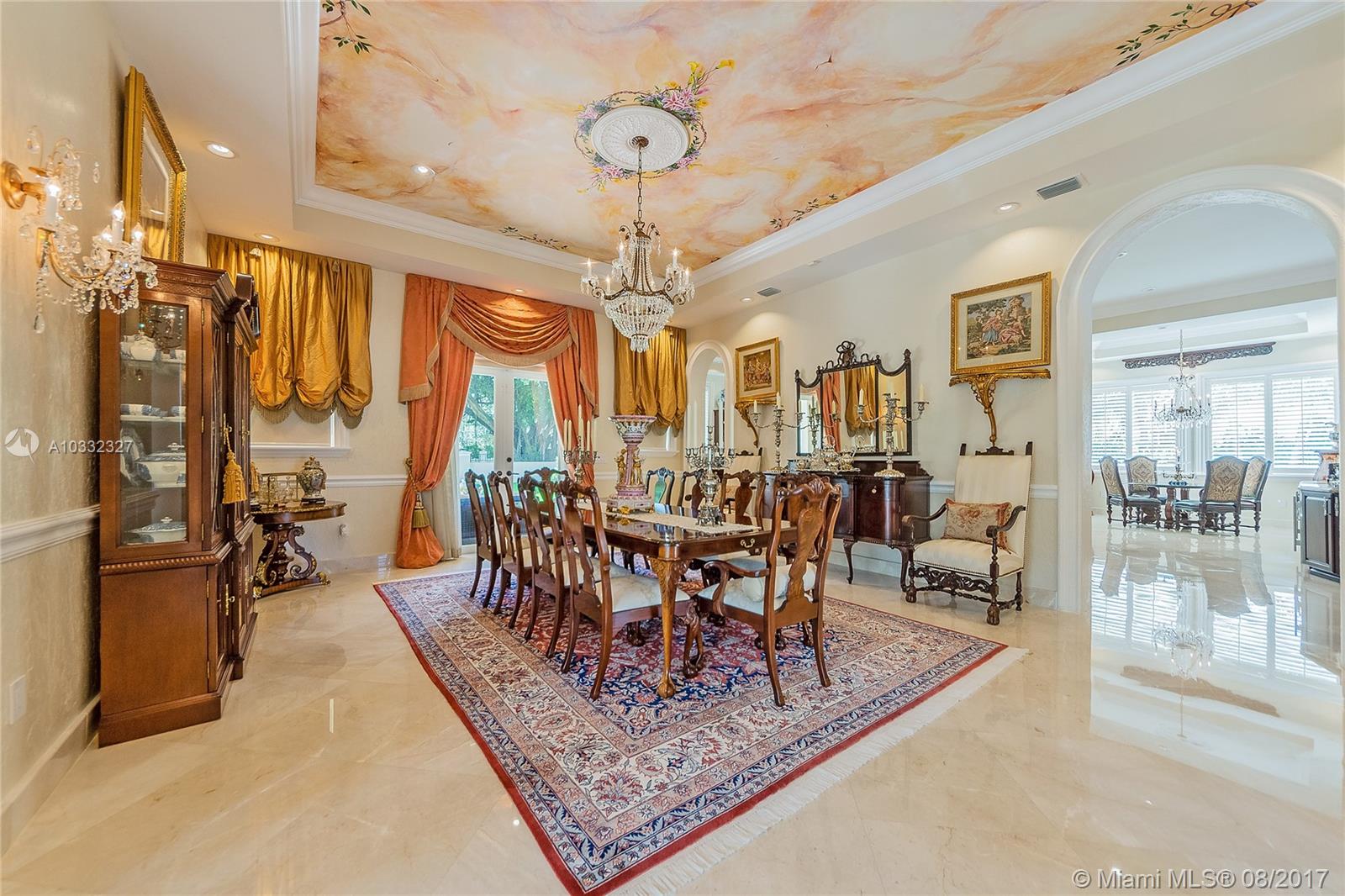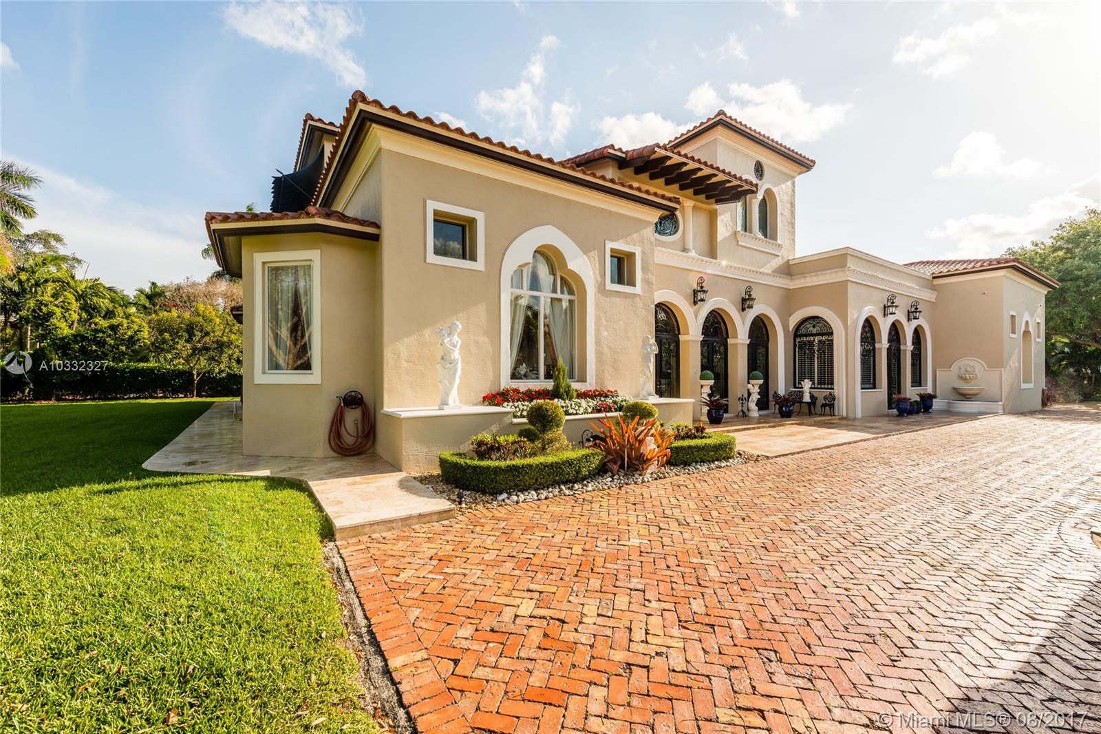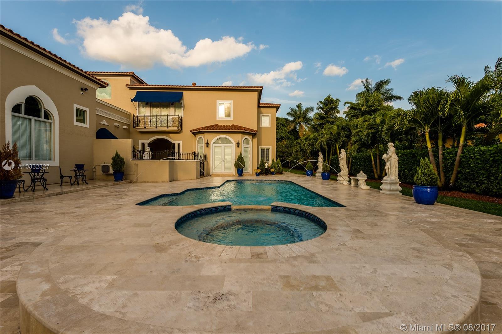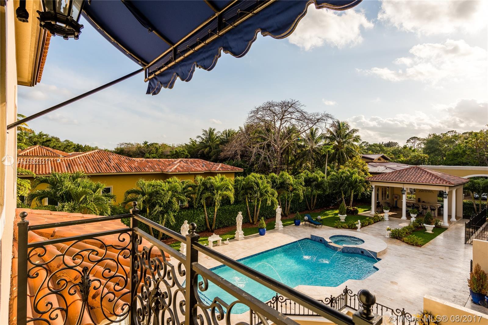 Elegant Mediterranean Estate. Situated on a pristine corner lot in N. Pinecrest. Upon entering this luxury estate, you will enjoy feature such as a exquisite flowing fountain, dramatic 2-story foyer & grand living room w/fireplace. This immaculate home features a open gourmet kit. w/top of the line appliances w/ breakfast area, cabinetry & granite counter tops, ornate crown moldings, coffered ceilings, summer kit., courtyard, large suite style bedrooms & grand master suite, marble & hardwood floors, balconies, large pool & spa, manicured grounds.