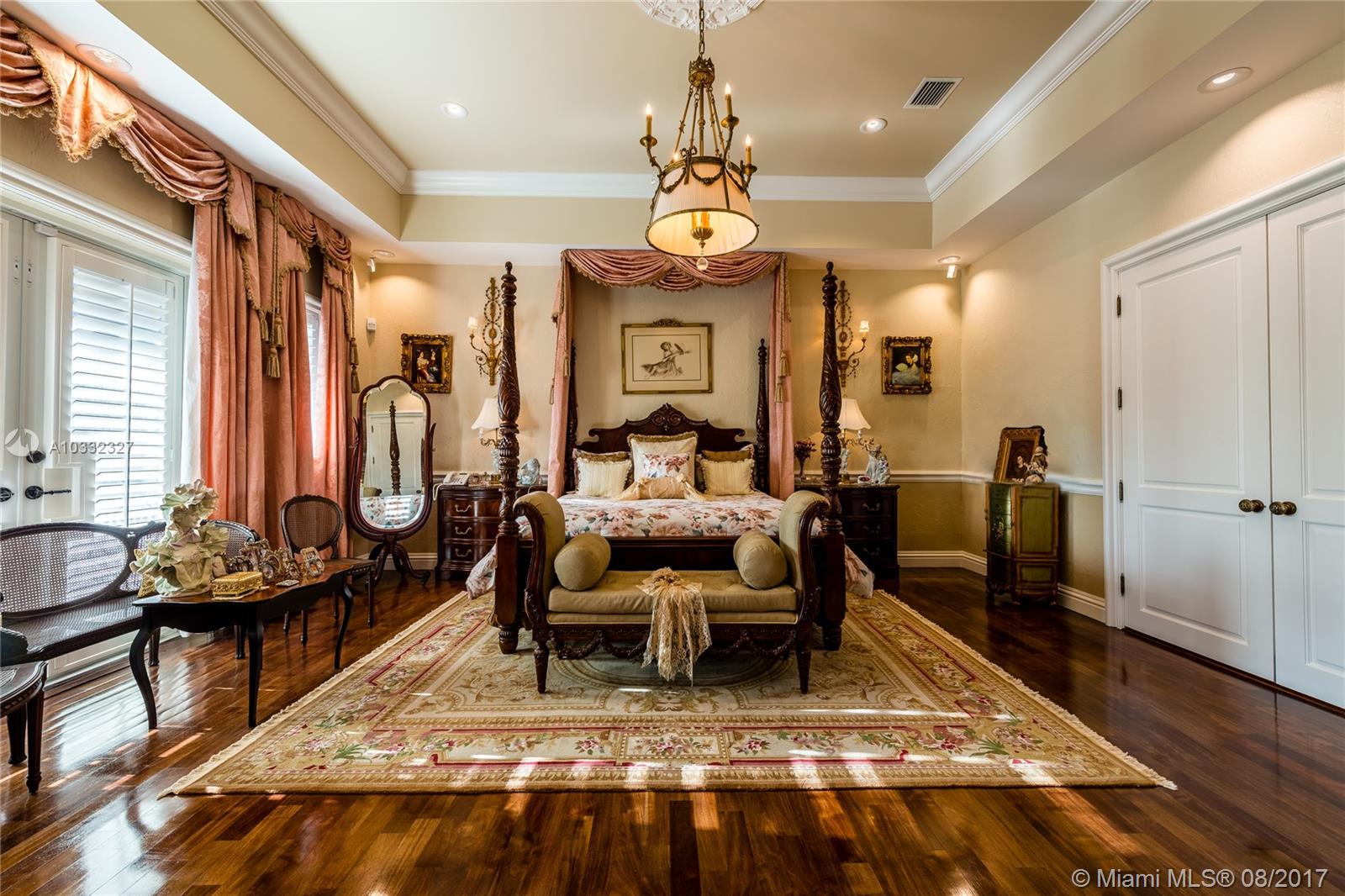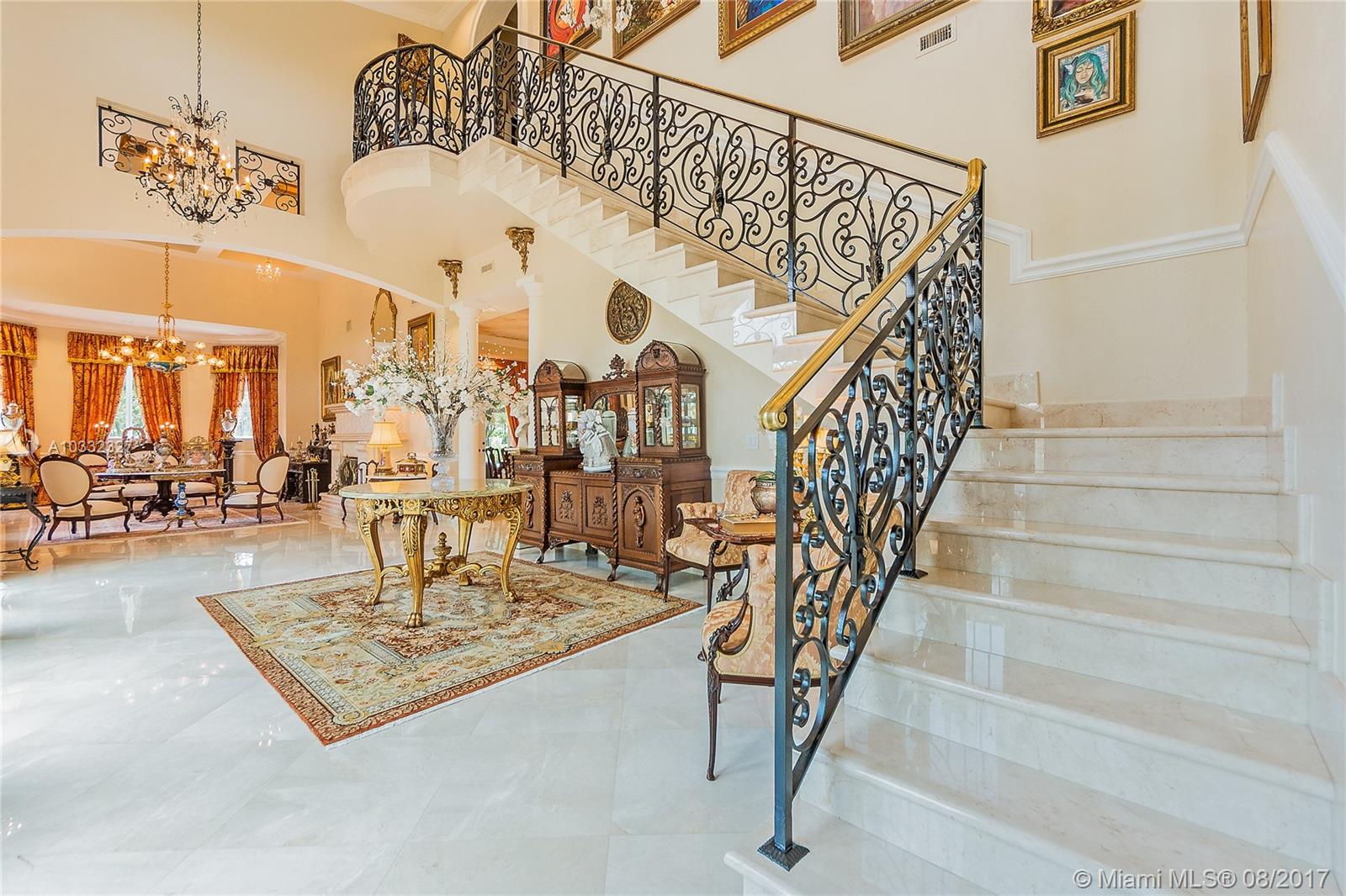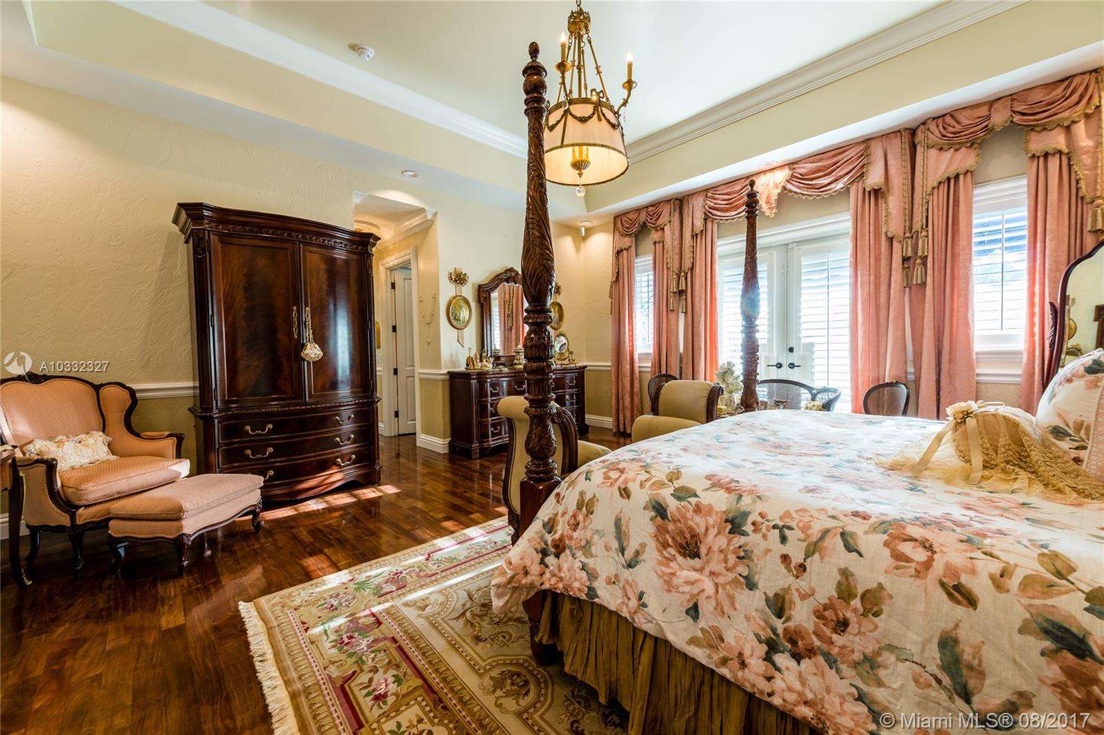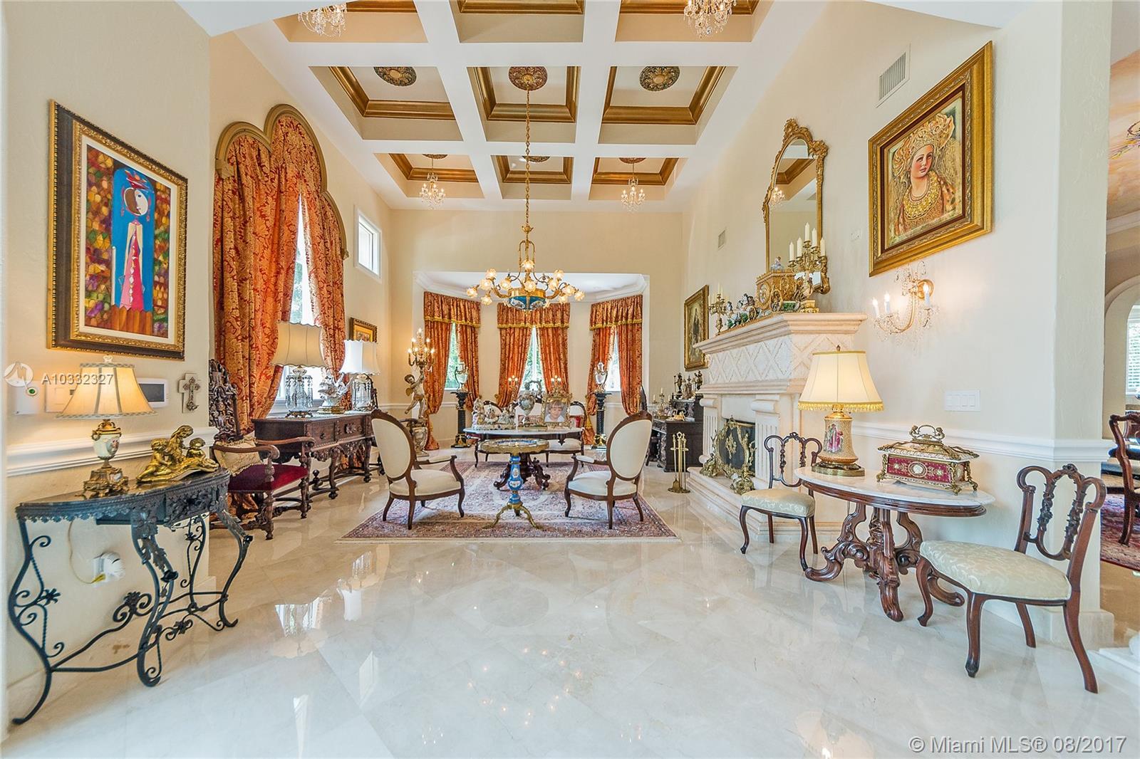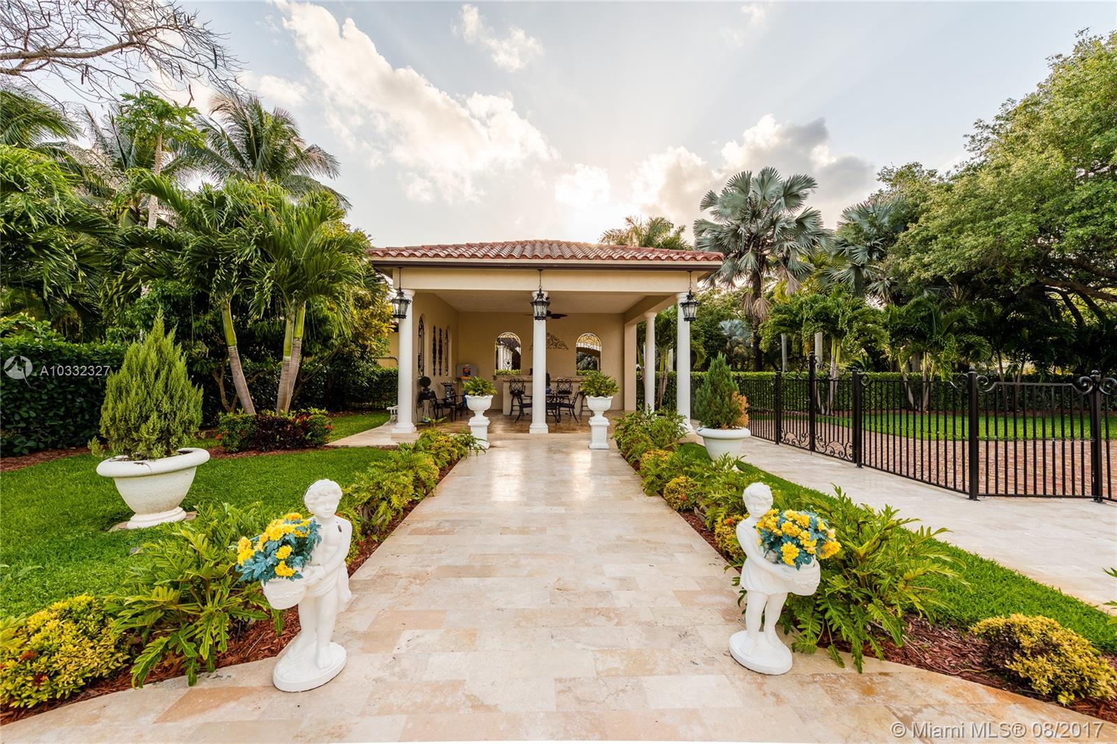 Elegant Mediterranean Estate. Situated on a pristine corner lot in N. Pinecrest. Upon entering this luxury estate, you will enjoy feature such as a exquisite flowing fountain, dramatic 2-story foyer & grand living room w/fireplace. This immaculate home features a open gourmet kit. w/top of the line appliances w/ breakfast area, cabinetry & granite counter tops, ornate crown moldings, coffered ceilings, summer kit., courtyard, large suite style bedrooms & grand master suite, marble & hardwood floors, balconies, large pool & spa, manicured grounds.