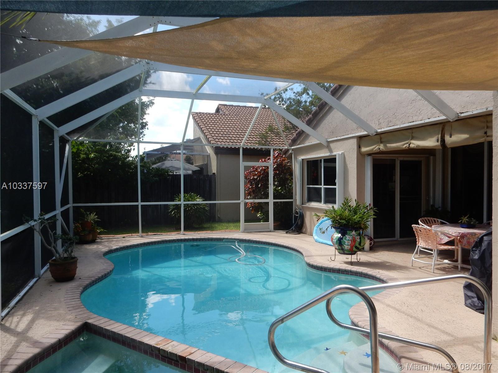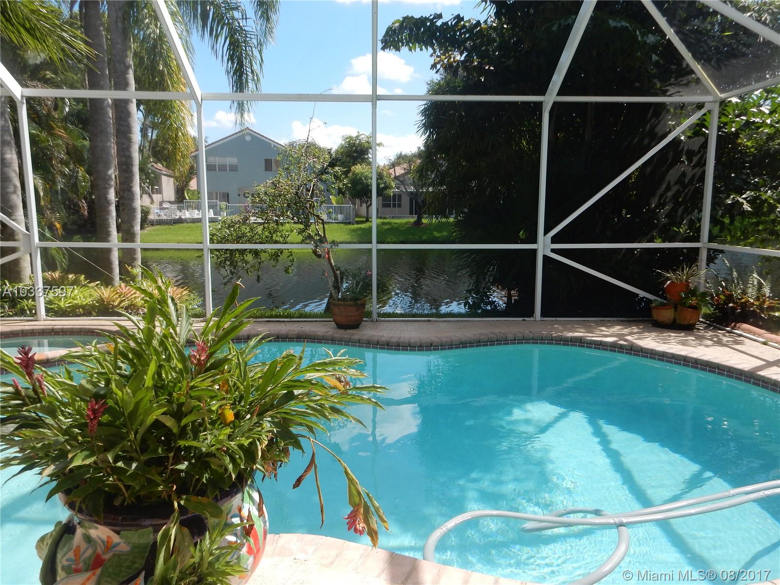 True pride of ownership shows in the clean spacious rarely available one story located on great culdesac location with great water views on private custom landscaped lot complete with heated pool & spa & accordion shutters. Great closets, 3rd bedroom being used as den/office with built ins, remodeled kitchen with white shaker cabinets & granite countertops. Master bath features double sinks, roman tub & separate shower. Enjoy the private serene setting in your screened patio while enjoying the heated pool & spa . This home features sun shade canopies, hurricane screening over covered patio, textured ceilings (no popcorn), Roof replaced about 10 years ago & exterior painted about 2 years ago. Enjoy great Bridgewater community with low maintenance, small clubhouse & 2 community pools.