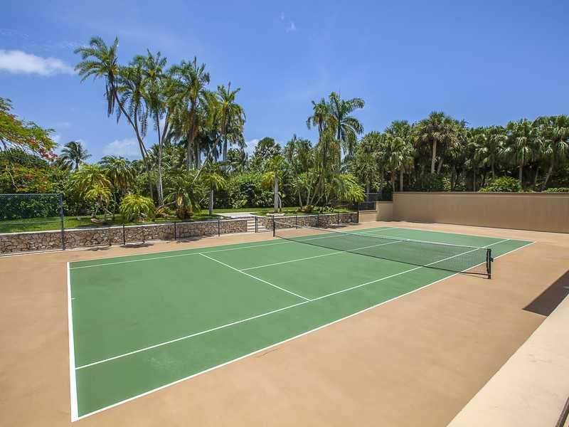Impressive & unique describe this waterfront property in prestigious guard gated Gables Estates. 1.6 acres of lush landscaped grounds lit tennis court & 300 feet of waterfront. Home features windows w/ views from almost every area of the home, woodwork, v ery light & open gourmet kitchen w/ beautiful views, Limestone floors, living room w/ 2 story windows overlooking waterway, generously sized family room w/ an inviting bar.Spectacular master suite with large sitting room, vaulted ceilings and breathtaking