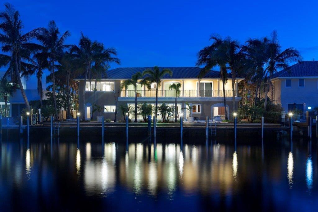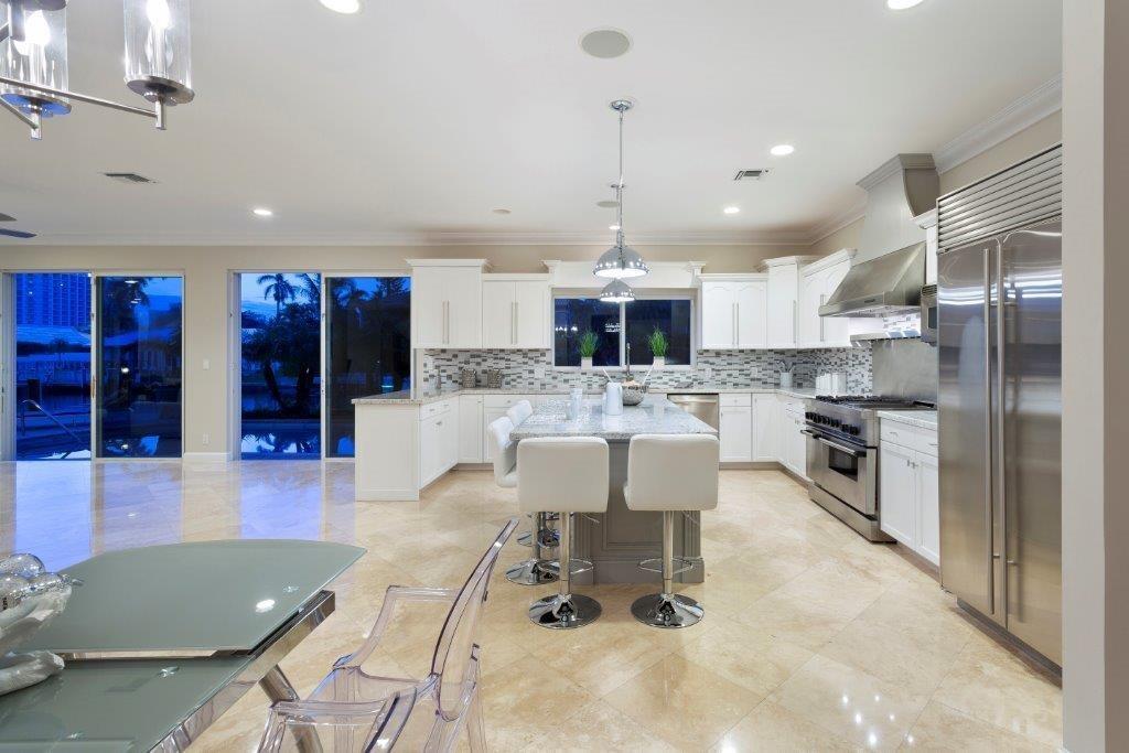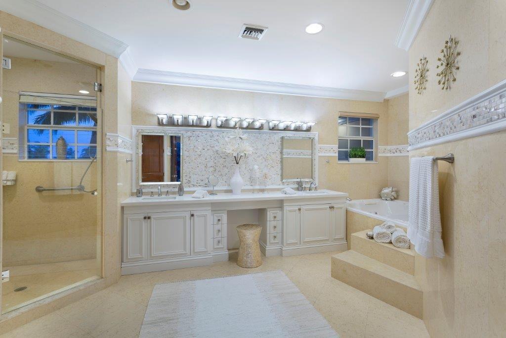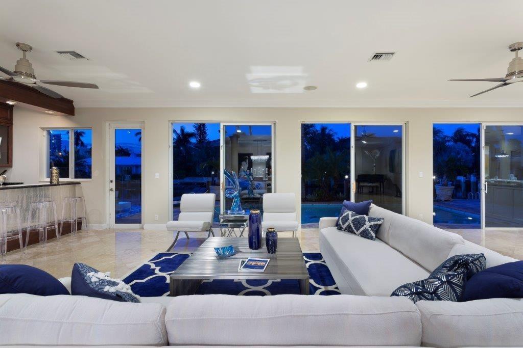 Looking south on 100+/- feet of deep-draft waterfront, this gated Modern Mediterranean estate is outfitted with full-length yacht dockage. The palm-studded grounds feature a full-length waterside terrace that surrounds the sun-splashed saltwater pool as a beautiful outdoor entertainment space, served by a full cabana bath. Two gated entries give way to the property's tropically landscaped motor court leading to the formal entry and garages on either side, with a total of four bays.