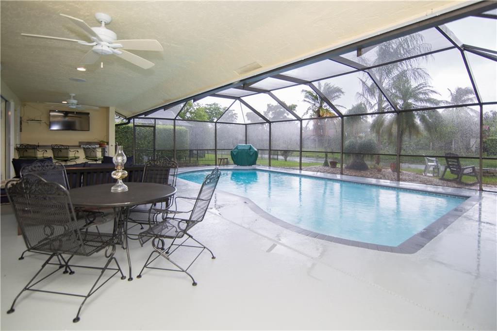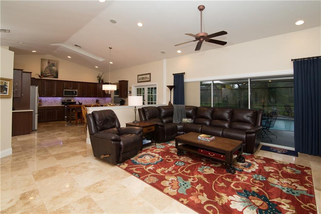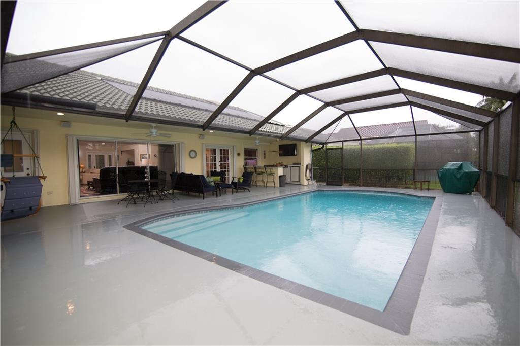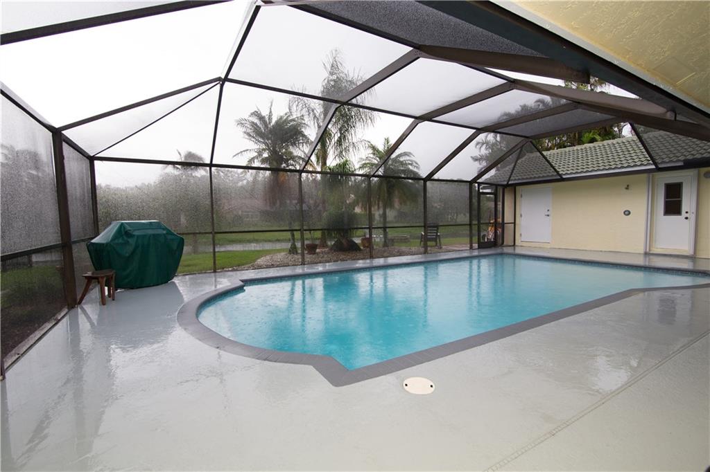 Beautiful waterfront home located in a guard gated community. This remodeled home features a circular drive, 2015 A/C, Travertine marble floors in living areas & rich laminate flooring & carpet in the bedrooms. Gorgeous skylights in kitchen with wood cabinets, quartz countertops & tumbled marble backsplash. Newer upgraded appliances. Beautiful dining room features built in cabinets, granite tops & wine cooler. Both baths updated in 2015. Bonus storage/work room. Solar heated screened pool with new finish!