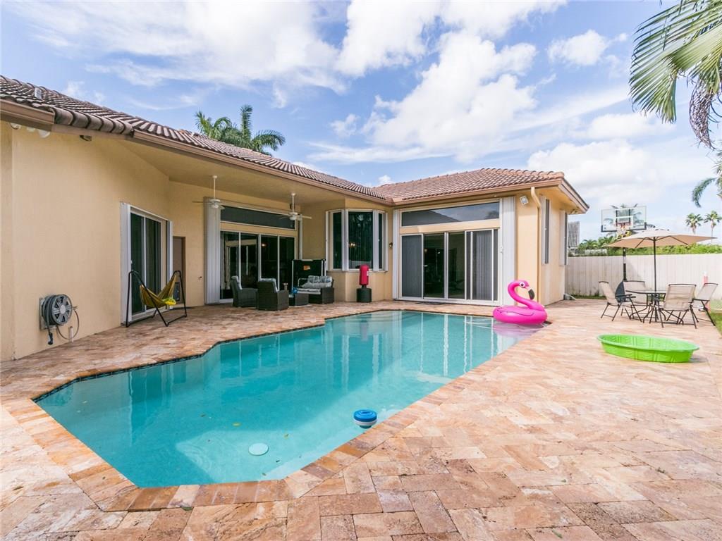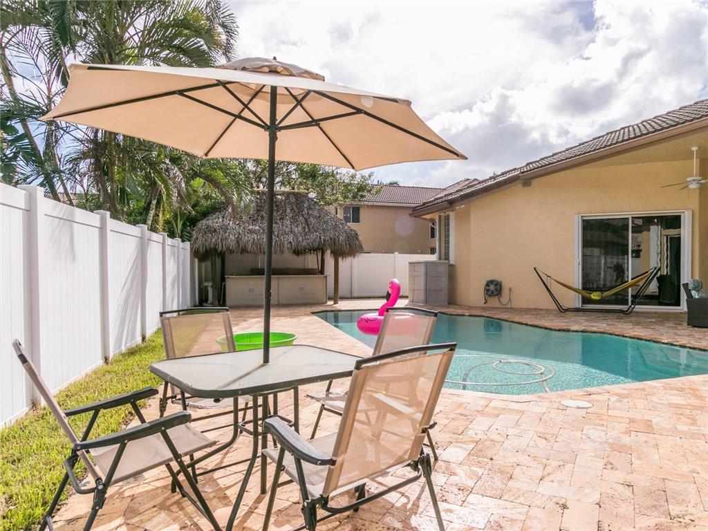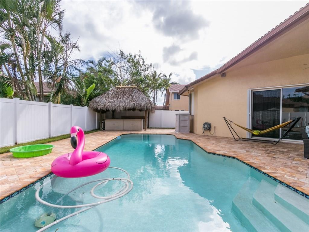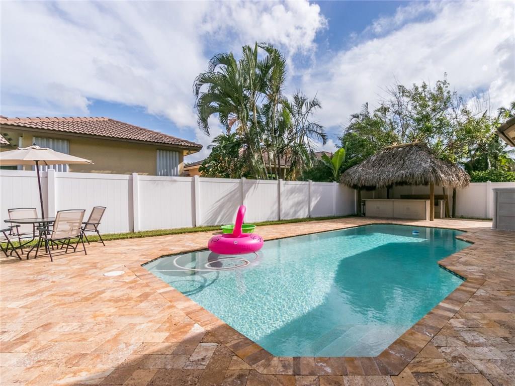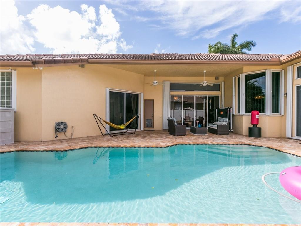 Immaculate Pool Home in Sunset Pointe Gated Community. Beautiful Remodeled Home with 5 Bedrooms and 3 Full Bathrooms. Master Bedroom with Walk-in Closets and Double French Doors to Backyard. Master Bath with Opposite His/Her's vanity, tub, and Walk-in Shower. New Contemporary Kitchen with Wood Cabinets, Granite Counter Top and Stainless Steel Appliances. Accordion Hurricane Shutters. Large backyard with pool, Tiki Bar and private fully fenced yard, circular driveway. Located in an excellent school area.