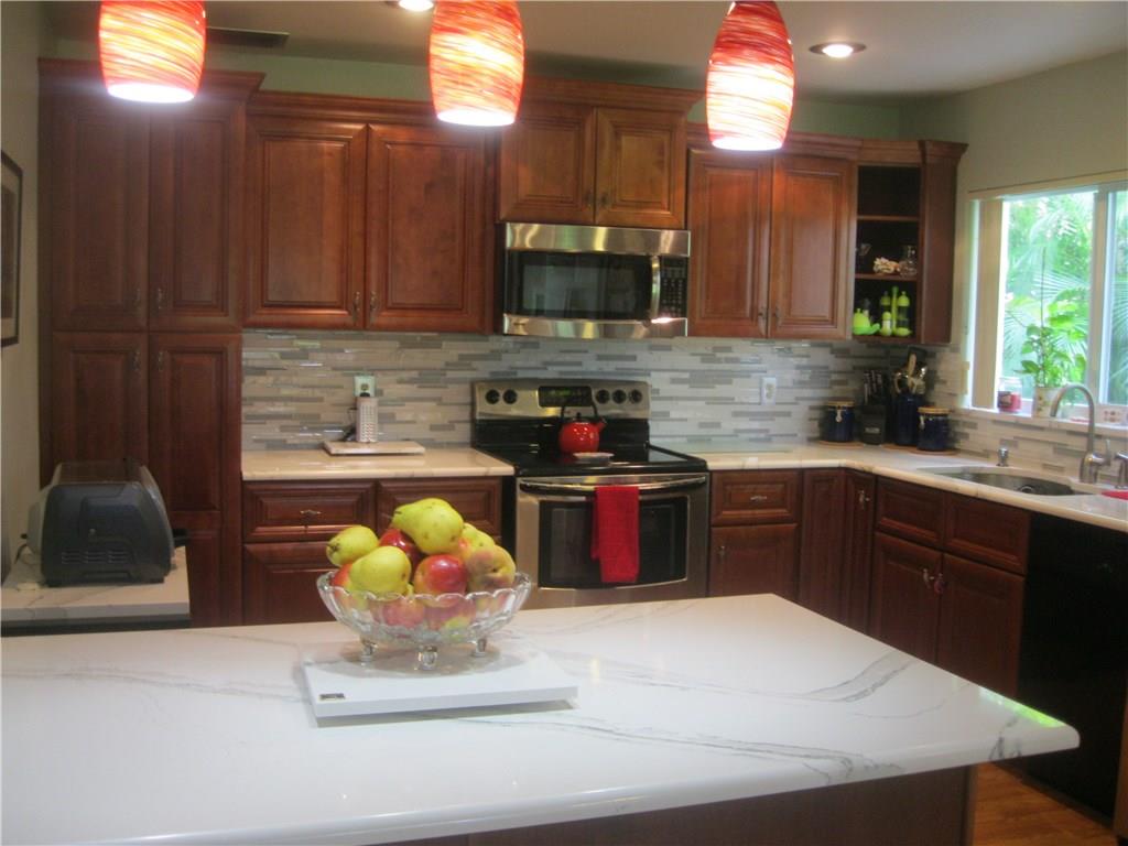 New roof being installed within two weeks. Gorgeous remodeled kitchen with wood cabinets and quartz counters. stainless appliances, laminate floors throughout.Full three bedroom and two bath with den. Newer 4 ton a/c 2016, storm reinforced 2 car garage door ,brick paver driveway, . Hurricane impact windows. Covered back patio. Truly must be seen to appreciate. Some furniture negotiable. Beautiful park view. Association says 55+.