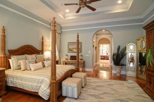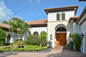 As you drive up the huge circular paver driveway you'll notice the professionally landscaped island with a large fountain. The professional landscaping on the entire 1.13 acre lot is in keeping with the quality and design of this 6,341 sq. ft. (under air) estate home. It is situated directly on a lake with beautiful views of the PGA Estate Golf Course. Upon entering through the solid oak doors, you will be drawn to the polished marble floors. Bedrooms and office have pecky cypress hardwood floors. A large living room with 16 ft. Palladian windows, gas fireplace and magnificent crystal/wrought iron chandelier welcomes you as the tour begins. The office is in a separate wing and has extensive built-in shelving, partner desk and coffered ceiling....con't.