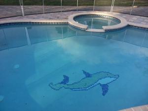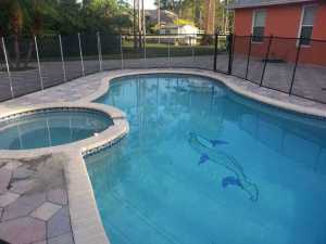 Remodelled CBS Pool home with 4 bedrooms 2 baths and 2 car garage converted into den/playroom This home boasts all ceramic tile floors except wood laminate in the den, wood kitchen cabinets with granite counters and stainless appliances, wired for built in surround sound system, cathedral ceilings in the living areas, large brick paver driveway with walkways around the house to a covered patio and very large open pool area with spa and waterfall