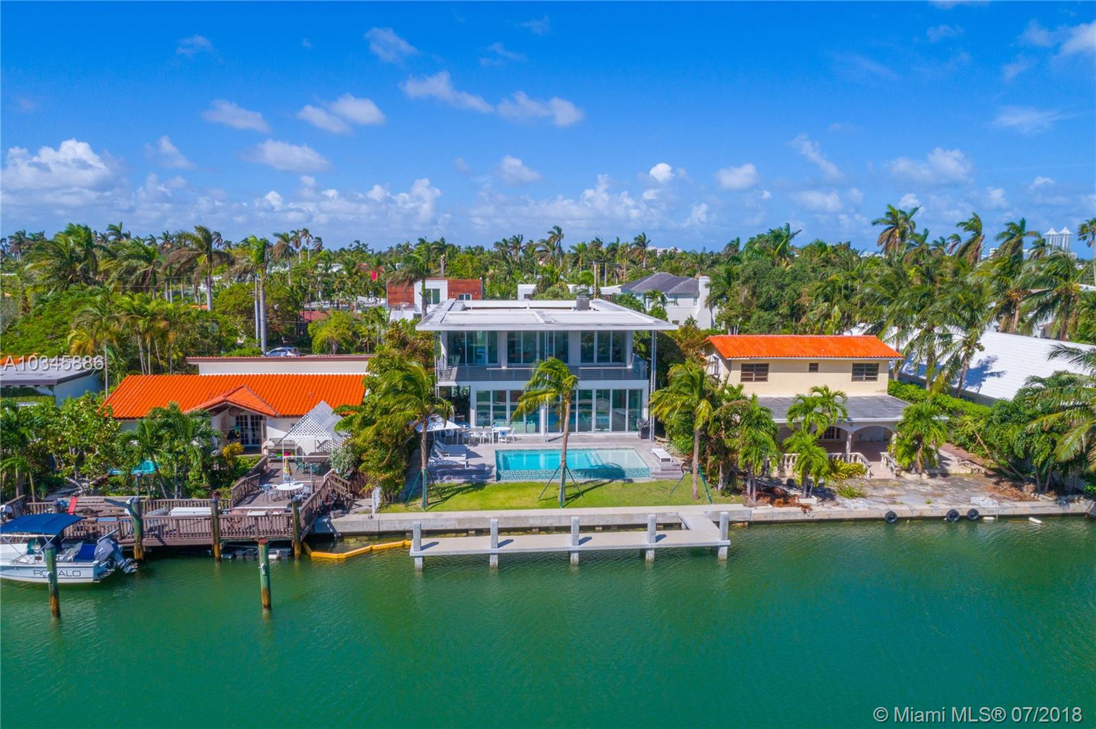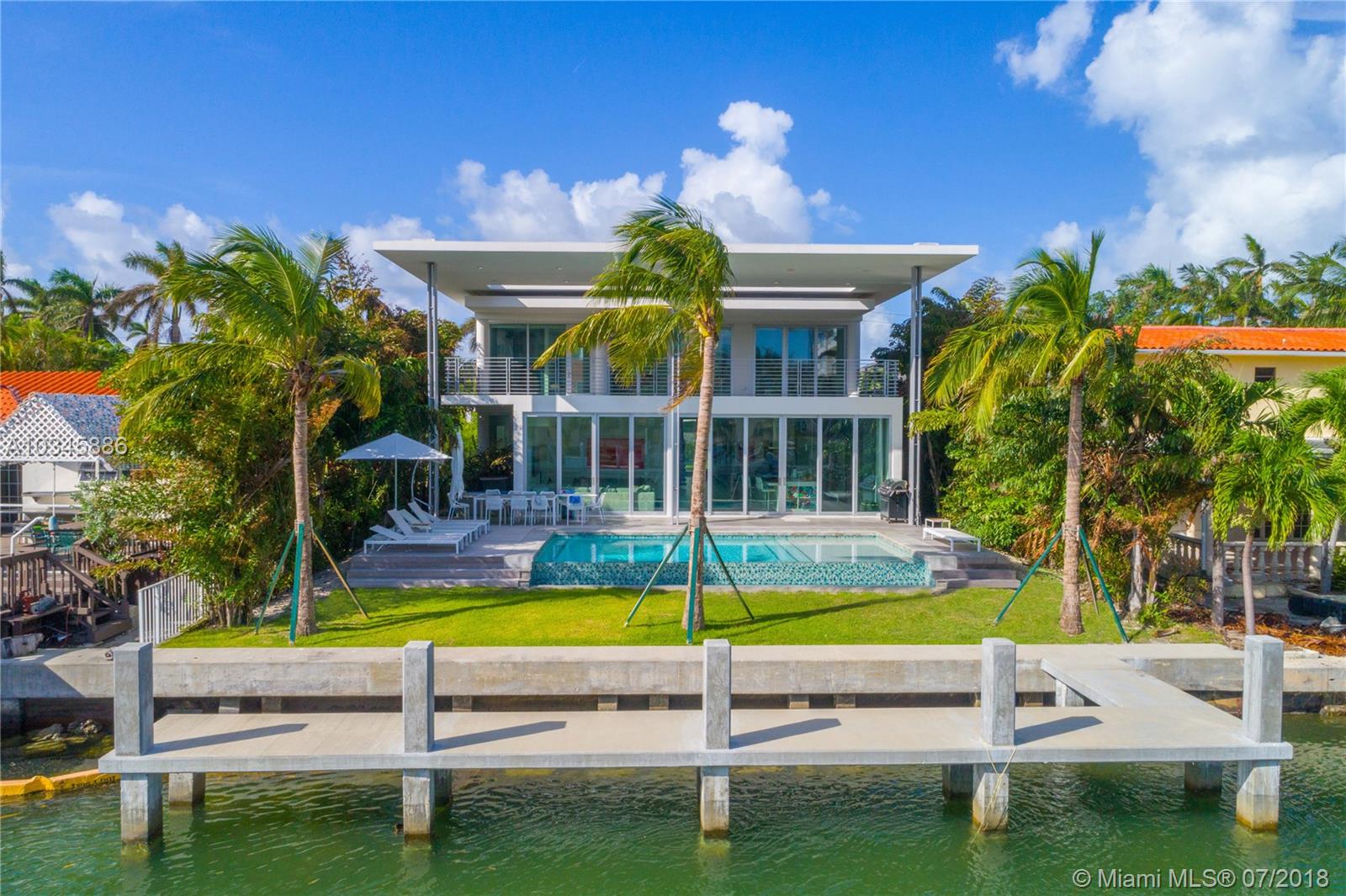 Built in 2015, this newly constructed modern home is listed as the lowest priced waterfront property on Sunset Island! Southern exposure flooding the home with sunlight throughout the day, this 4 bed / 4.5 bath residence boasts 10’ floor to ceiling glass, top-of-the line finishes, dark oak floors and a 5,200 SF open floor plan. Interiors complimented by Arclinea kitchen cabinets and Gaggenau appliances surrounding a dramatic floating stairway leading to the second floor master-suite which is home to an impressive oversized terrace. The exterior is completed with a beautiful infinity edge pool and a brand new 40’ concrete dock. All just a minute’s walk to the shops, restaurants and nightlife in the popular Sunset Harbour neighborhood.