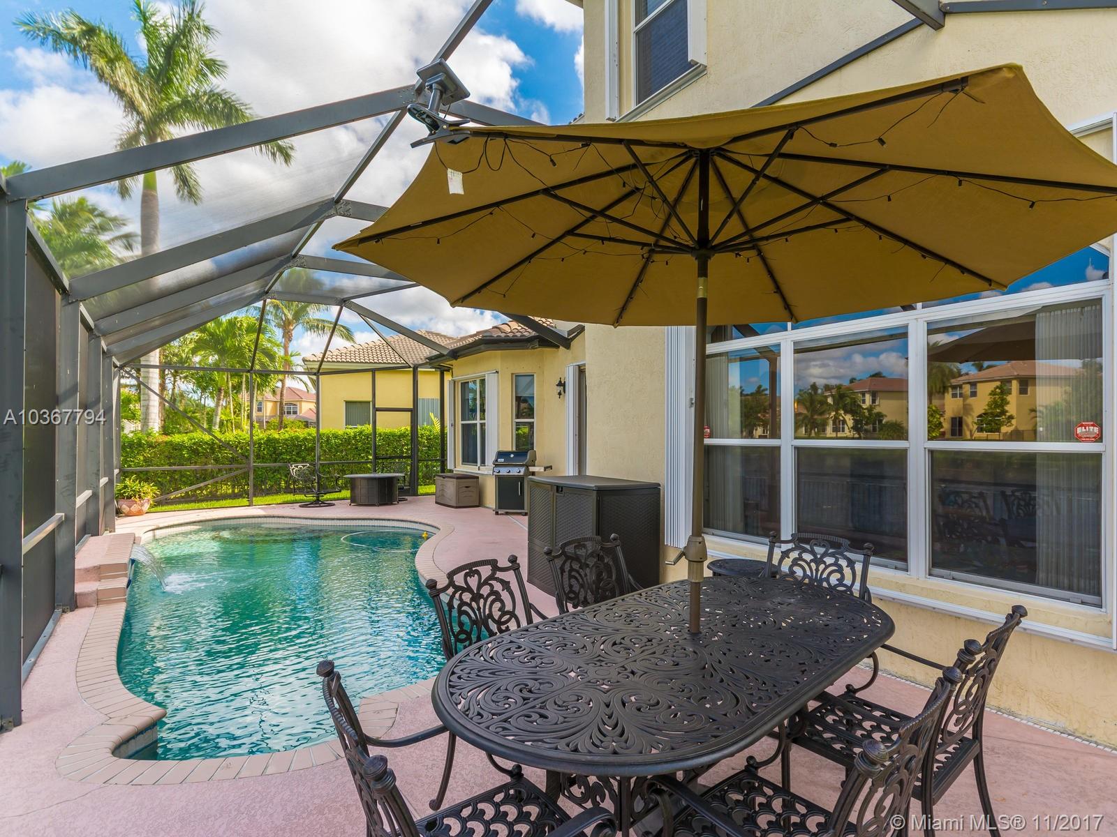 Magnificent home in a gated community! Enter through the lavishly landscaped front yard, large windows through out provide ample light in the massive living areas. Beautifully flowing floor plan & vaulted ceilings. Large Island kitchen in the center of the home, boasting wood cabinets, granite counters, new appliances & a butler's pantry. Most desirable model w/double master suites, one on each floor! Master bedroom includes a large sitting area & a grand bathroom suite w/walk-in closet. Separate laundry room & half bathroom conveniently located on the first floor. Fantastic backyard complete with a screened in pool on a wide lake, perfect place to entertain. Hurricane shutters included. Fourth bedroom currently configured as an open office/den. Look no more!