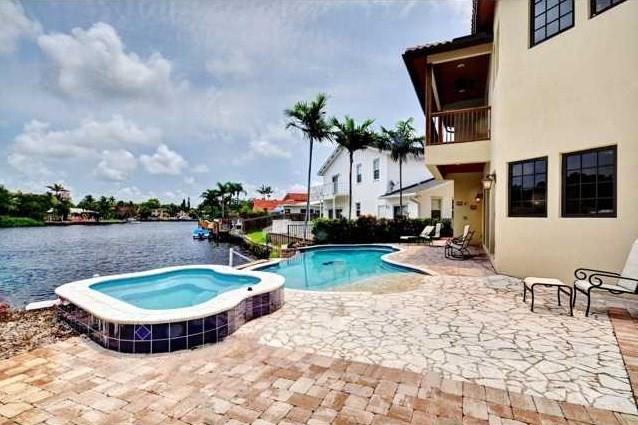 Stunning Mediterranean Waterfront home. Upstairs & Downstairs family rooms, grand staircase, volume ceilings, water filtration throughout the whole house. Heated, saltwater infinity pool. 2 bedrooms downstairs, 3 bedrooms upstairs. Nice appliances, Italian wood cabinets, gas cooktop, wine cooler, mini bar. Very large master bedroom with balcony and long water views.
