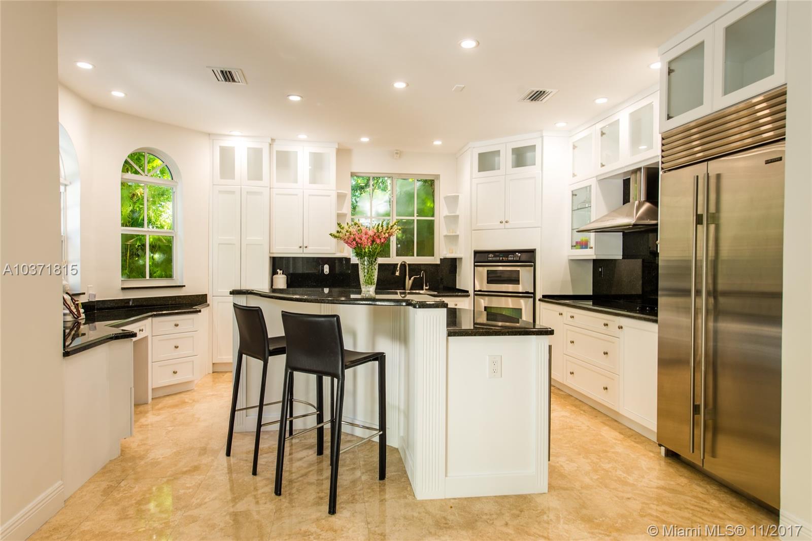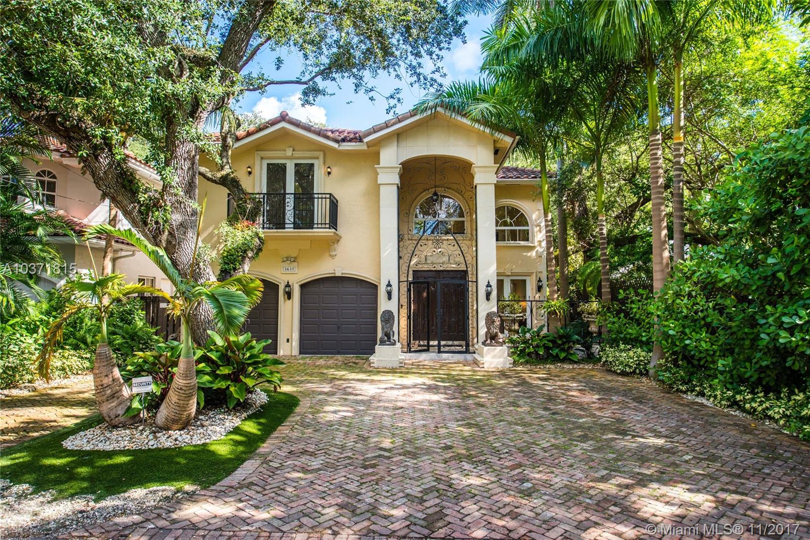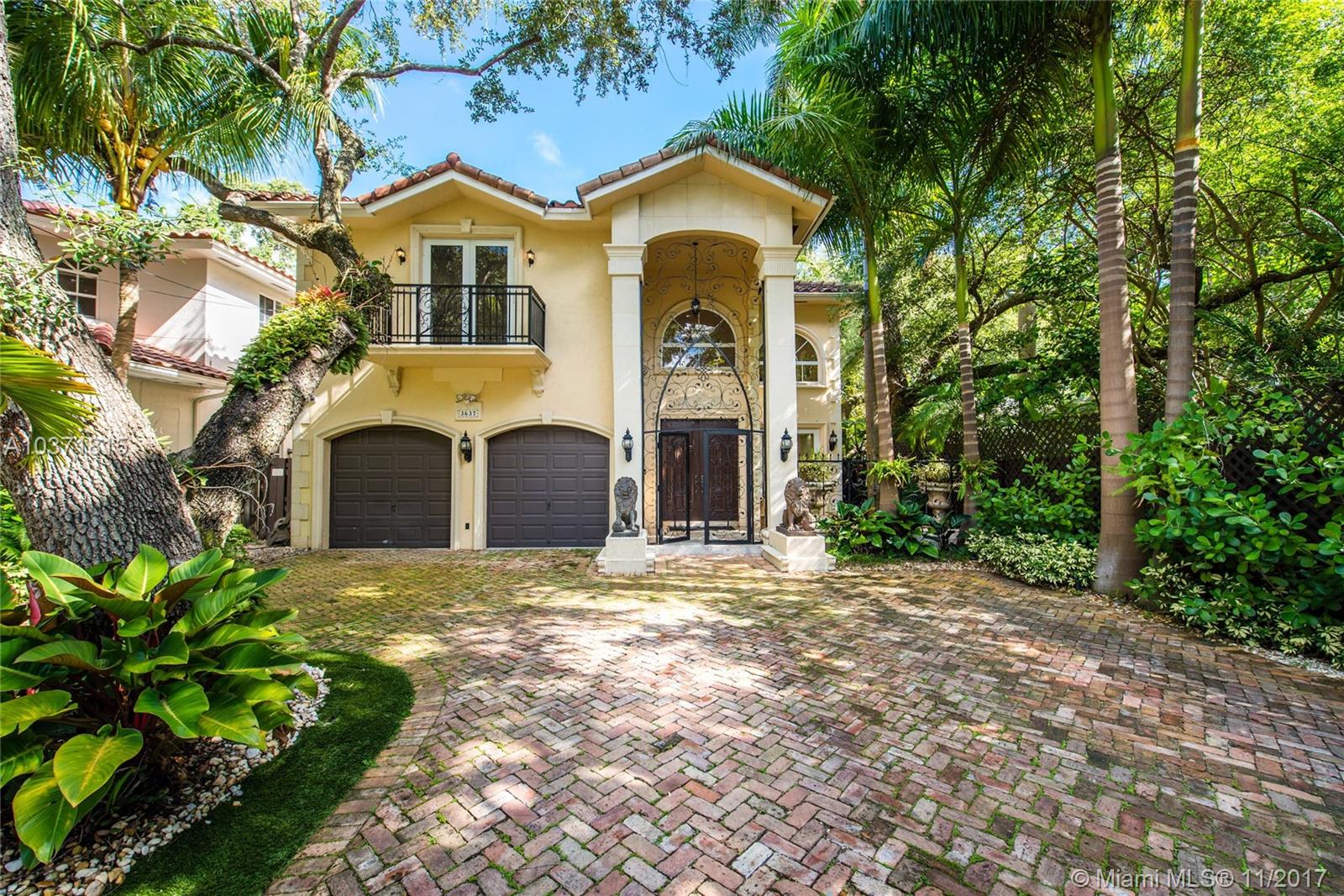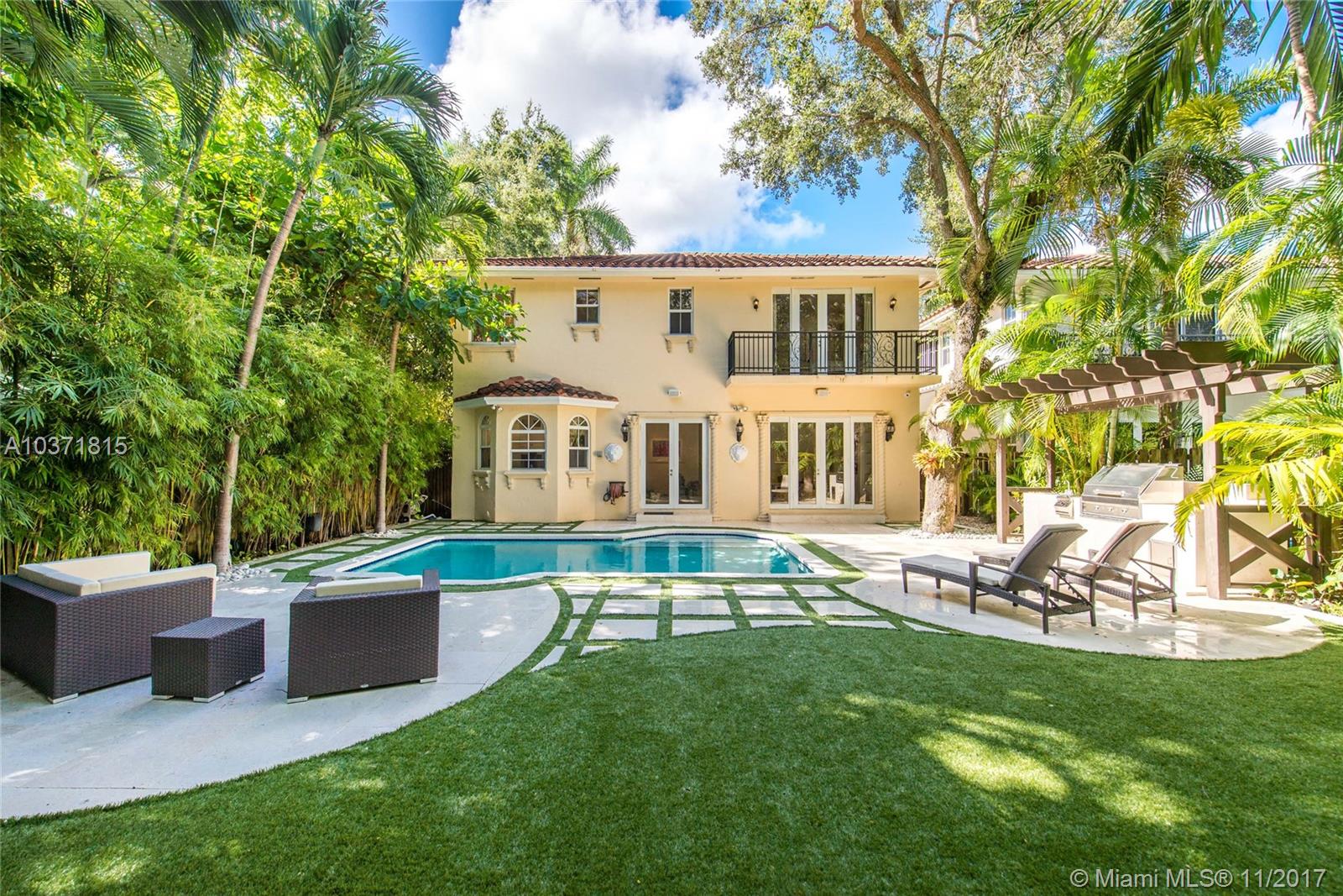 Lovely European-inspired home on a quiet, winding street in lush South Coconut Grove. A blend of classic and contemporary architectural features with light-filled living spaces that overlook the expansive garden with built-in grill area & pool. Custom kitchen with white wood cabinetry, granite countertops, stainless appliances and center island with seating. Double-height ceilings and clerestory windows in the formal living & dining room. Oversized master suite with sitting area and private balcony overlooking the tree-tops. Luxurious marble master bath with spa-tub & glass enclosed shower. Walk to the Grove village center’s galleries, boutiques, cafes and bayfront parks & marinas. Close to downtown, MIA, Coral Gables and the Beaches.