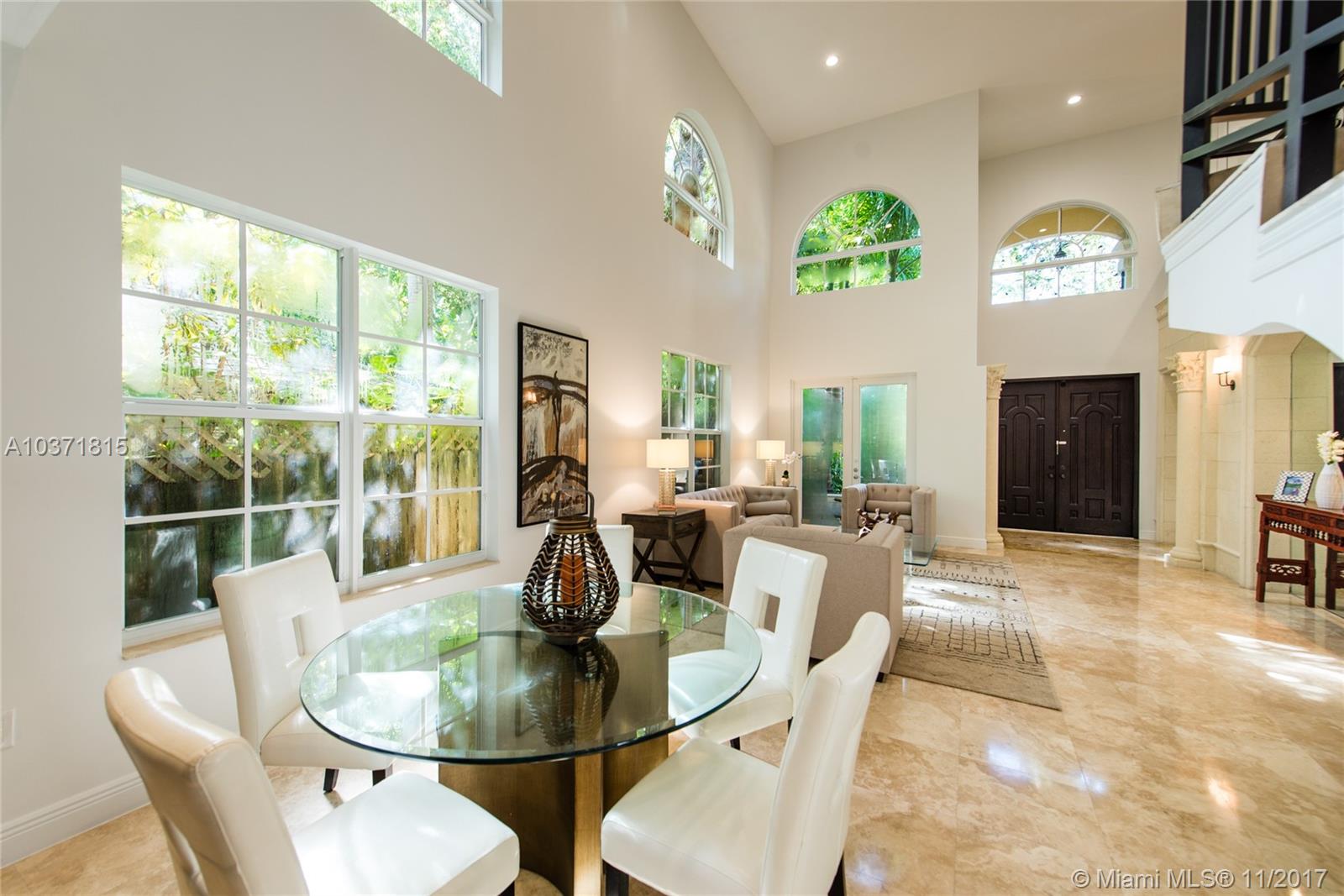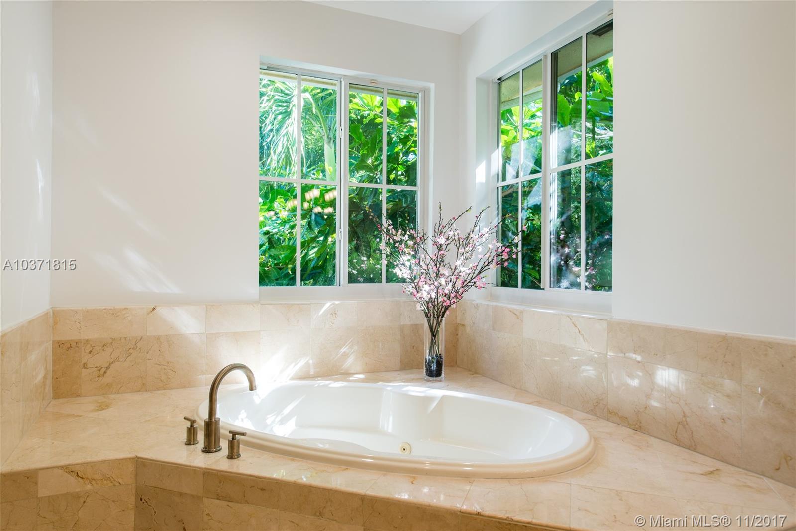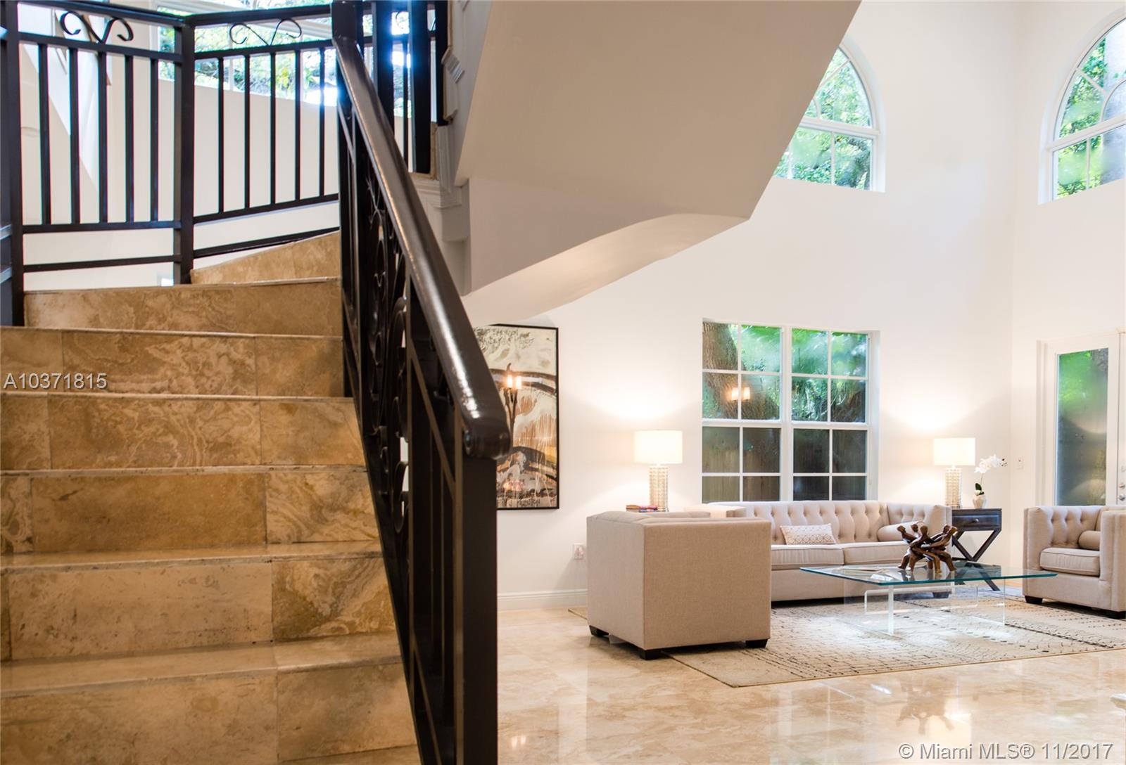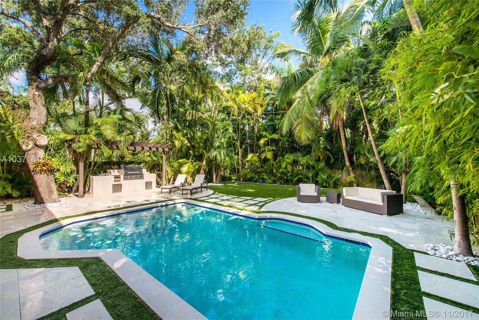 Lovely European-inspired home on a quiet, winding street in lush South Coconut Grove. A blend of classic and contemporary architectural features with light-filled living spaces that overlook the expansive garden with built-in grill area & pool. Custom kitchen with white wood cabinetry, granite countertops, stainless appliances and center island with seating. Double-height ceilings and clerestory windows in the formal living & dining room. Oversized master suite with sitting area and private balcony overlooking the tree-tops. Luxurious marble master bath with spa-tub & glass enclosed shower. Walk to the Grove village center’s galleries, boutiques, cafes and bayfront parks & marinas. Close to downtown, MIA, Coral Gables and the Beaches.
