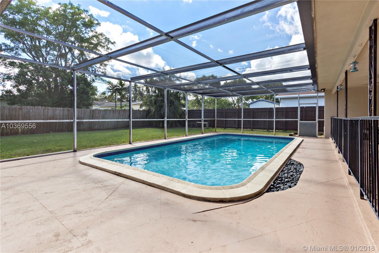 Beautiful 3 Bed, 2 Bath, 2 Car Garage Single Family Home with Pool on a Large Fenced Lot. Beautiful Open Custom Kitchen with Wood Cabinets, Granite Countertops, Stainless Steel Appliances and Breakfast Bar. Kitchen Window Overlooks Screened Pool and Patio Area, Large Open Floor Plan with Living, Dining, and Family Rooms. Large Master Suite Features New Bathroom w/Double Sinks, Frameless Shower Enclosure. Updated Hall Bath with Granite Countertop, New Tile Throughout Home, Newer Plumbing, Newer A/C, Newer Hot Water Heater, Newer Washer/ Dryer, Upgraded Electric Panel, New Pool Pump, Flat Tile Roof, Fenced Back Yard with Plenty Of Space Beyond The Screen Pool For Entertaining. Hurricane Shutters. Large Circular Drive Way, Side Parking, Must See!