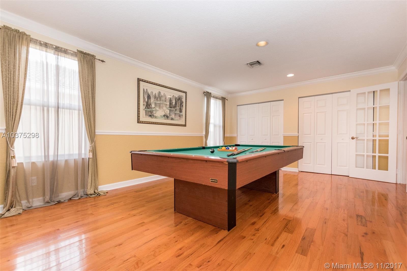 Turn Key Violet model with upgrades galore. Tucked on a quiet lakefront lot, fully fenced and privacy hedged with oversized 36x18 custom pool, paver patio and full length overhang for your comfort. Enter this decorators delight with warm real wood floors flowing through the living areas. House transformed in 2010. Marble flooring in the gourmet kitchen with upgraded 42 inch wood cabinetry, granite countertops, wall oven, Stainless Steel appliances. French doors to private yard. Full bed and 2 baths first floor (cabana) perfect as an in-law suite. All wood floors up with wrought iron dual stairs. Loft converted to playroom with closets. All bathrooms renovated. Oversized master bedroom with sitting area. New A/C(2010) and hot water heater.Extensive crown moldings. Accordion Shutters