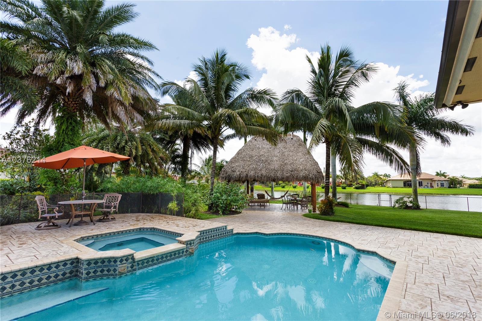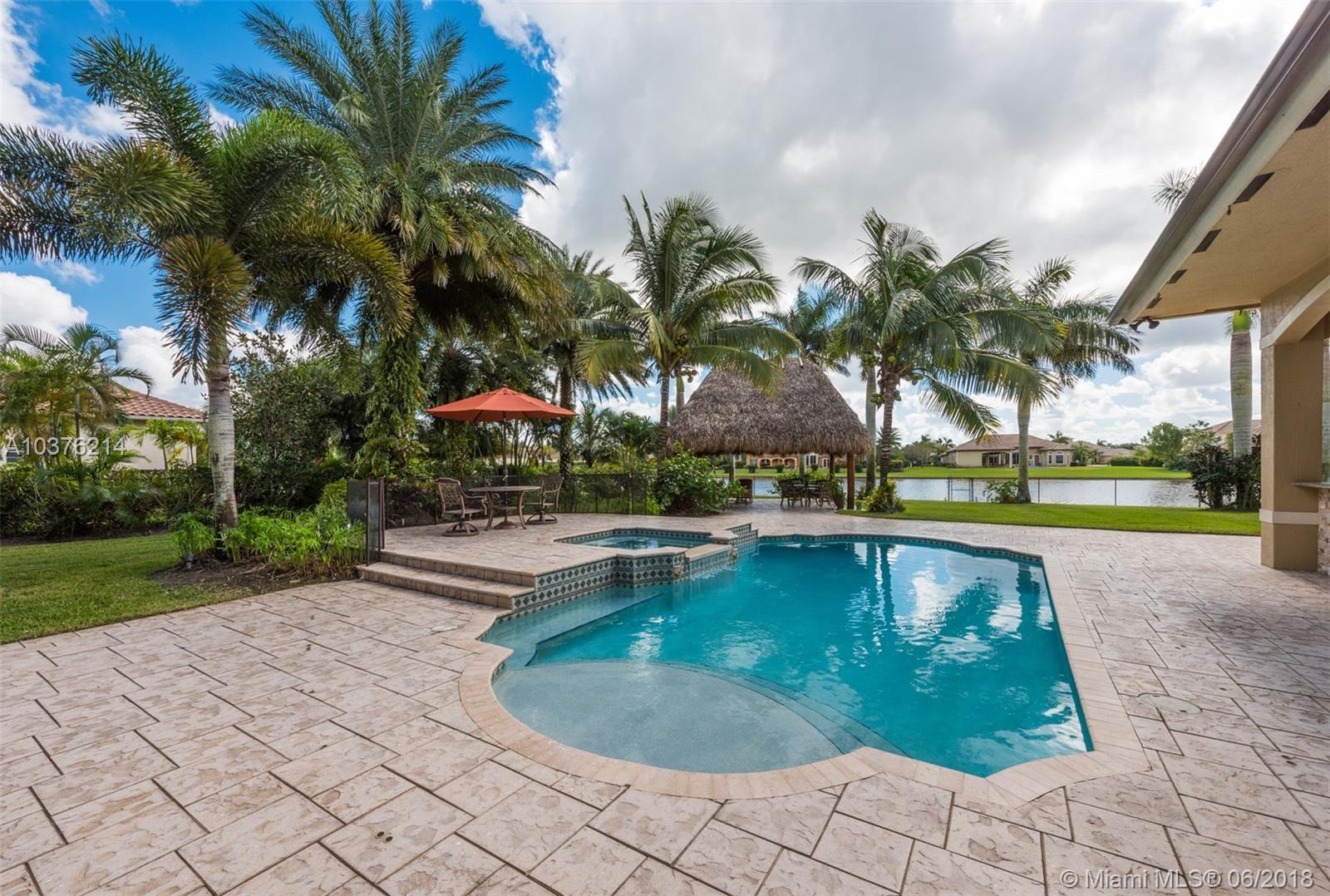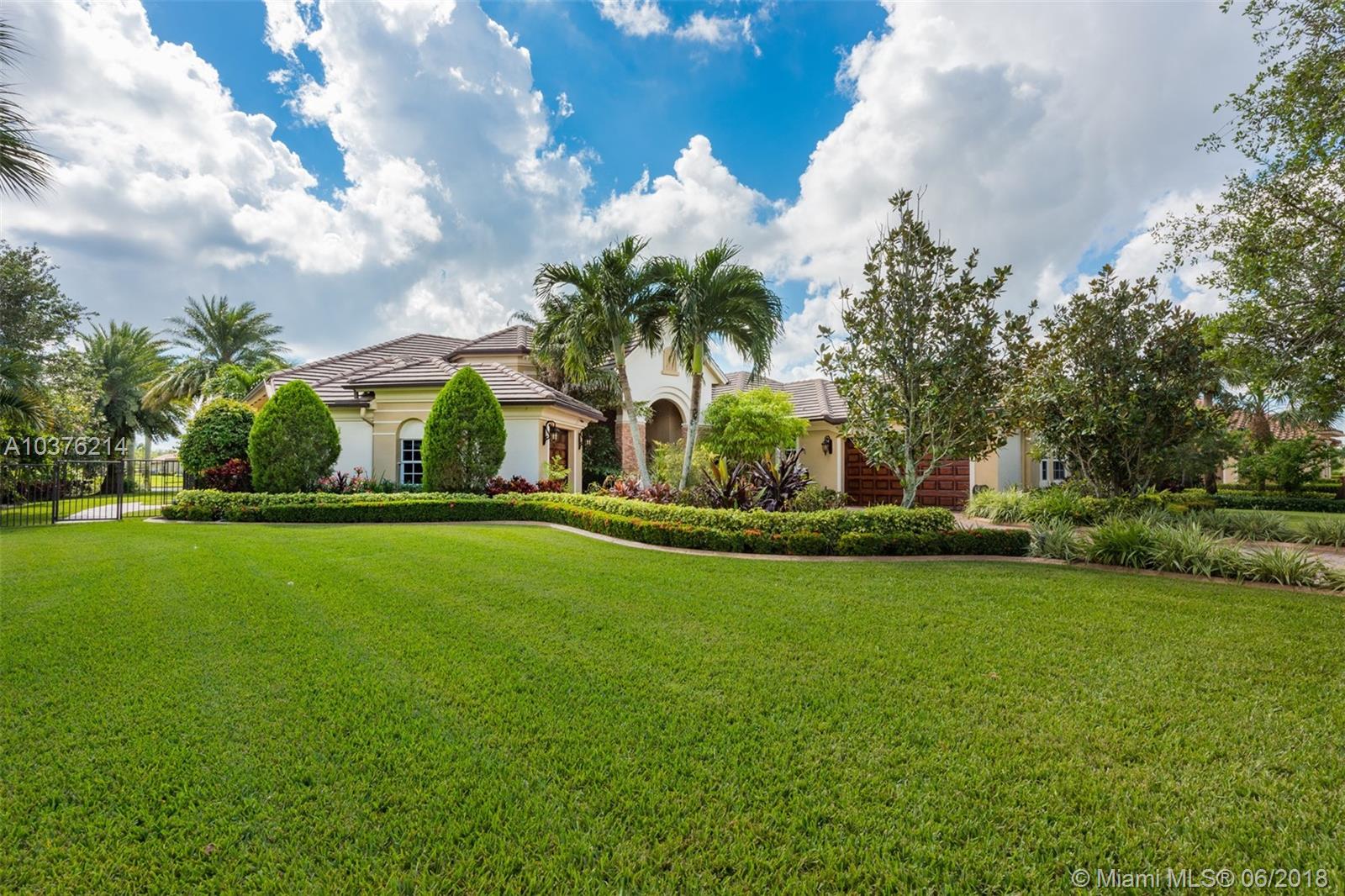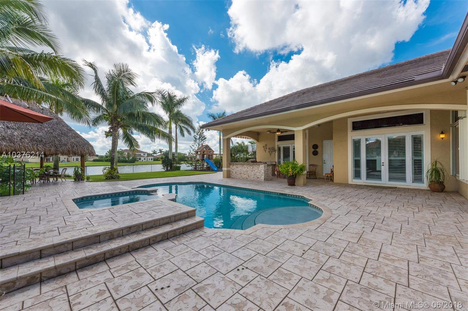 Magnificent 6 bedroom 4 bath lakefront estate located in the prestigious Woodbridge Ranches in Davie. Wide open entranceway with peaceful lake views. Home features private master suite wing, porcelanato floors in living areas, gourmet kitchen with wood cabinetry and exotic granite countertop, top of the line appliances, custom California closets, volume ceiling, front and back impact windows and living room with wet bar. Backyard is professionally landscaped with resort style heated pool with jacuzzi, summer kitchen and recently redone 20x20 Tiki. This pristine lake front estate with its gorgeous inside and outside spaces was designed for family living and entertertaining.