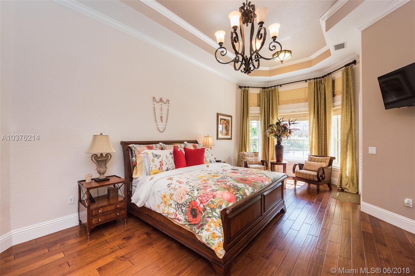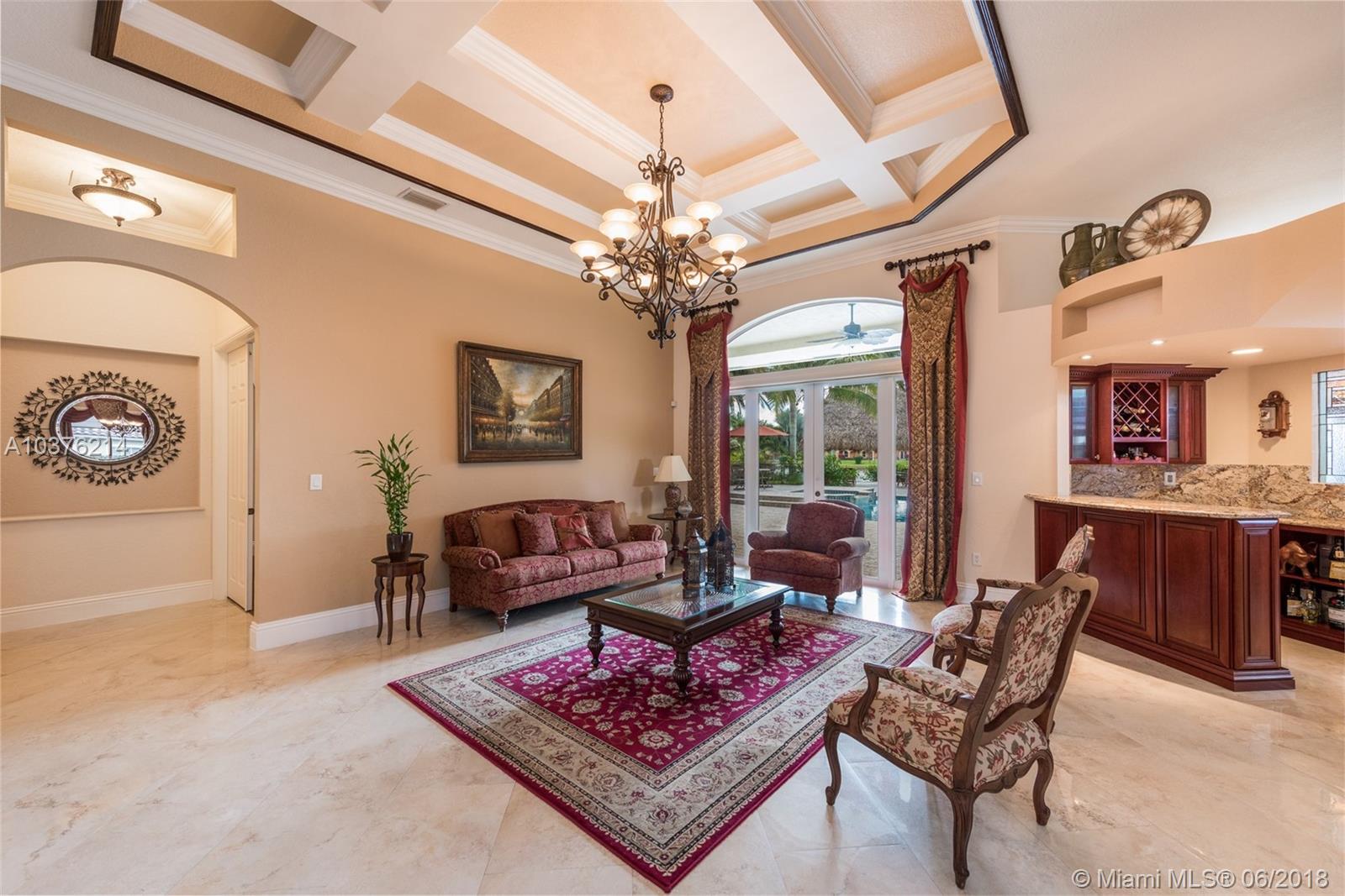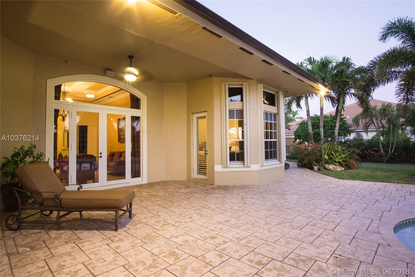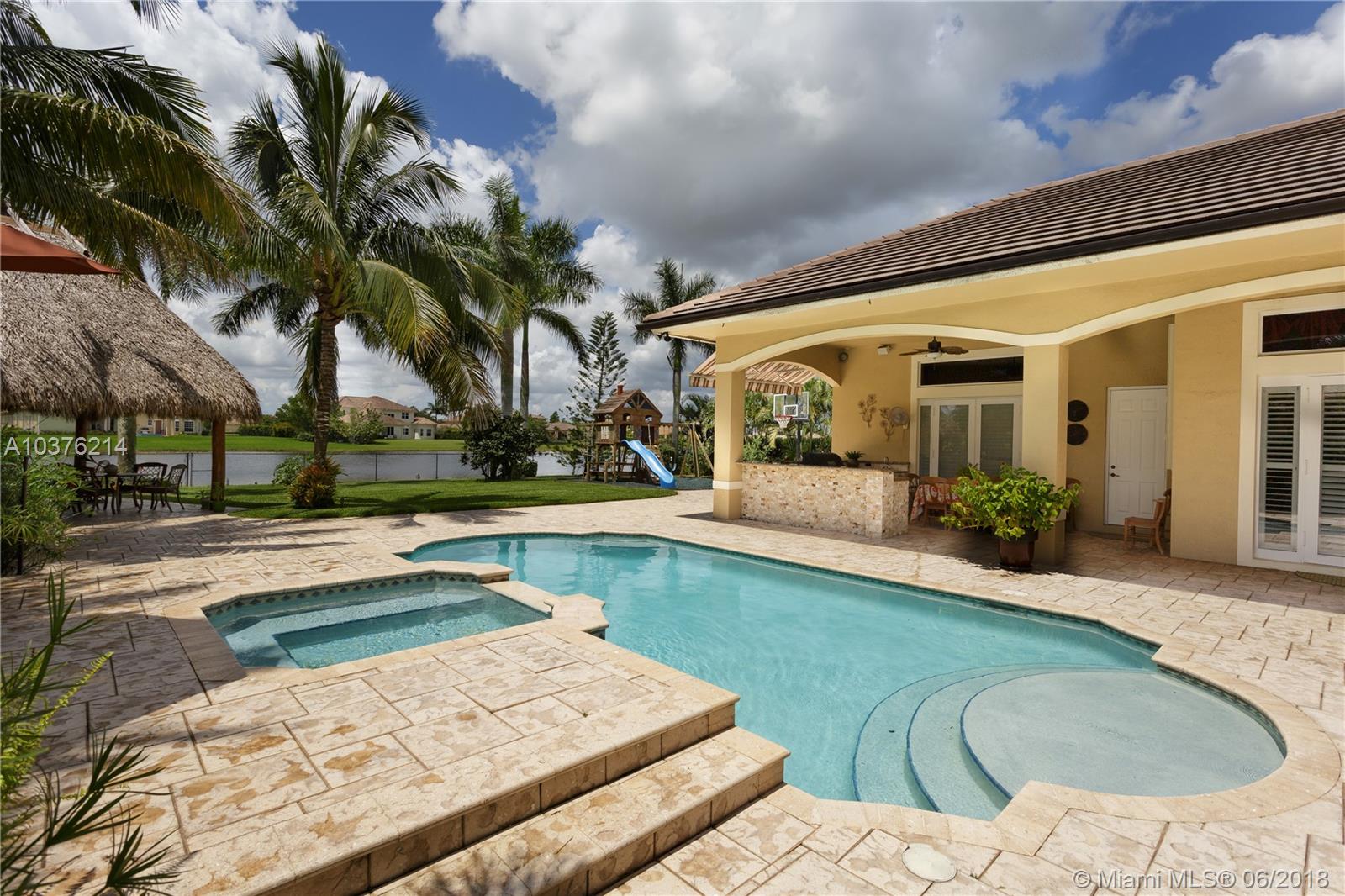 Magnificent 6 bedroom 4 bath lakefront estate located in the prestigious Woodbridge Ranches in Davie. Wide open entranceway with peaceful lake views. Home features private master suite wing, porcelanato floors in living areas, gourmet kitchen with wood cabinetry and exotic granite countertop, top of the line appliances, custom California closets, volume ceiling, front and back impact windows and living room with wet bar. Backyard is professionally landscaped with resort style heated pool with jacuzzi, summer kitchen and recently redone 20x20 Tiki. This pristine lake front estate with its gorgeous inside and outside spaces was designed for family living and entertertaining.
