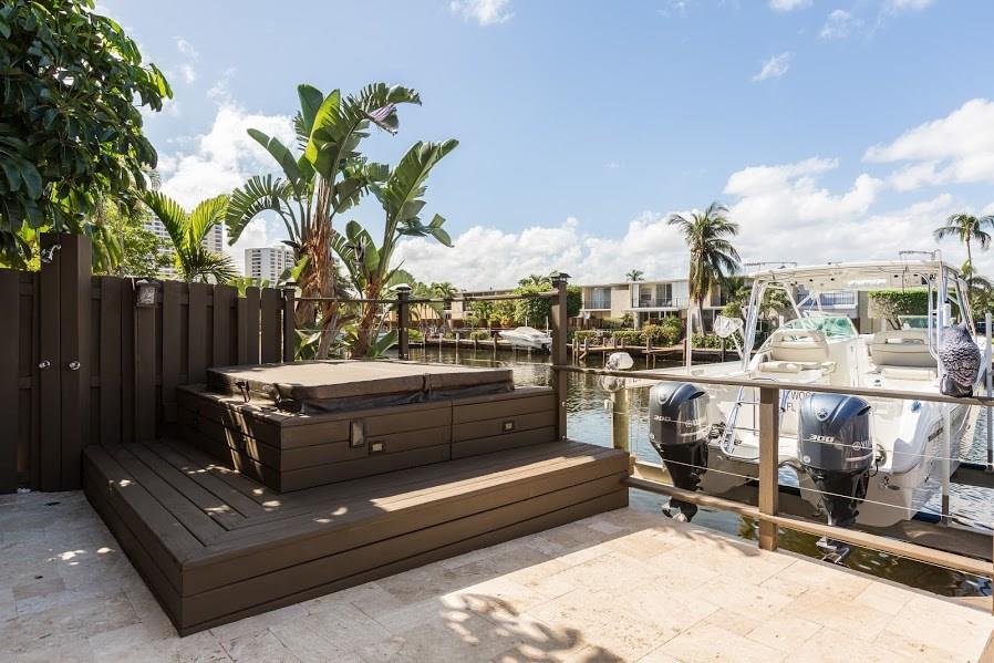 Waterfront model townhome in East Hallandale. Easy walk or bike to beach. Renovated 3 bedroom townhouse featuring a boat lover's dream at a fabulous price. The oversized deck patio has a spa Jacuzzi hot tub, summer kitchen wiith built in barbecue, sink and refrigerator. All this with boatlift and your own private dock. The home is all wood floors, open granite kitchen with all the bells and whistles. Master bedroom has balcony overlooking waterway. Updated baths, laundry room. Complex has pool/gym.