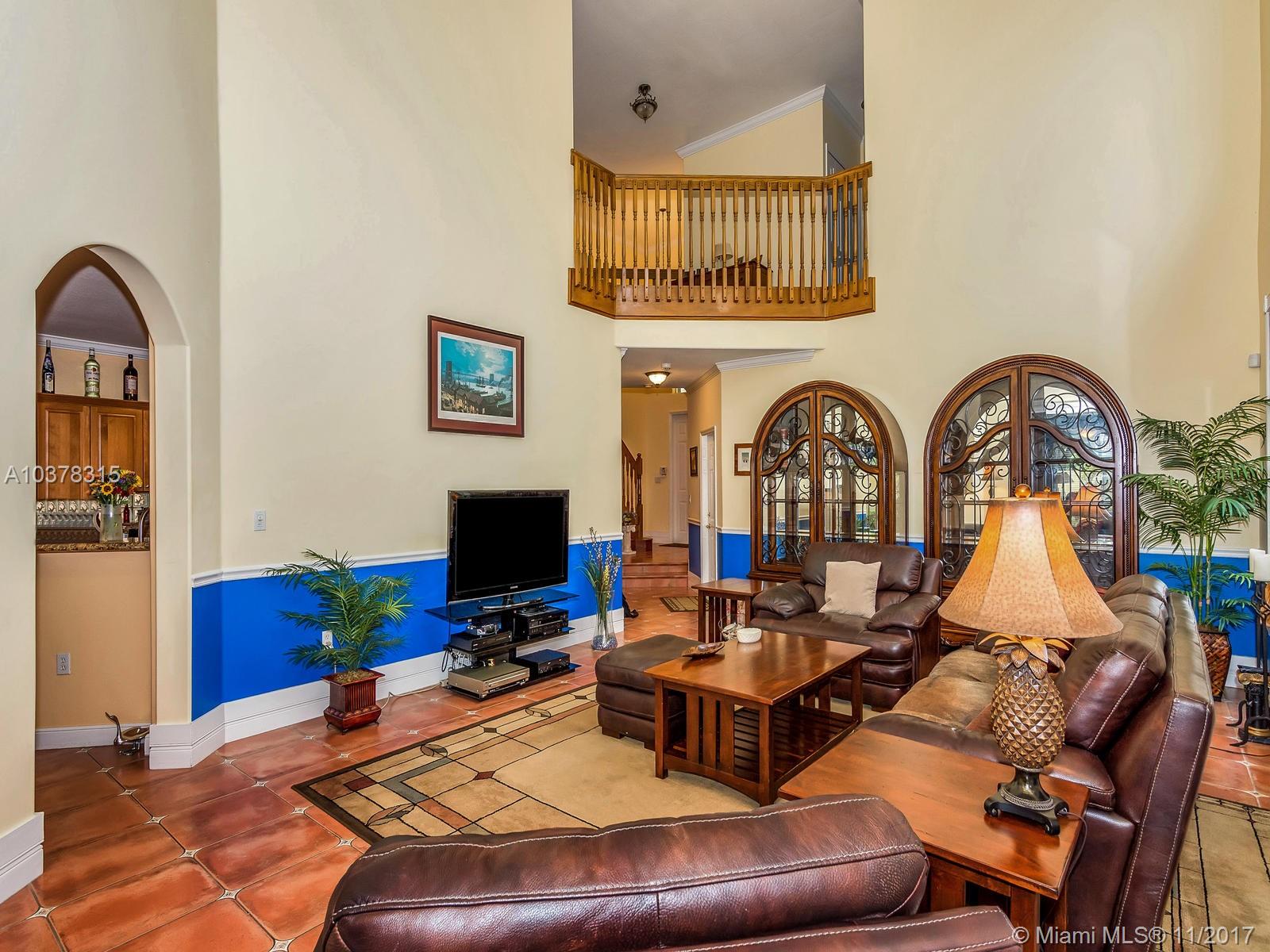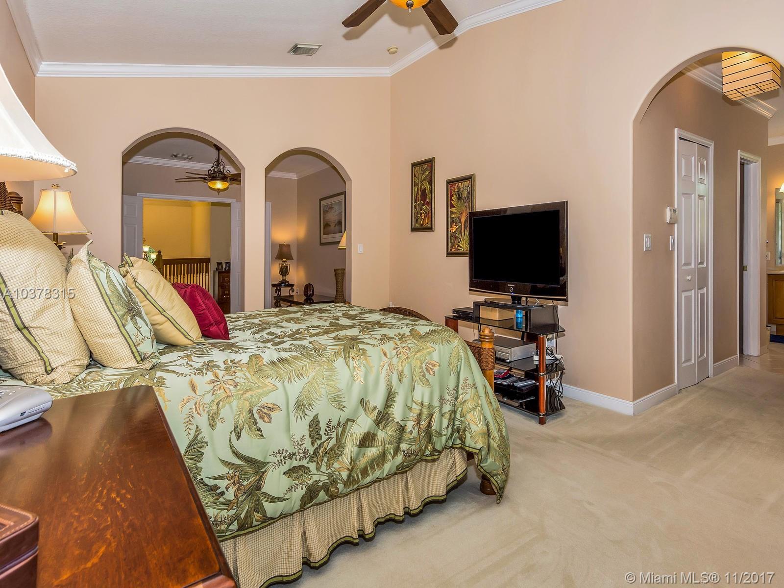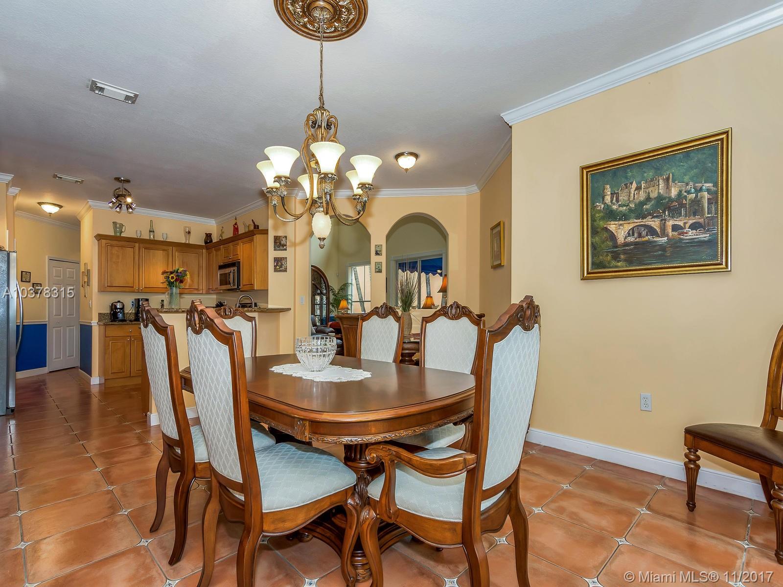This magnificent home with a two car garage is located in one of the most desirable communities in Doral. This elegant house has 4 bed/3.5 baths with over 2,600 sqft of living area that features a fabulous layout with high ceilings, crown and chair moldings throughout. Spacious living room, formal dining room and a family room which overlooks the open concept kitchen. Top of the line stainless steel appliances and granite counter tops. Huge master suite has a large separate sitting area. MBR bath has dual vanities, stand-up shower with glass doors and a whirlpool tub. Guest bedroom on first floor has private full bath. Well landscaped patio perfect for entertainment. Private community with guarded gate is beautifully landscaped and maintained.