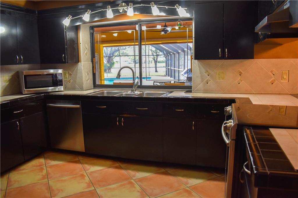 One of the best lakefront homes you will find in Maplewood on a Cul-De-Sac! Over 16,600 SF (3,221 under air), including an in-ground pool, large screened-in patio, oversized driveway, 2 bars (inc. wet bar) and huge rooms. Kitchen has updated appliances. This all comes with NO HOA! This property has recently installed ceramic tiles in bedrooms. Great home for families and for entertaining at a great price! Does not include drapery or light fixtures in dining room and kitchen. Home is sold AS-IS.
