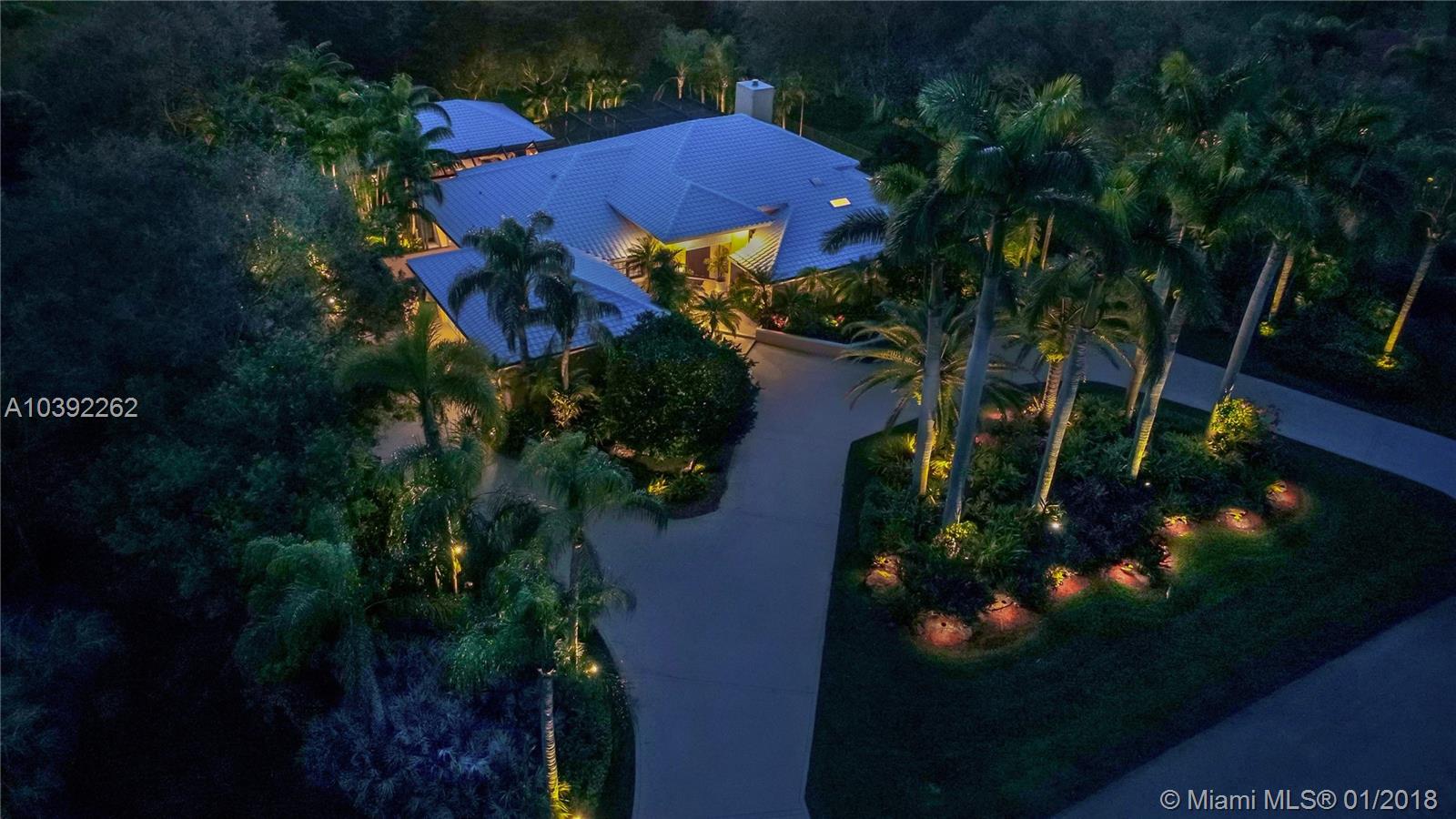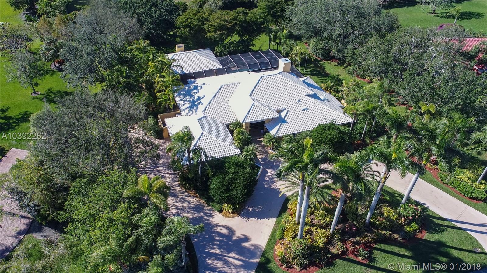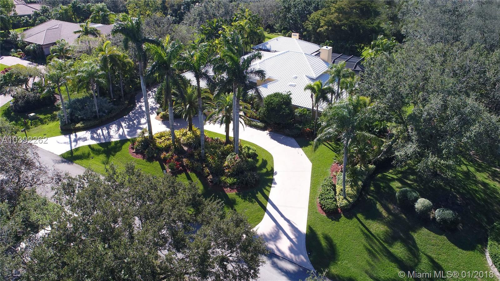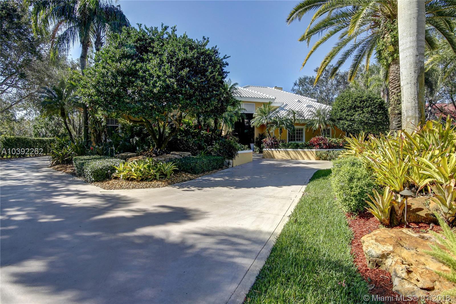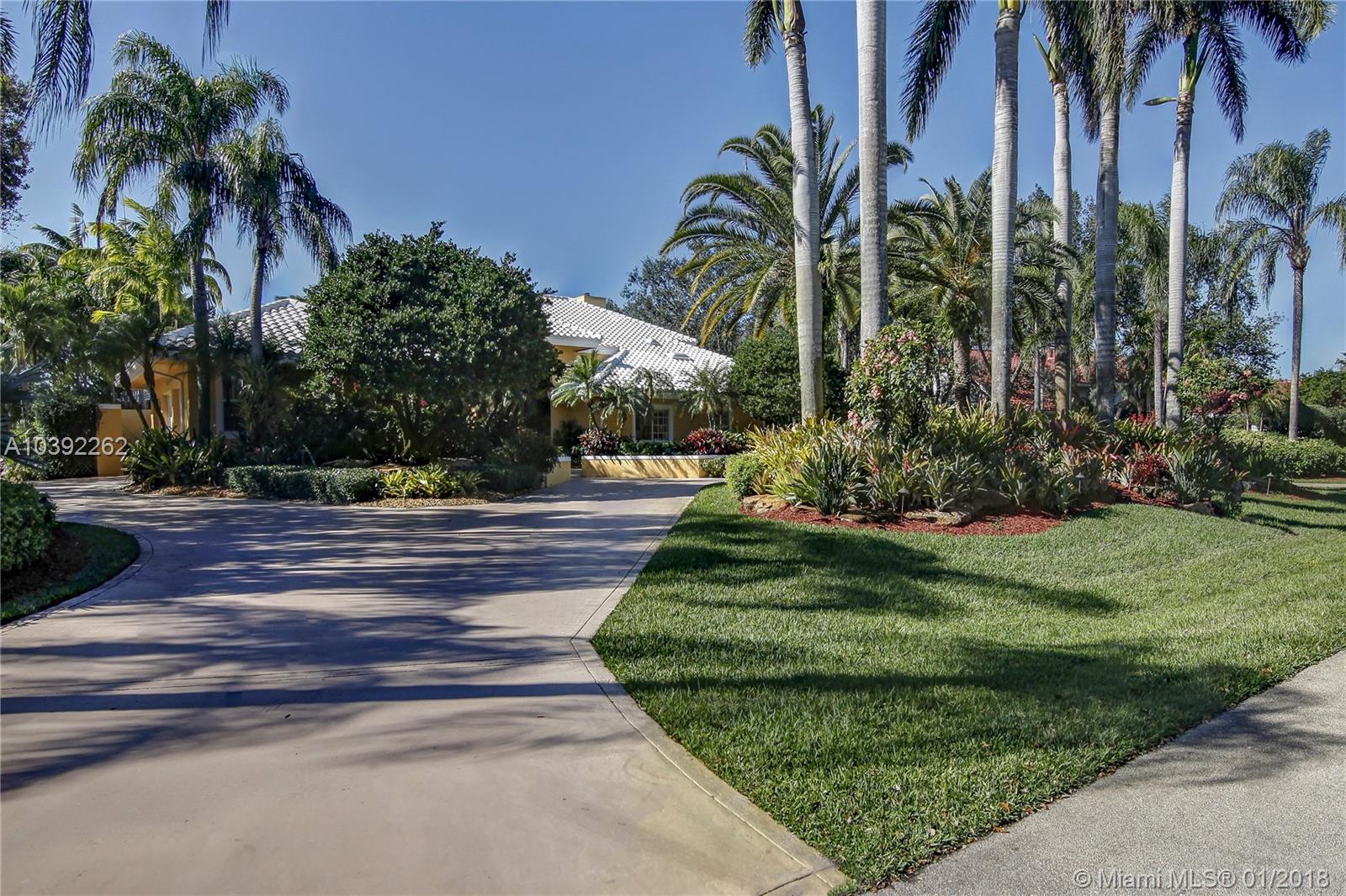 Luxury custom built home set back on a quaint cul de sac street. Enter this sprawling ranch via your circular drive with lush mature landscaping. Grand wood door welcomes you to this special entertainers delight home. Total Renovation in 2005. Enjoy gleaming marble floors with wood in all bedrooms. Step into your formal living room complete with fireplace, beamed ceiling and french doors to back yard oasis. Gourmet kitchen with oversized 10x5 center island, soaring ceilings, double ovens with sunny breakfast nook with windows overlooking pool. Custom office with tasteful built ins. Screened heated pool/spa with expansive deck including full summer kitchen, fountains, electric awning,lush tropical landscaping with lighting and Spacious guest house with full bath.