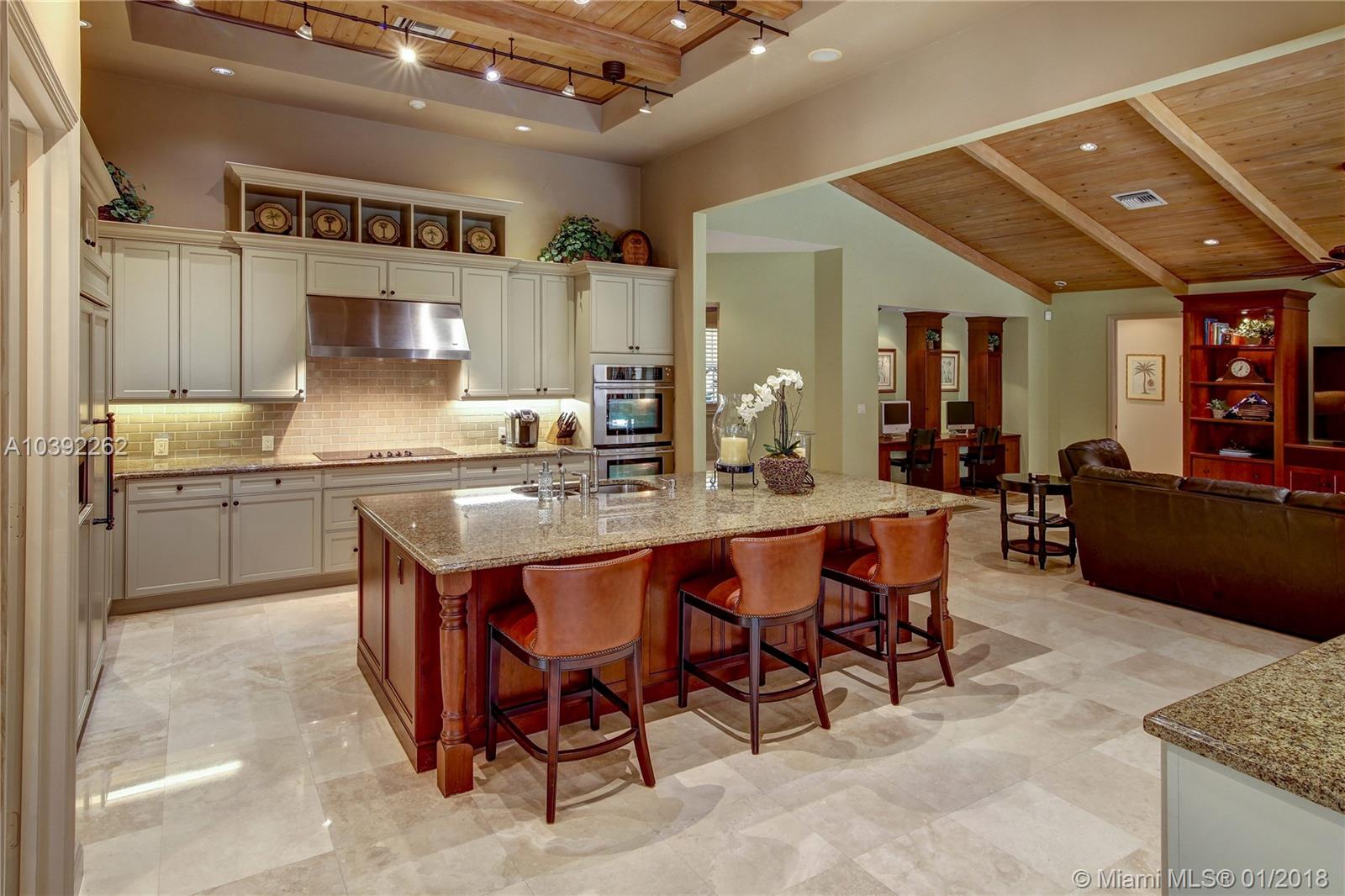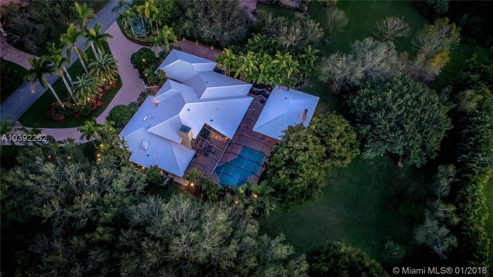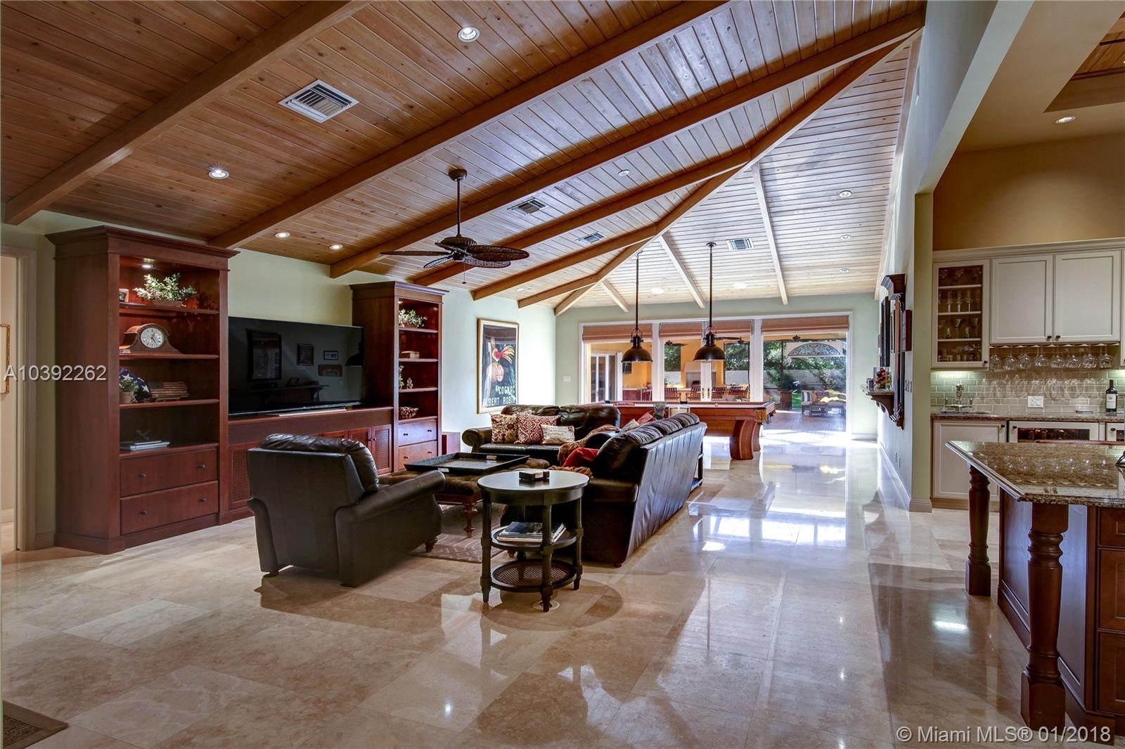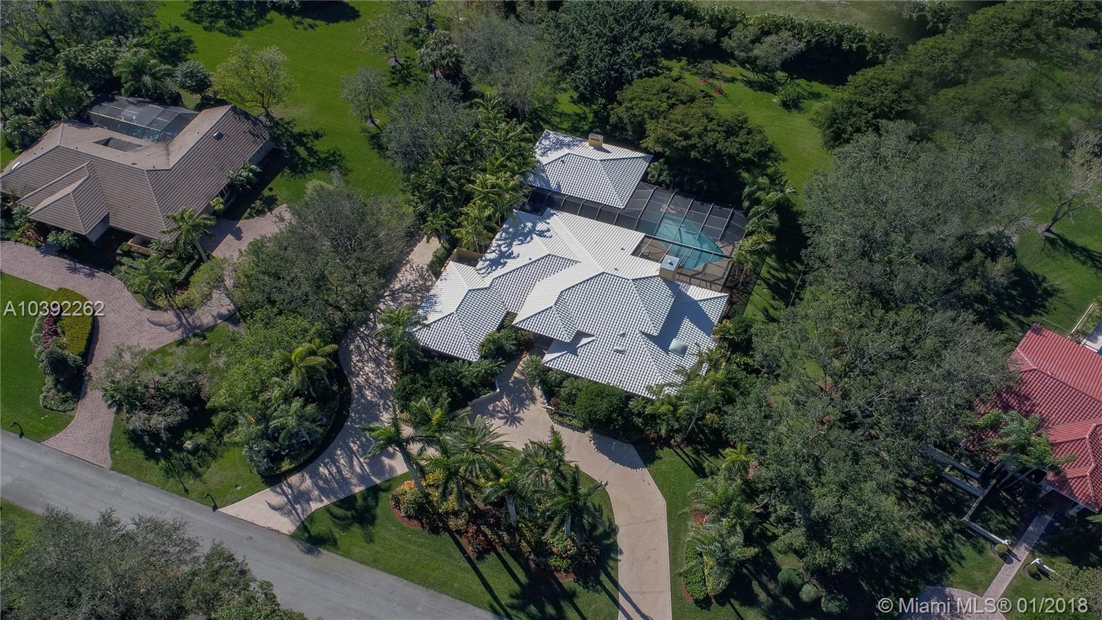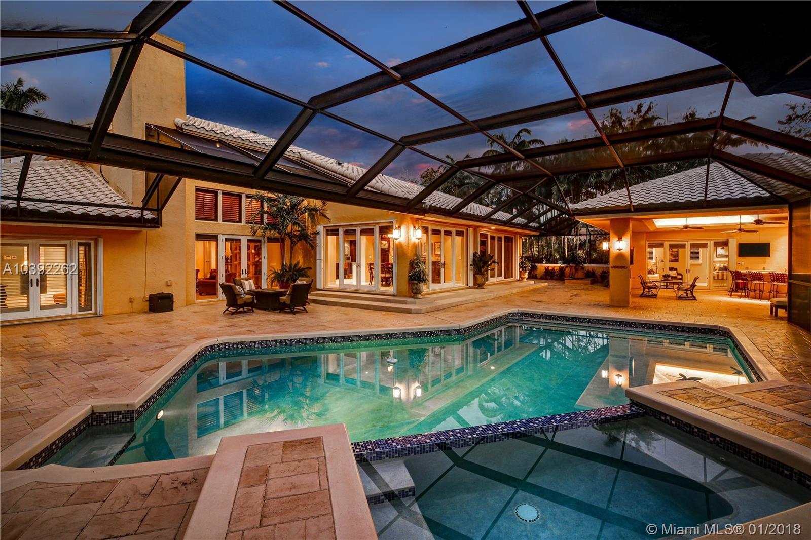 Luxury custom built home set back on a quaint cul de sac street. Enter this sprawling ranch via your circular drive with lush mature landscaping. Grand wood door welcomes you to this special entertainers delight home. Total Renovation in 2005. Enjoy gleaming marble floors with wood in all bedrooms. Step into your formal living room complete with fireplace, beamed ceiling and french doors to back yard oasis. Gourmet kitchen with oversized 10x5 center island, soaring ceilings, double ovens with sunny breakfast nook with windows overlooking pool. Custom office with tasteful built ins. Screened heated pool/spa with expansive deck including full summer kitchen, fountains, electric awning,lush tropical landscaping with lighting and Spacious guest house with full bath.