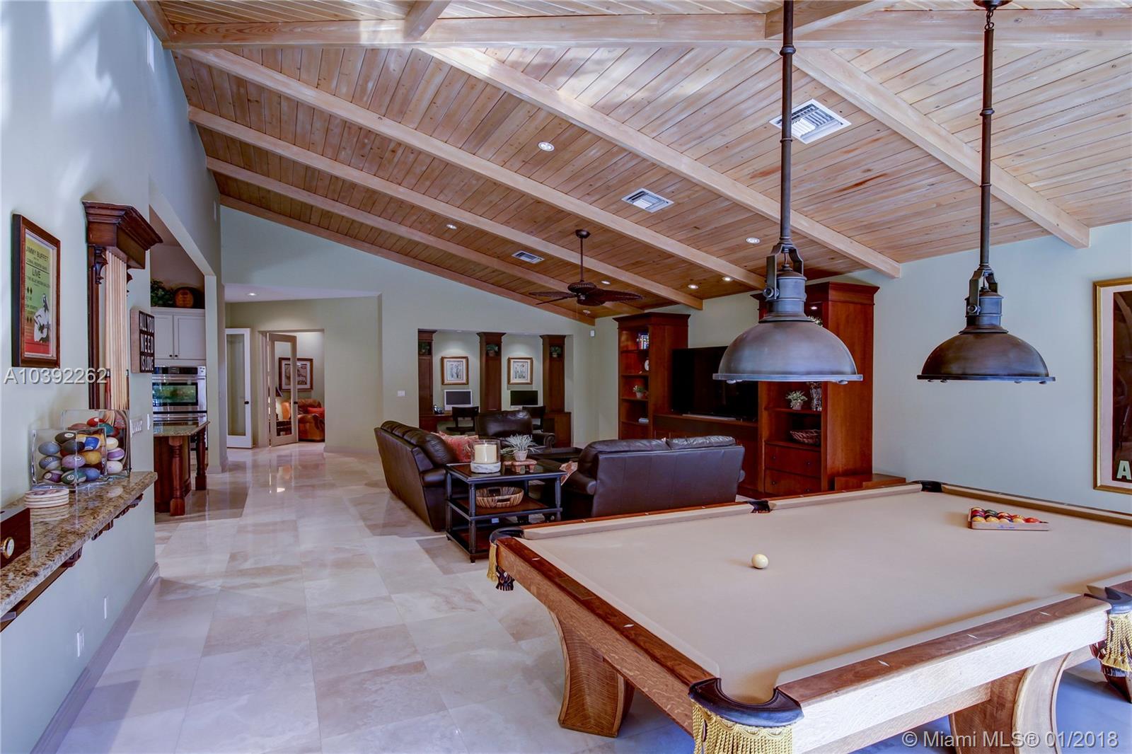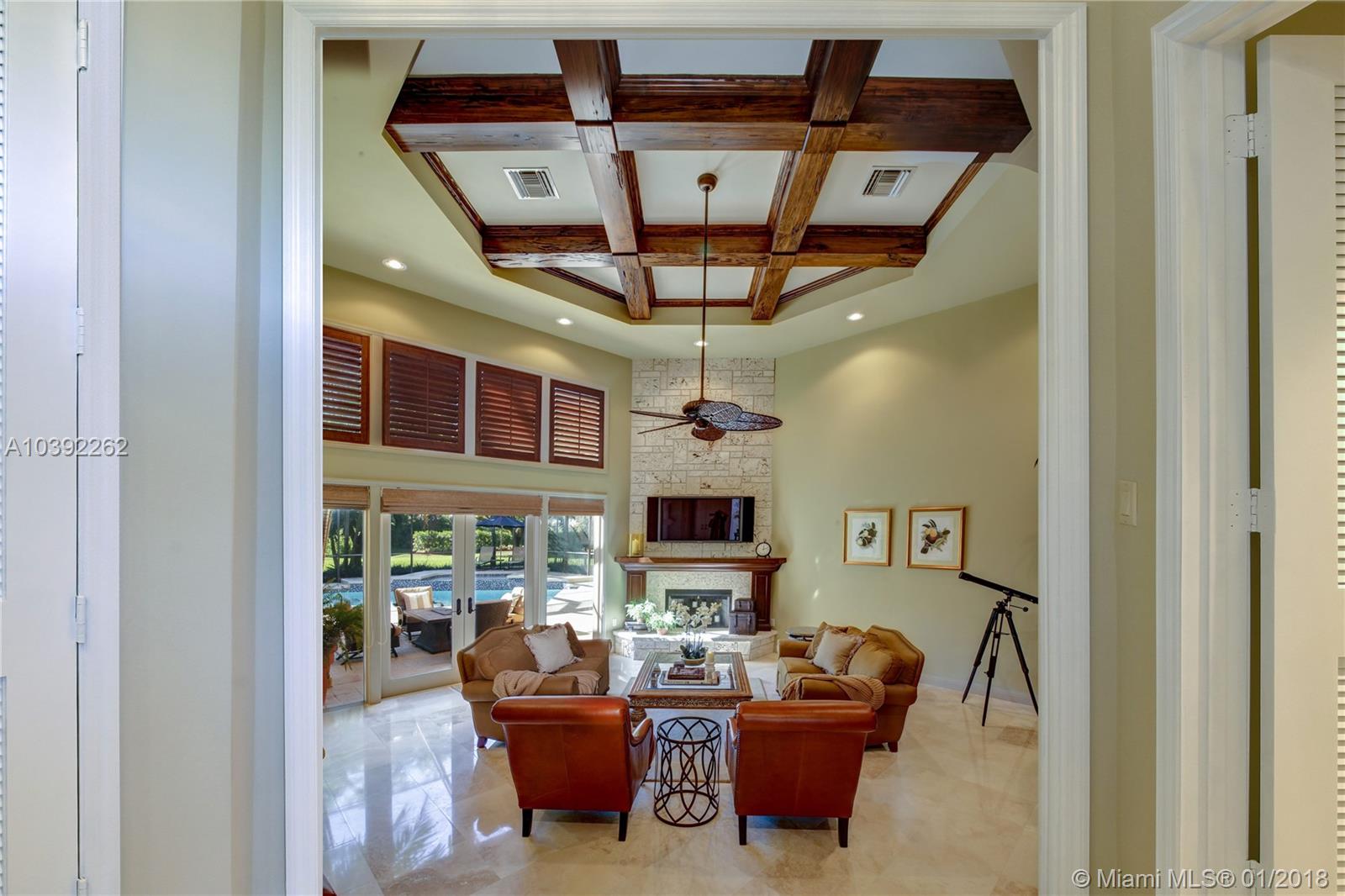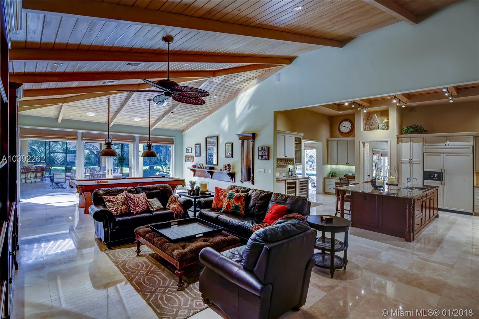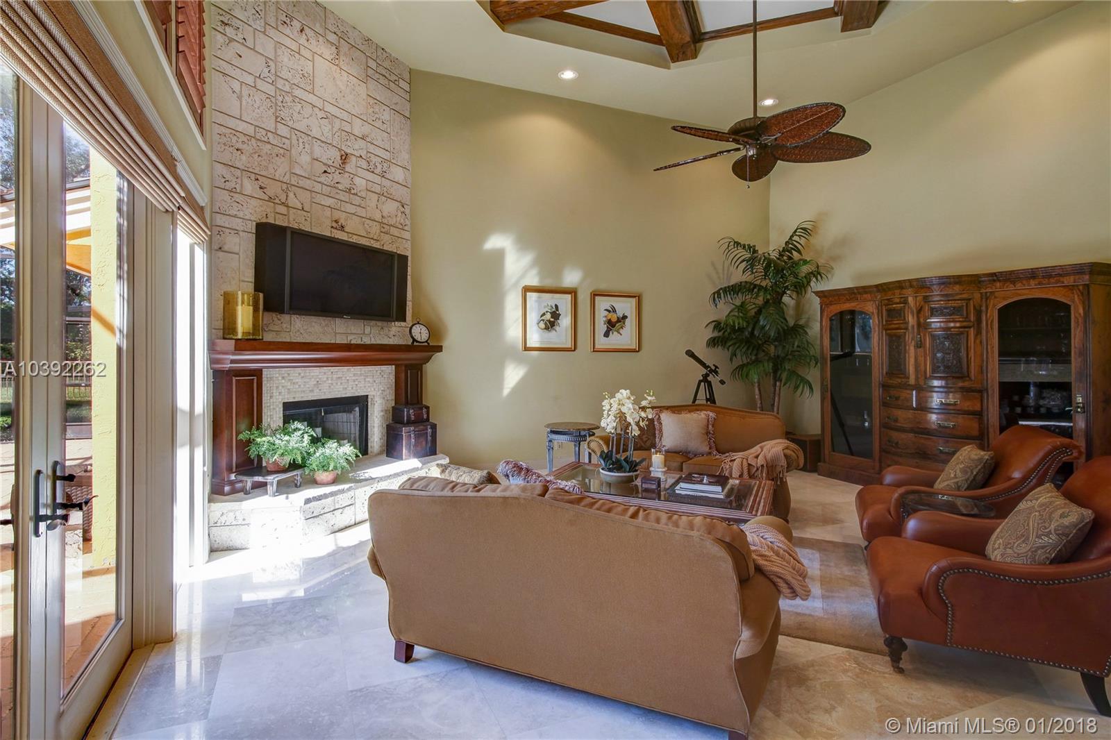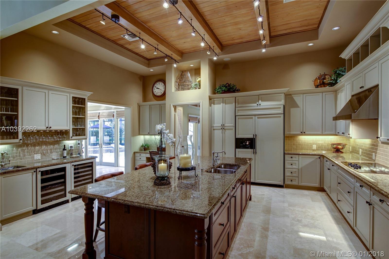 Luxury custom built home set back on a quaint cul de sac street. Enter this sprawling ranch via your circular drive with lush mature landscaping. Grand wood door welcomes you to this special entertainers delight home. Total Renovation in 2005. Enjoy gleaming marble floors with wood in all bedrooms. Step into your formal living room complete with fireplace, beamed ceiling and french doors to back yard oasis. Gourmet kitchen with oversized 10x5 center island, soaring ceilings, double ovens with sunny breakfast nook with windows overlooking pool. Custom office with tasteful built ins. Screened heated pool/spa with expansive deck including full summer kitchen, fountains, electric awning,lush tropical landscaping with lighting and Spacious guest house with full bath.