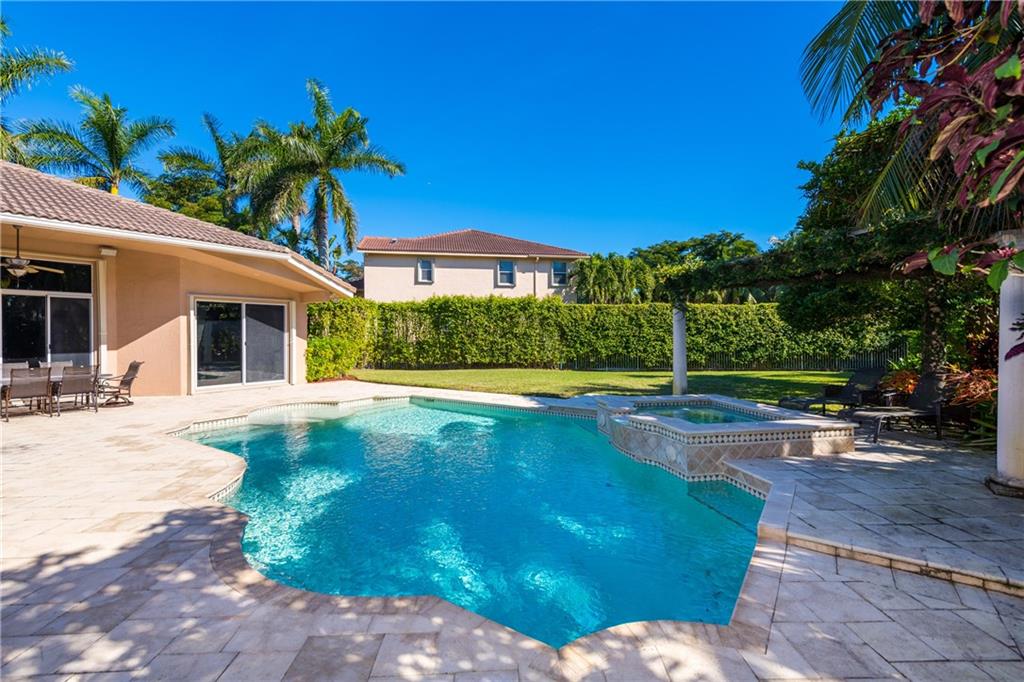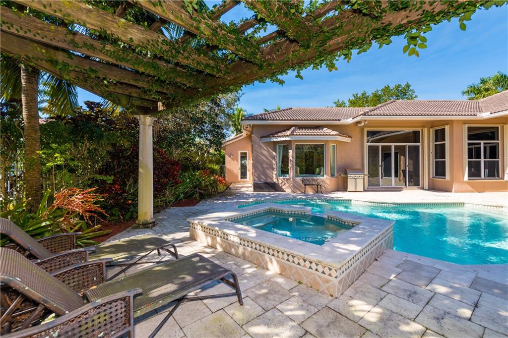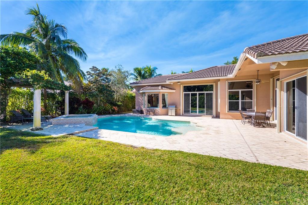 Gorgeous 1-story home in Weston Hills! 5BR/4BA/3-car garage PLUS kids wing is the perfect family home. A wonderful 760SF addition incorporates a bedroom, full cabana bath and recreation/study area. Exudes pride of ownership with newer ACs, pool heater, stainless steel GE Monogram appliances and accordion shutters/impact glass. Outside is equally as impressive with a gorgeous pool/spa, stunning pergola with colorful foliage and a large yard, completely fenced/hedged for privacy. Show and sell.