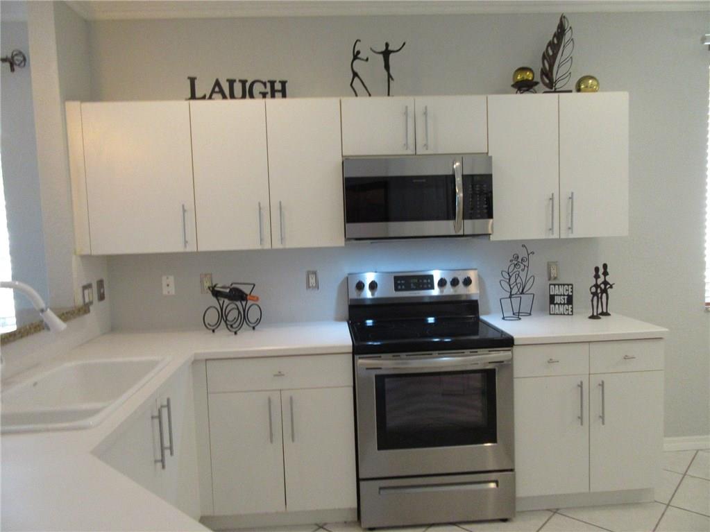 ABSOLUTELY GORGEOUS! Freshly painted in tones of grey, this pretty little starter/vacation home is in move-in condition. Enjoy a beautiful covered patio w/custom tile & SPECTACULAR LAKEFRONT SUNSETS. Granite snackbar counter; brand new SS appliances 2018; A/C 2012; dryer 2017. Stone tile thruout living areas, with vaulted ceilings and crown molding. Master has large walk-in closet; tray ceiling and crown molding. Property is fenced, and lushly landscaped.