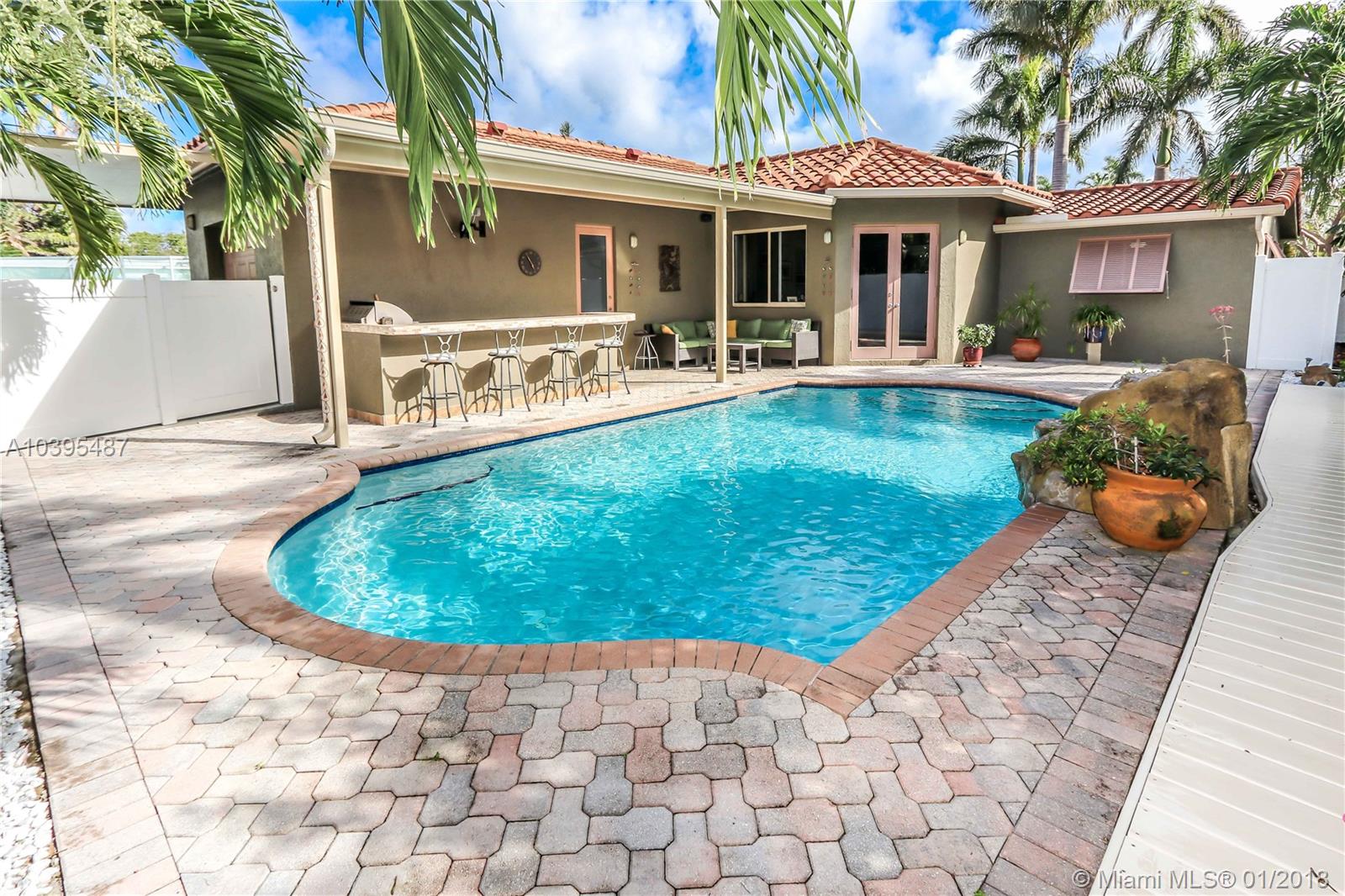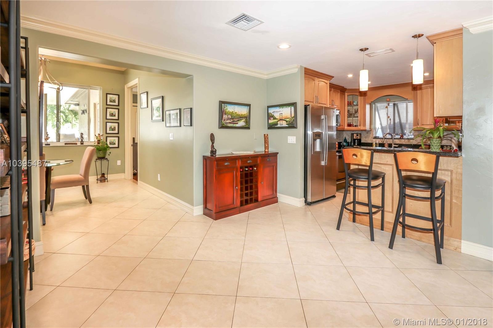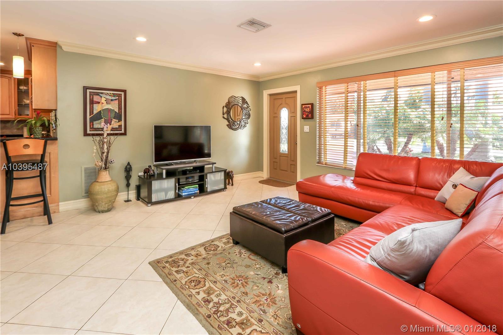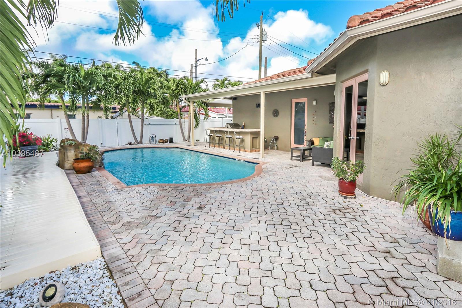 Beautiful 3 bedroom 2 bath pool home features a split floor plan, crown molding throughout, high ceilings and Porcelain/Terrazzo Floors. Fantastic Kitchen with custom wood cabinets, top of the line LG stainless steel appliances, granite counter tops complimented by marble tile back splash. Over sized master suite is complimented with Brazilian cherry wood floors, custom closets and master bath has imported exotic marble from top to bottom, over sized walk in shower, & dual glass sinks. Spacious Laundry Room can be Additional space for an office or den. Great for entertaining with resort style salt water heated pool, large outdoor bar with refrigerator and gas barbecue. Newer A/C Replaced in 2017 & Newer Roof (2013).