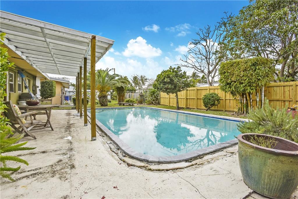 Middle River Manor home with 3-bed, 2-bath pool & carport semi-updated. Large wide open space for kitchen, dining & living room with vaulted ceilings in every room. Kitchen with gas range cooking island, granite, stainless, cherry wood cabinetry, newer appliances. Tile floors throughout. Separate laundry utility room. AC nearly new. Backyard fenced with mature landscaping, covered patio and pool. Pool needs decking to be done. Conveniently located between Wilton Manors & Fort Lauderdale Beach & Downtown.