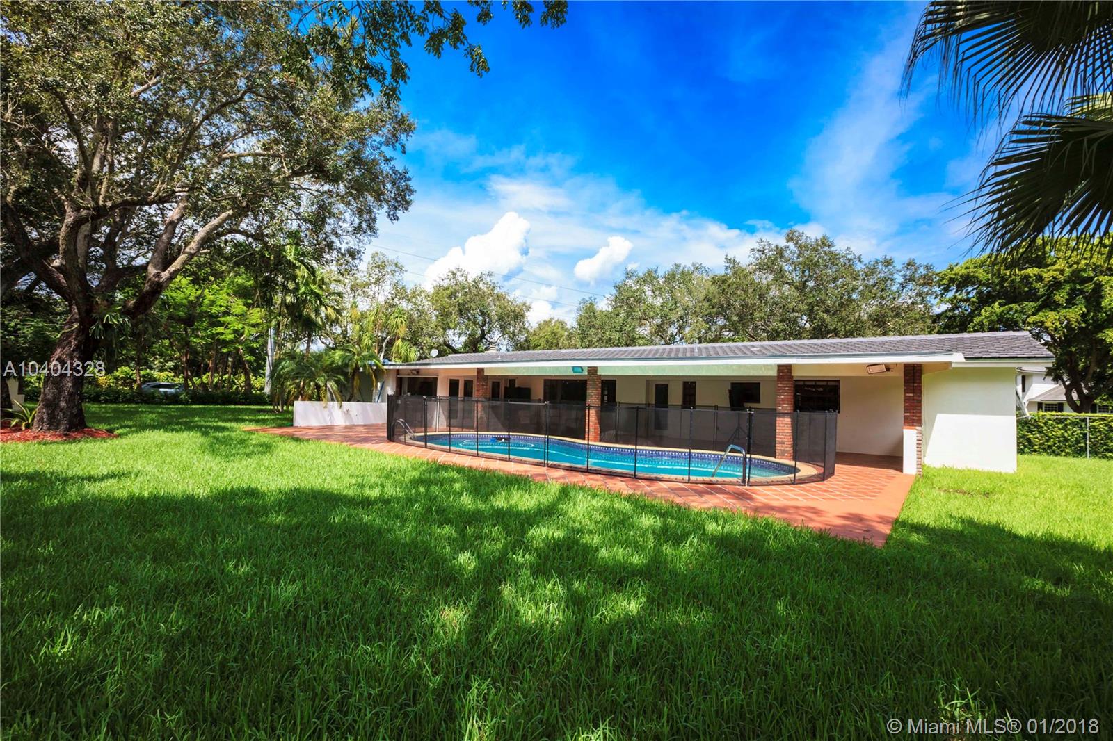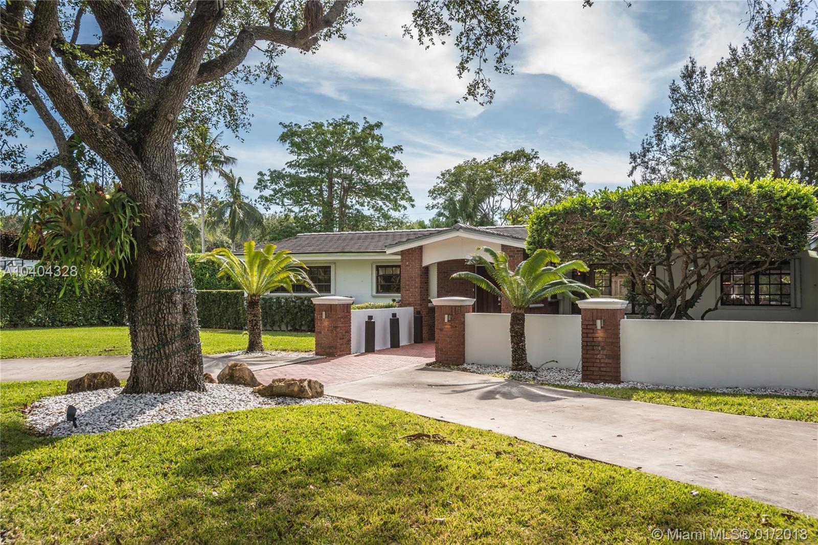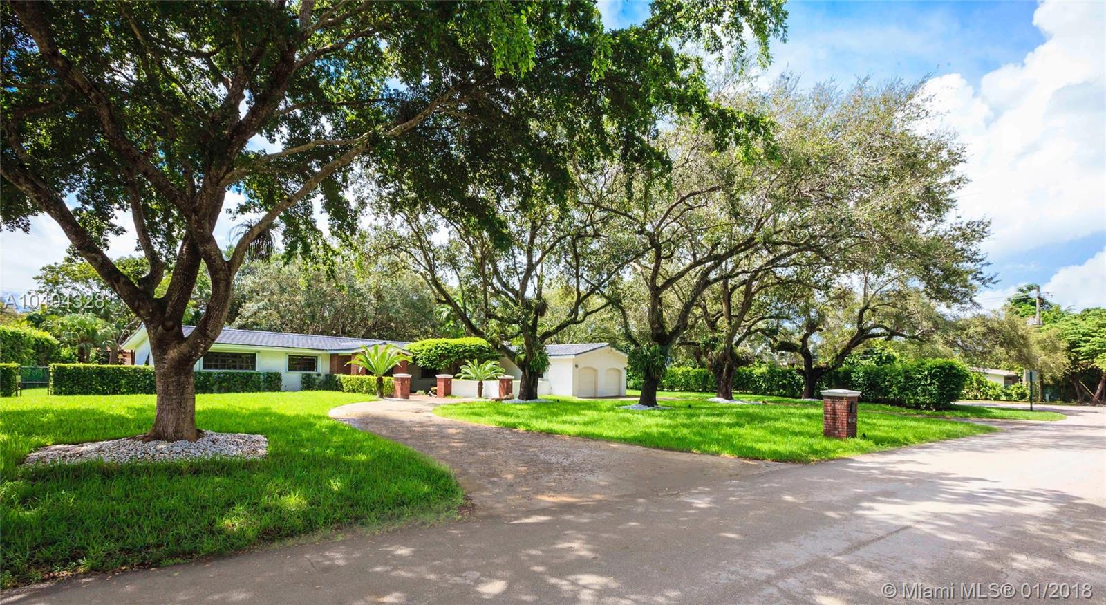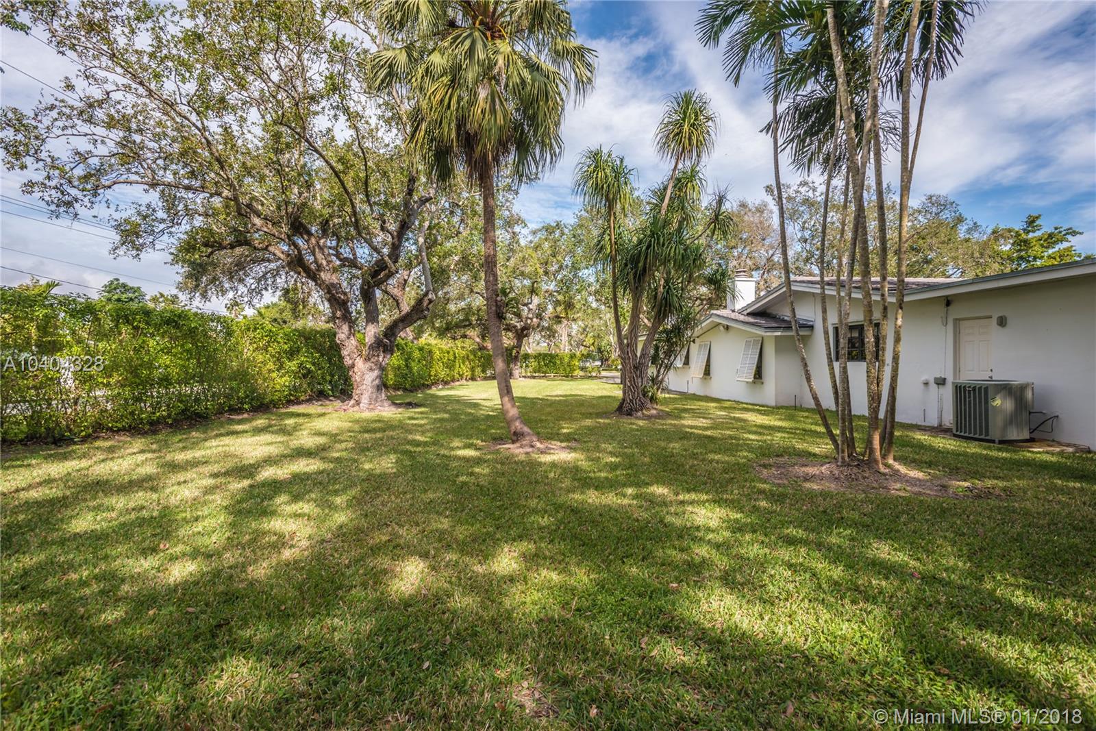 This Pinecrest ranch-style gem with a more modern interior twist has a comfortable floor plan. Foyer entry, open concept living and dining, spacious entertainment room with a wood-burning fireplace, 4 bedrooms, 3.5 baths (including a 2nd ensuite on opposite side), plus a separate multi-purpose room. Beautiful white kitchen with quality stainless steel appliances and breakfast area has direct access to a covered terrace, the sunny pool and large backyard. Porcelain floors; wood in bedrooms, laundry room, 2-car garage and ample driveway areas. Roof is 3 years new. Huge 31,363 sf corner lot with mature trees; all dimensions per County records. A desirable Pinecrest location, combined with sought-after public and private schools, make this property a fabulous option. Come see!