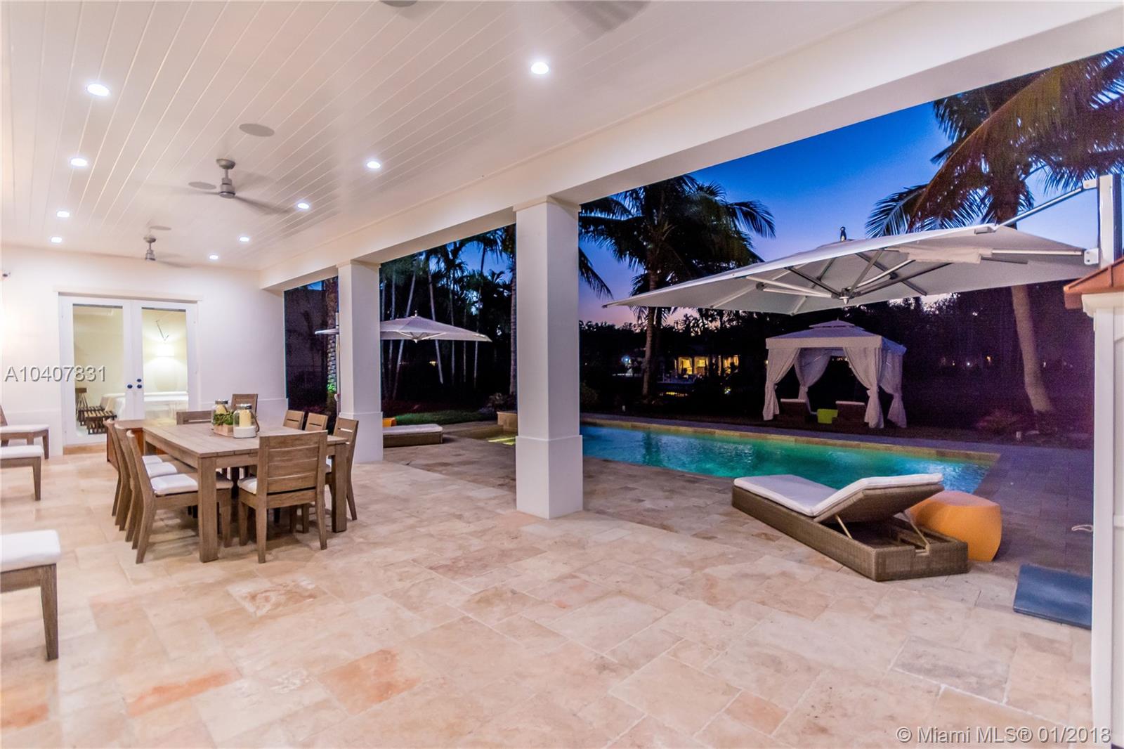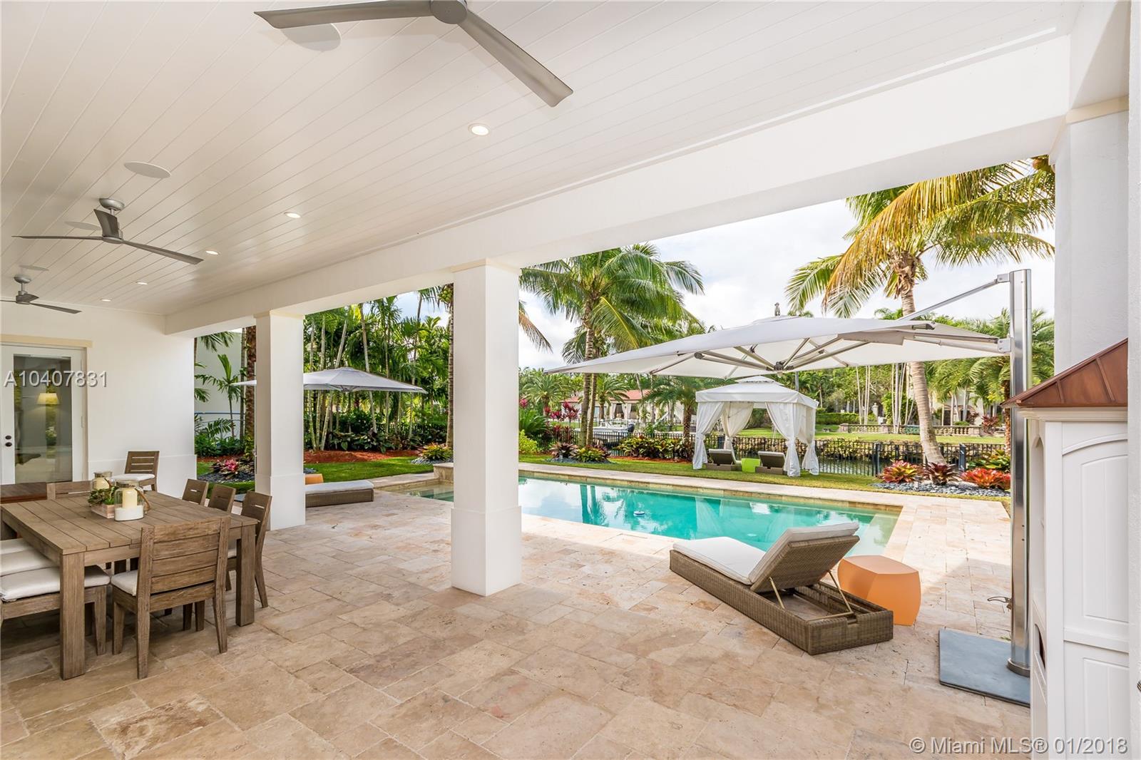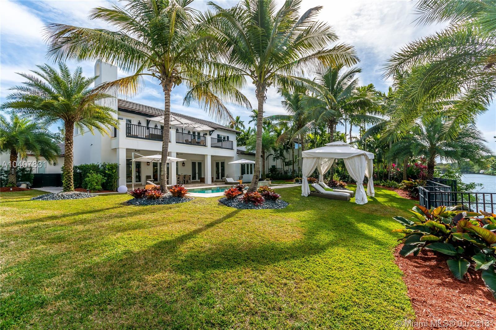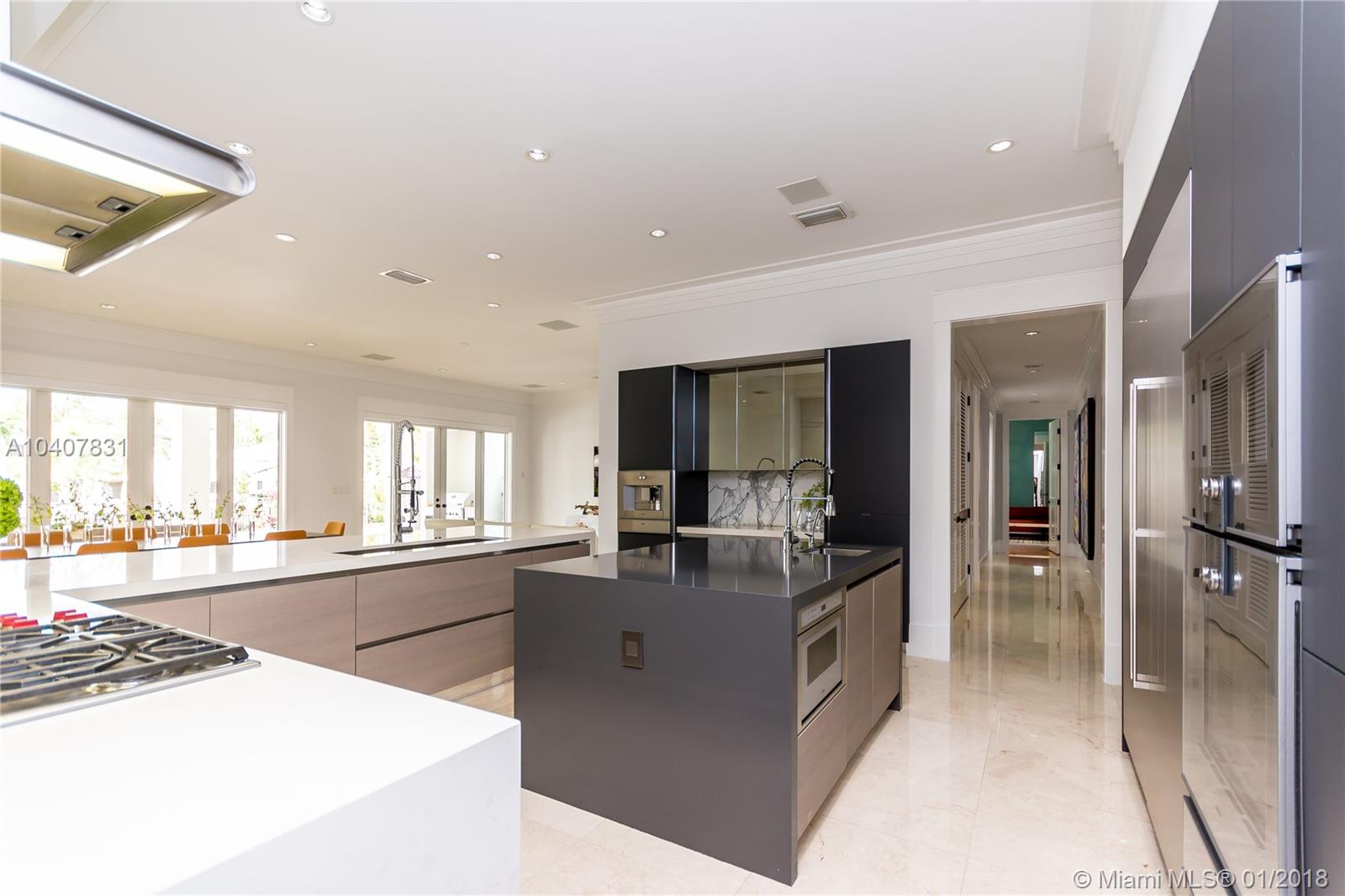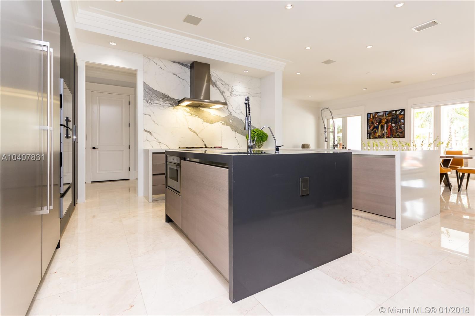 Spacious, gated, contemporary Island–style villa nestled in the heart of Coral Gables, on the Gables Waterway with ocean access. Abundant natural light, expansive verandas and terraces, gorgeous water views from the large entertaining kitchen, which itself boasts a single-slab marble wall. Completely renovated and updated with 6 bedrooms, 7.5 bathrooms (all bathrooms are en suite), 3-car garage, Chicago-brick driveway, impact windows and doors, security cameras and "smart home" features, wine cellar, and lighted tropical landscaping. Formal living and dining areas, plus family room open to the kitchen and facing the pool patio and waterway, all designed for gracious, elegant, yet relaxed tropical living