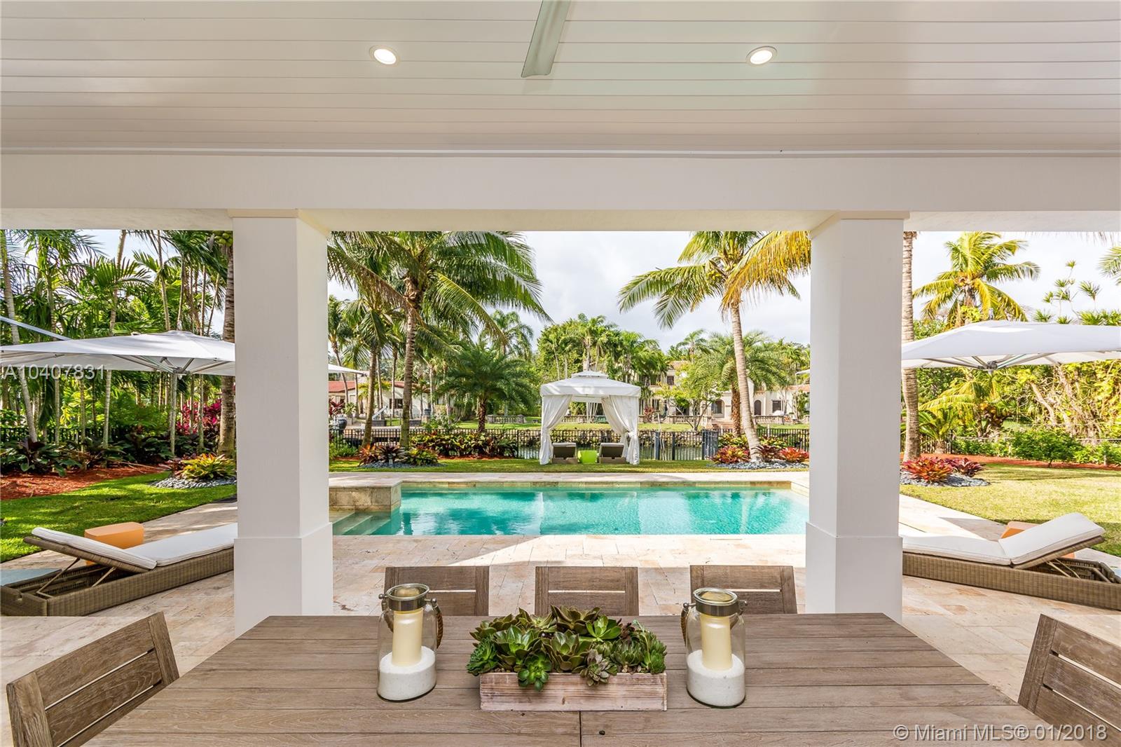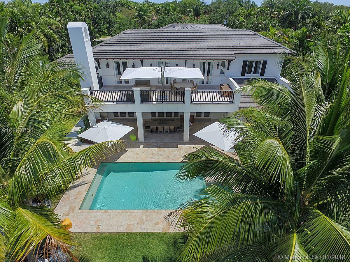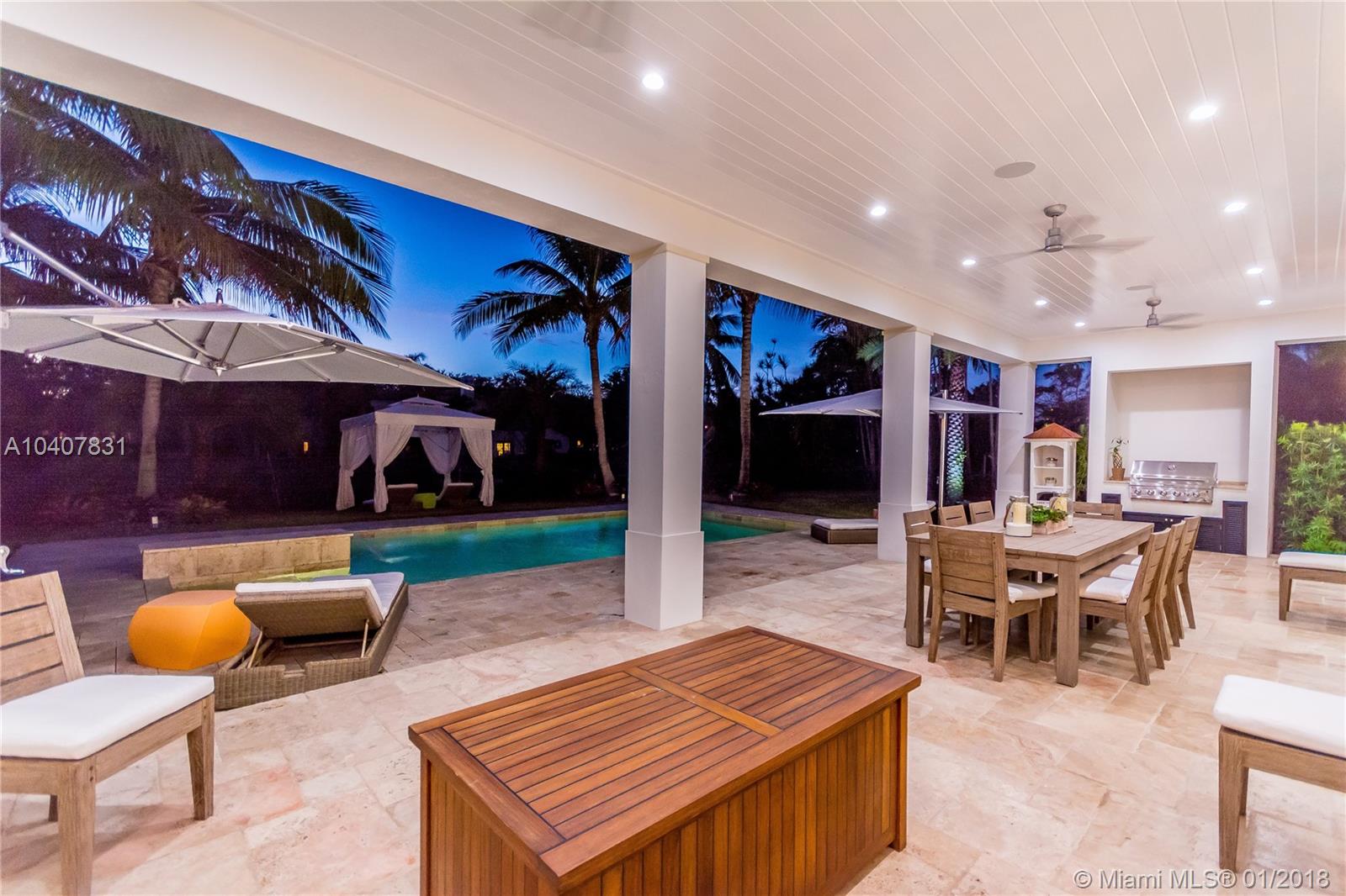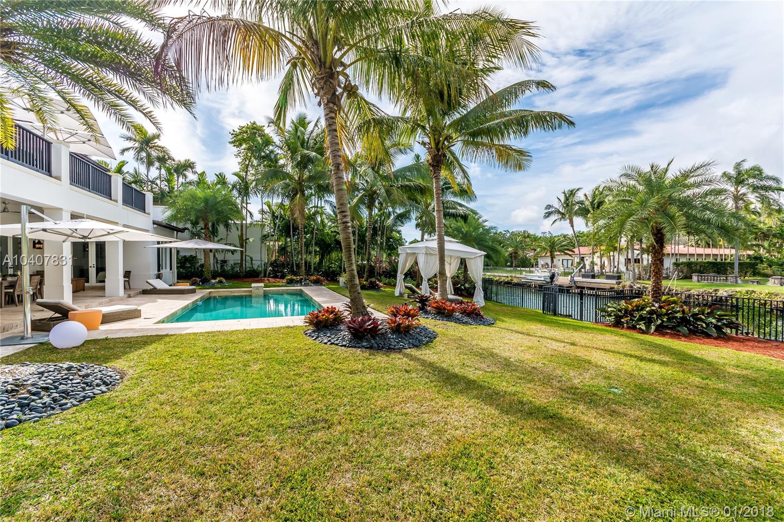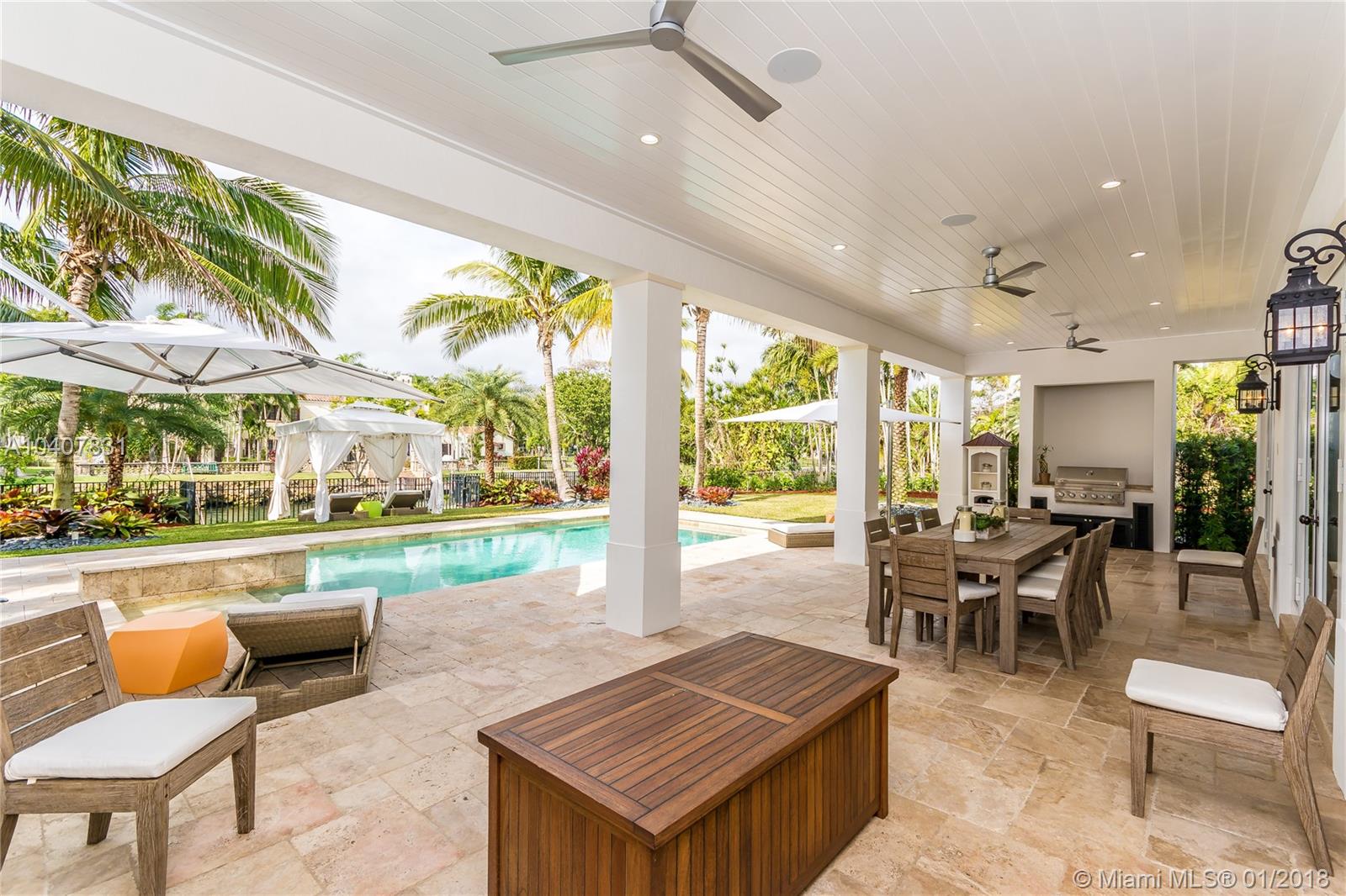 Spacious, gated, contemporary Island–style villa nestled in the heart of Coral Gables, on the Gables Waterway with ocean access. Abundant natural light, expansive verandas and terraces, gorgeous water views from the large entertaining kitchen, which itself boasts a single-slab marble wall. Completely renovated and updated with 6 bedrooms, 7.5 bathrooms (all bathrooms are en suite), 3-car garage, Chicago-brick driveway, impact windows and doors, security cameras and "smart home" features, wine cellar, and lighted tropical landscaping. Formal living and dining areas, plus family room open to the kitchen and facing the pool patio and waterway, all designed for gracious, elegant, yet relaxed tropical living