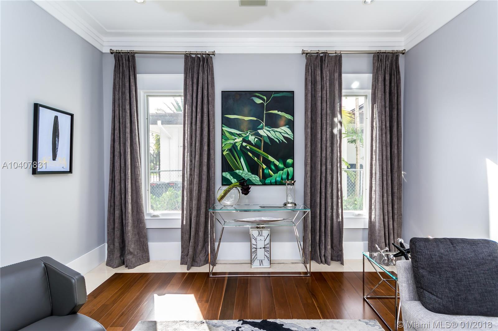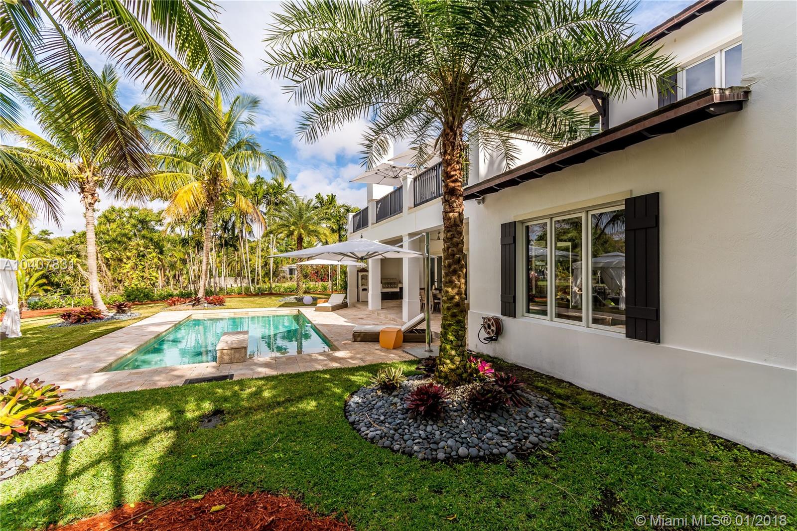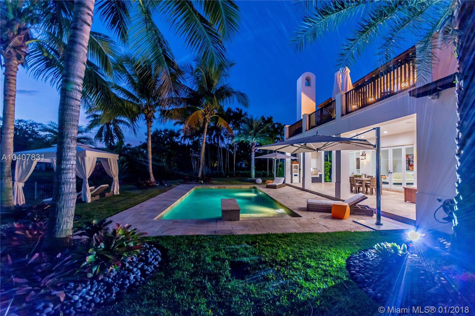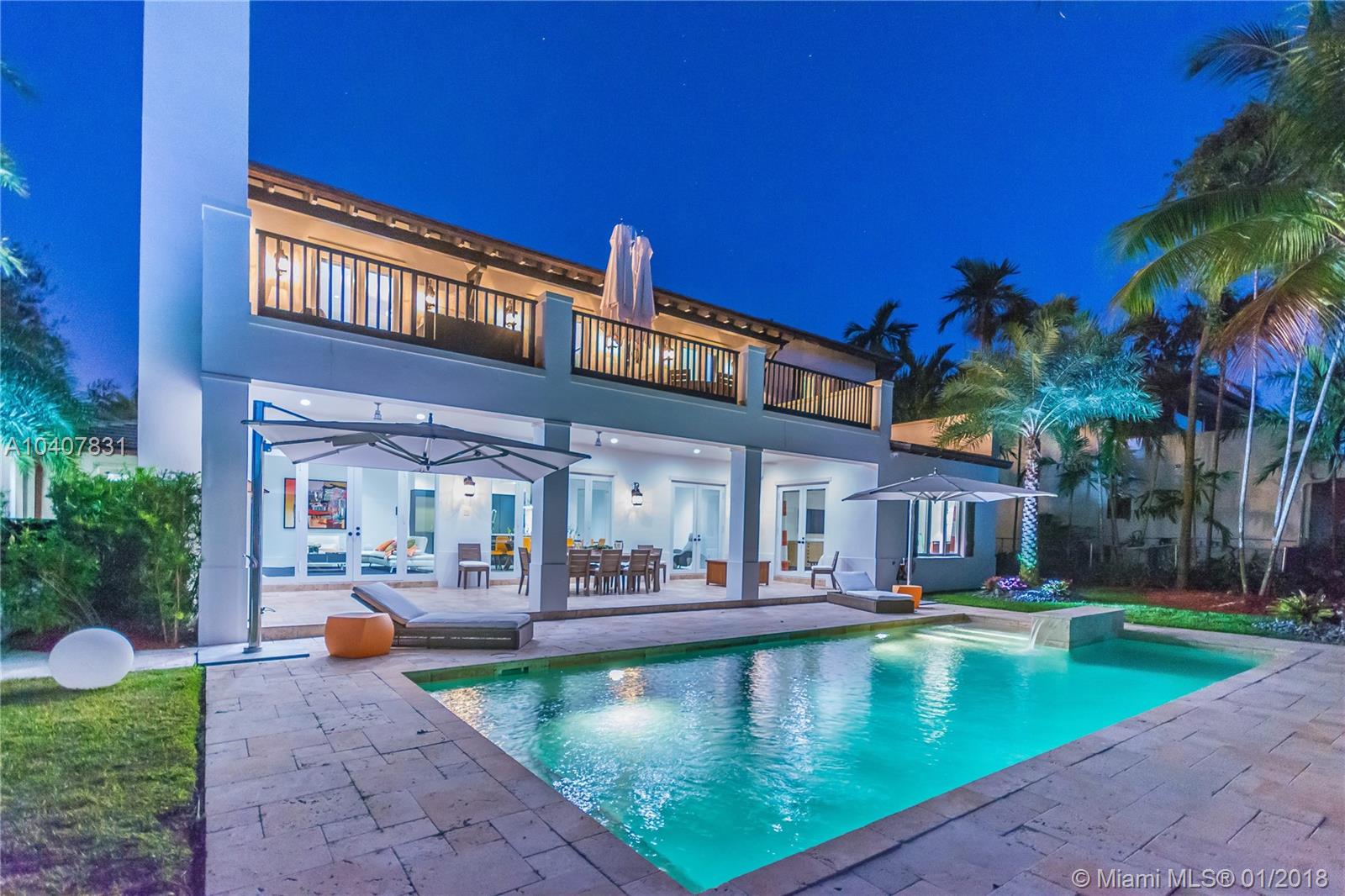 Spacious, gated, contemporary Island–style villa nestled in the heart of Coral Gables, on the Gables Waterway with ocean access. Abundant natural light, expansive verandas and terraces, gorgeous water views from the large entertaining kitchen, which itself boasts a single-slab marble wall. Completely renovated and updated with 6 bedrooms, 7.5 bathrooms (all bathrooms are en suite), 3-car garage, Chicago-brick driveway, impact windows and doors, security cameras and "smart home" features, wine cellar, and lighted tropical landscaping. Formal living and dining areas, plus family room open to the kitchen and facing the pool patio and waterway, all designed for gracious, elegant, yet relaxed tropical living