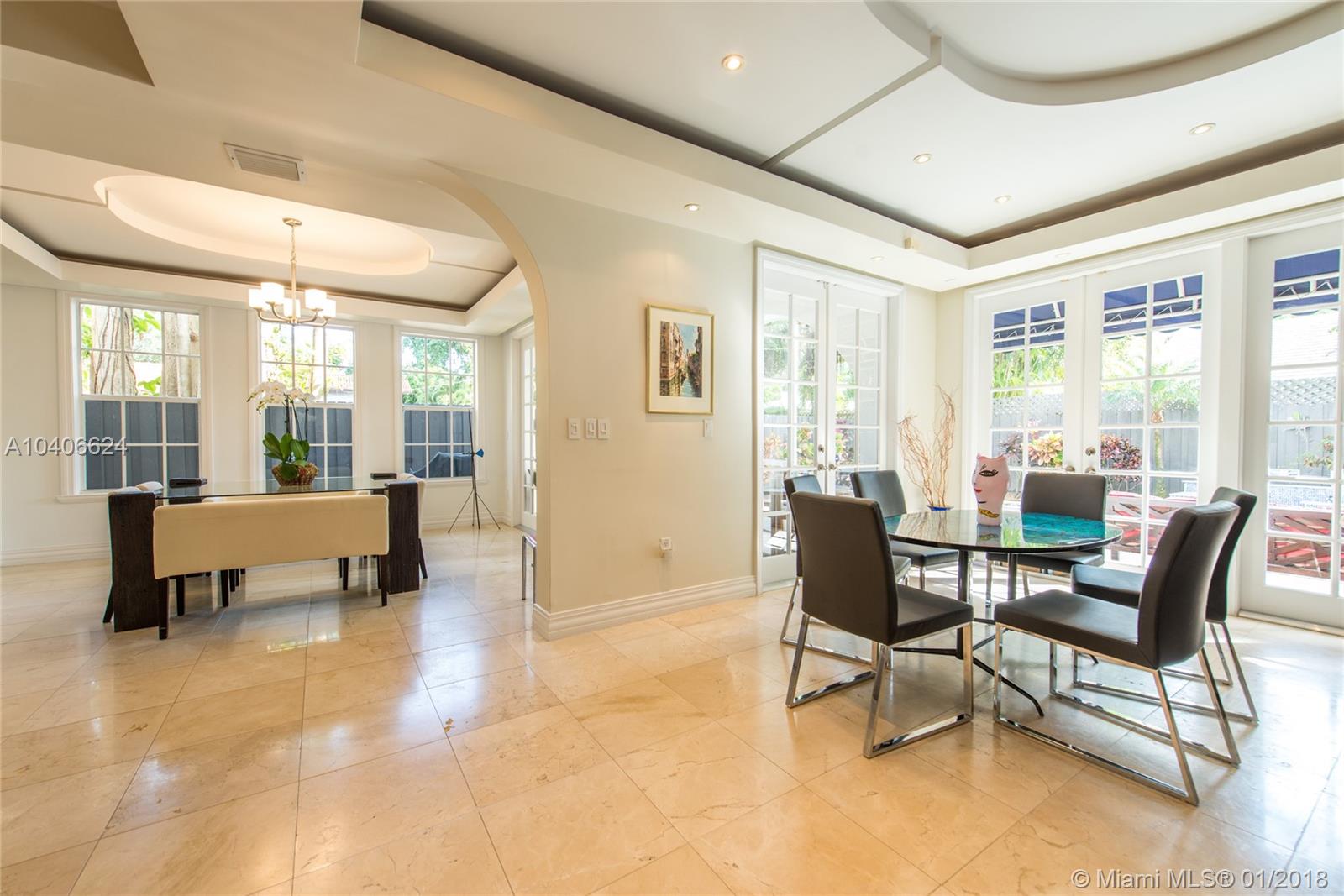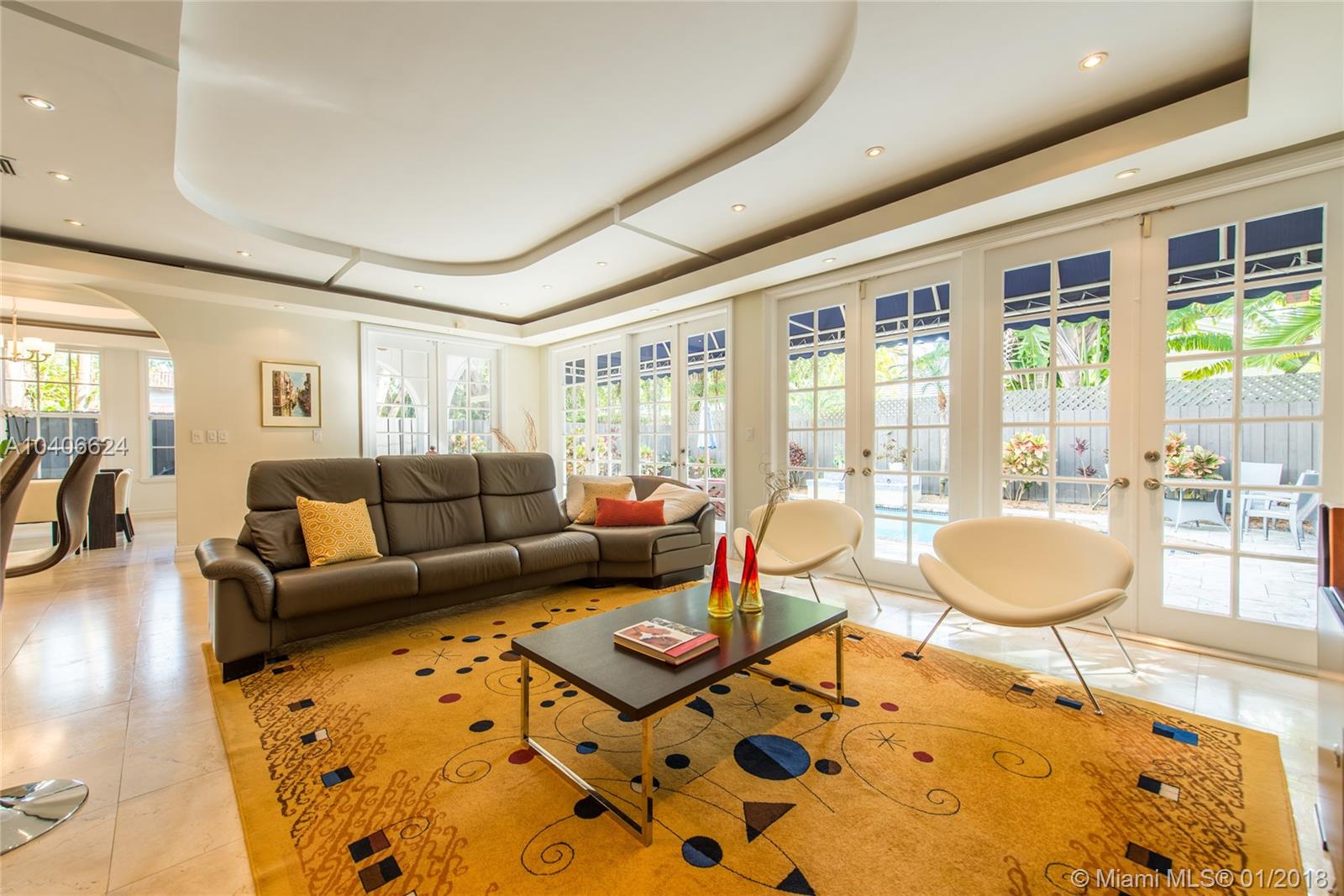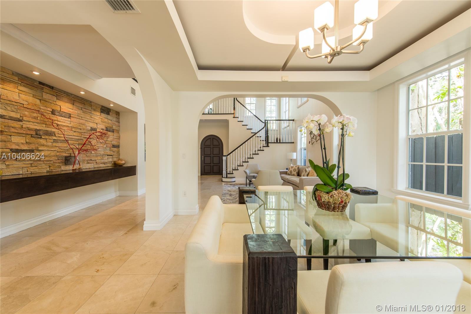Lovely European-inspired home in lush South Coconut Grove. Dramatic double-height ceilings and clerestory windows create light-filled living spaces w/ a blend of classic and contemporary architectural features. Renovated in 2009. Expansive formal living & dining rooms overlook tranquil pool surrounded by travertine terrace. Elegant custom kitchen w/ wood cabinetry, granite countertops, top-of-the-line stainless appliances, center island & bar seating. Oversized master suite features separate sitting area, 2 walk-in closets, private terrace & luxurious master bath with spa tub. 3 bedrooms 2 baths + den/office upstairs and 1st floor guest suite. Close to the Grove village center’s galleries, boutiques, cafes and bayfront parks & marinas. Minutes to downtown, MIA, Key Biscayne & the Beaches.
