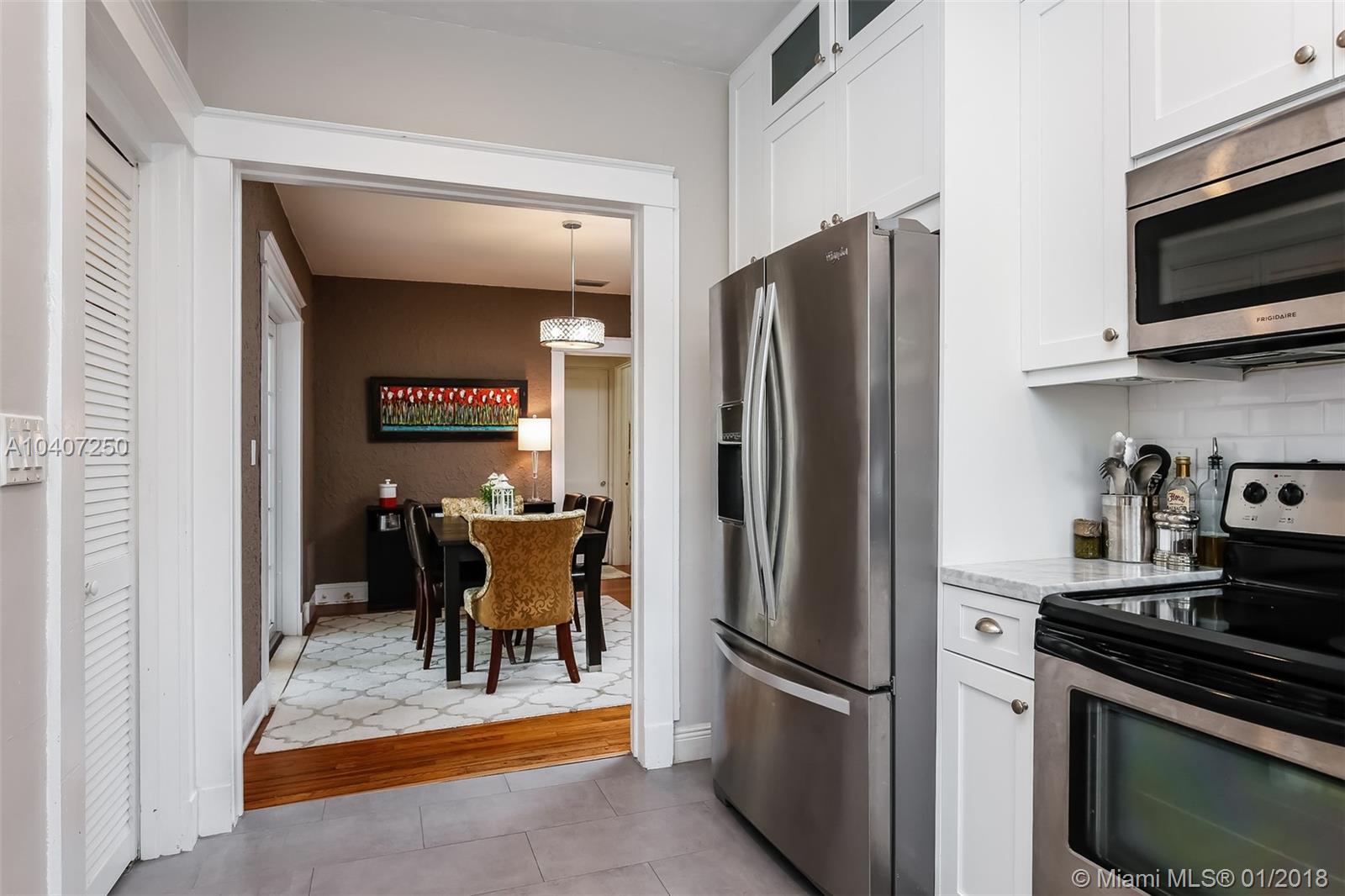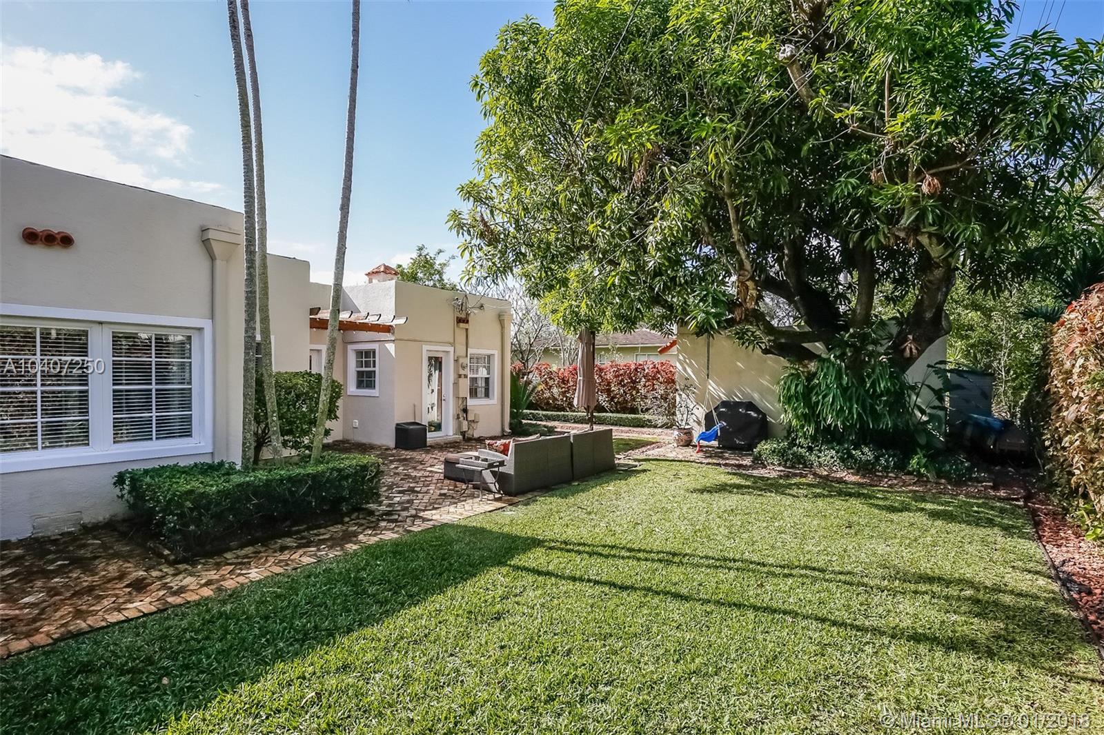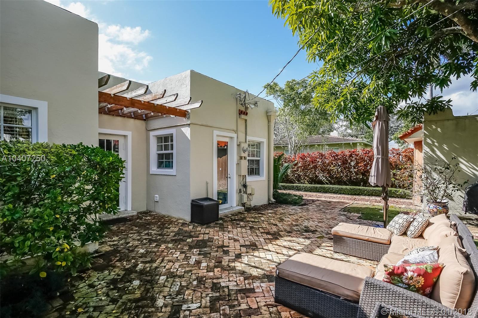 This bright and remodeled old-Spanish home features beautiful 1920s architectural details throughout with all the modern luxuries of today. Updates include reinforced impact windows and doors and a remodeled kitchen with a custom-built eat-in breakfast nook. Main house has 3 bedrooms/one bath, detached cottage/garage has an A/C wall unit with one bathroom. The home has great curb appeal with mature landscaping and lighting on a fenced 7,200 sq. ft. lot. There is plenty of room to expand, build a pool or possibly connect the main house to the back cottage. The neighborhood is very friendly and walkable with close proximity to restaurants & shops, as well as the Coral Gables Trolley making it an ideal starter or empty nester home.