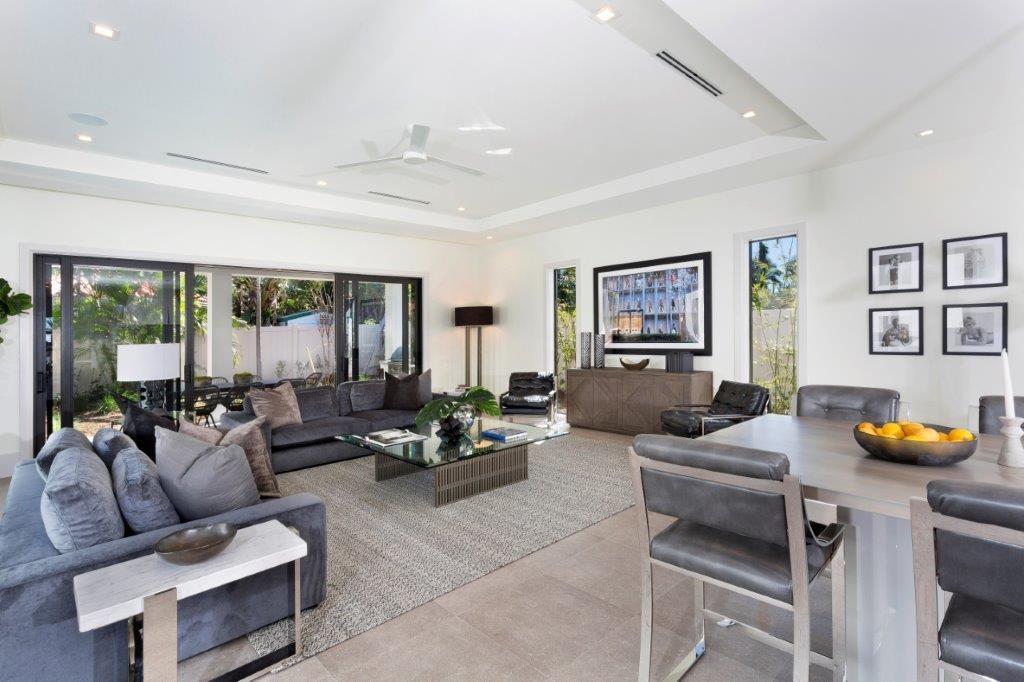 The circular paver drive, leading to a fenced courtyard entry to this open contemporary design, is defined on either side by islands of lawn, low shrubs and graceful palms trees. A privacy fence surrounds the sides and rear perimeter, ensuring an oasis of tranquility. An open rear courtyard off of the living room features a gas-heated pool and elevated spa served by an outdoor shower and cabana bath. A conversation/lounging area beyond the spa is delineated by its slightly elevated wooden deck. The long covered loggia off the family room includes a built-in gas grill for dining alfresco.