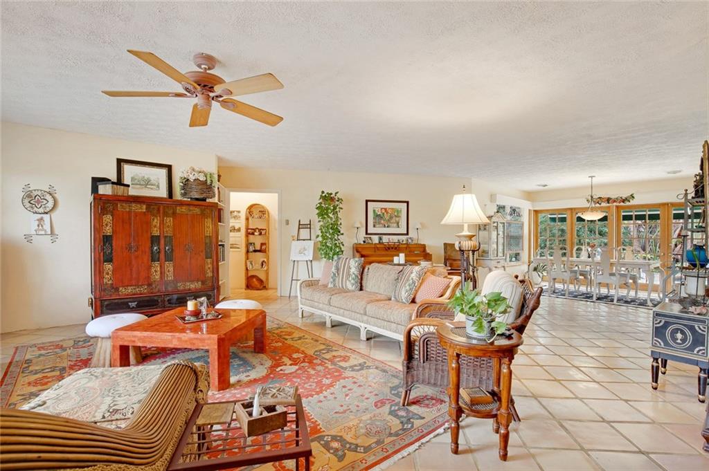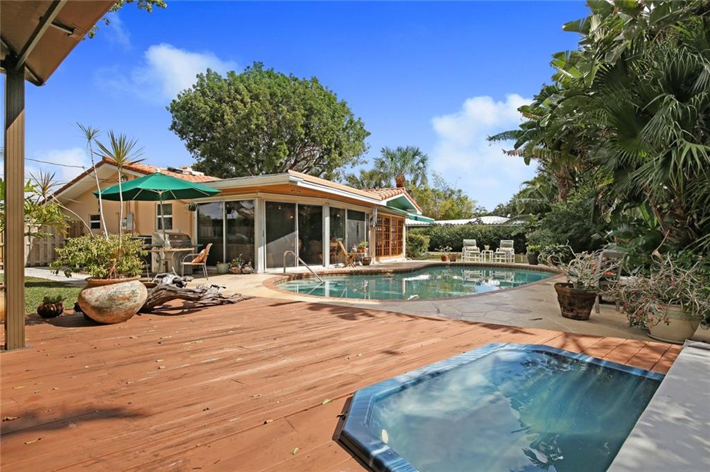 Charming home located in Coral Ridge on a desirable over-sized corner lot! Spanish style with bleached Mexican tile flooring, 2 bedrooms, den/family room and 2 full baths. Large living room with wood burning fireplace, separate dining area with 2 sets of French doors leading to a private, spacious backyard with sparkling pool. Tropical landscaping, large deck with spa and room to expand! Lovely tiled kitchen, separate laundry room, impact windows and one-car garage. Top rated Bayview School District.