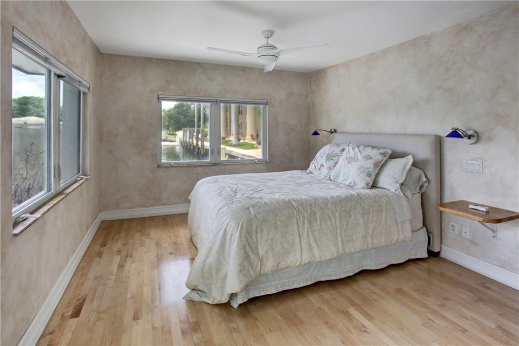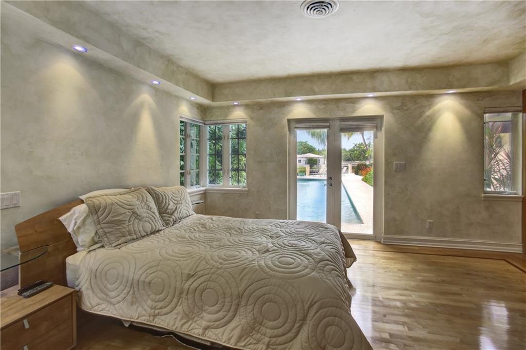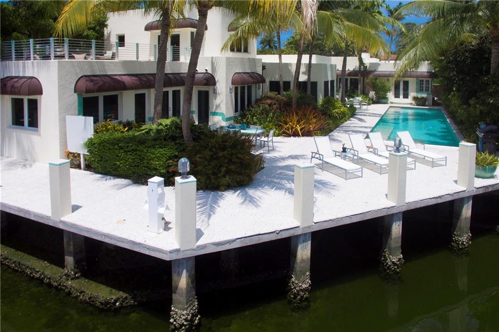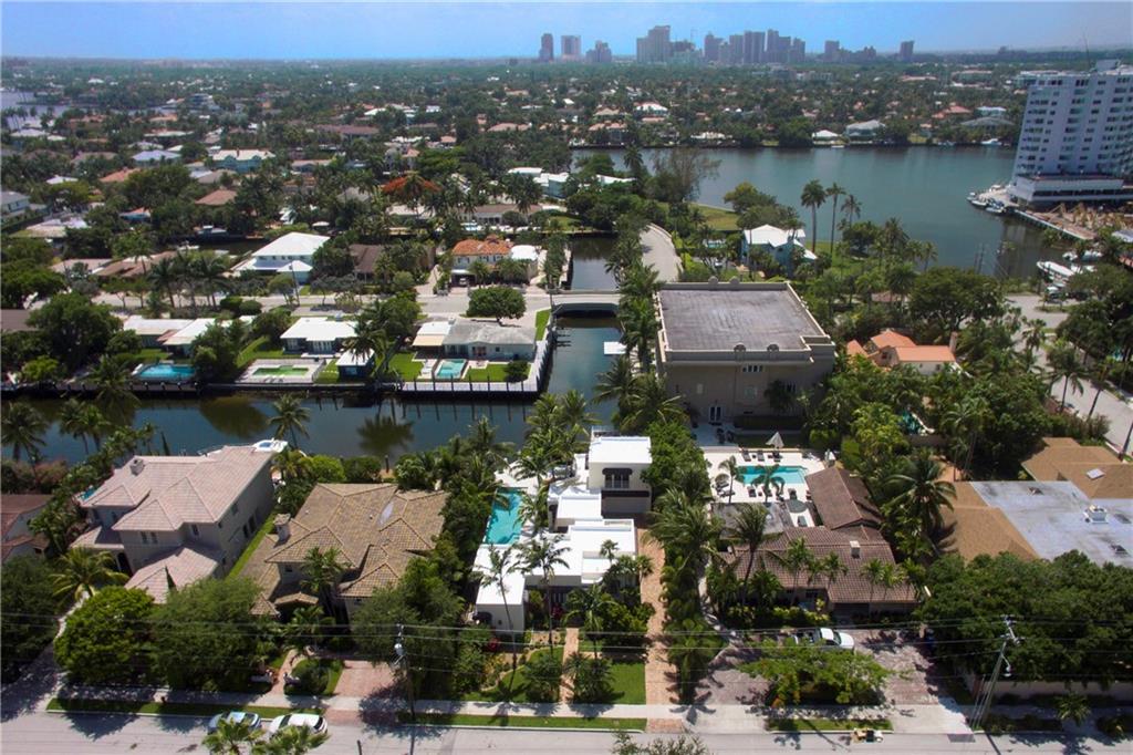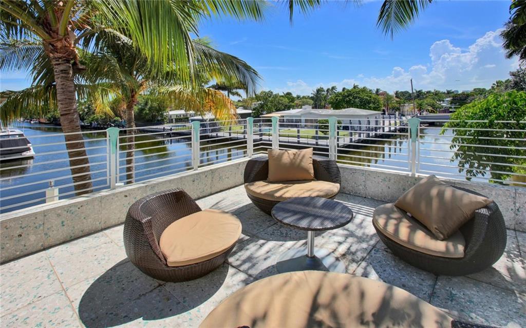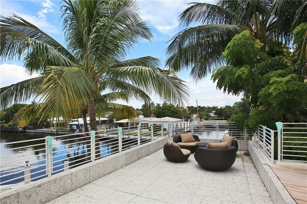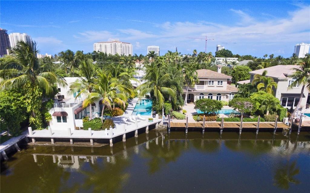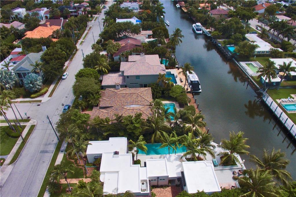 Perfect Idlewyld retreat! Extensive impact glass creates sun filled rooms to capture beautiful large pool & water views. Great entertaining flow from the Chef's kitchen Miele/Sub-Zero, living/dining room, fireplace, family/media room, 3 master suites (2 main level). Separate guest apartment at the rear of the residence, kitchenette & private entry. 4th bedroom currently den. Large expansive roof top terrace has beautiful long vistas to ICW. Dockage for approximately 45-50ft boat due to dockage angle.