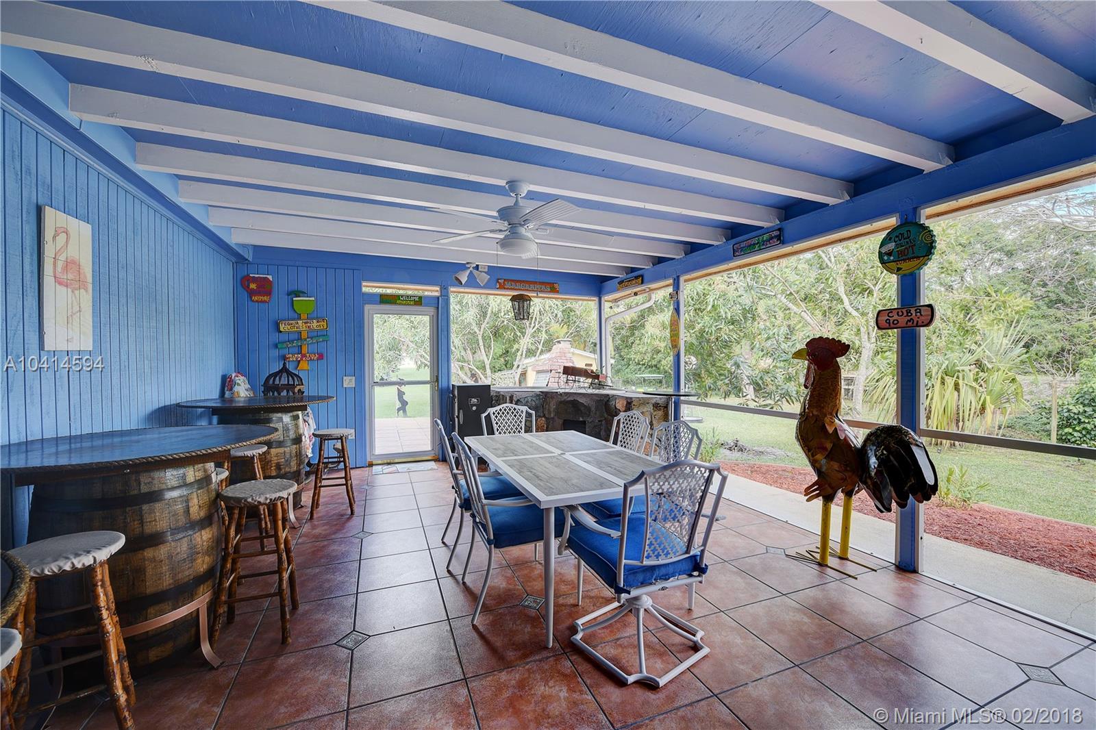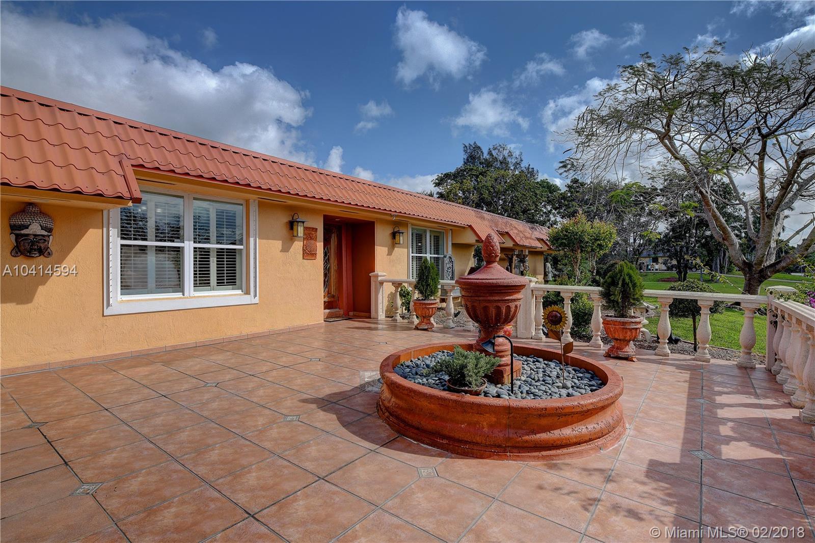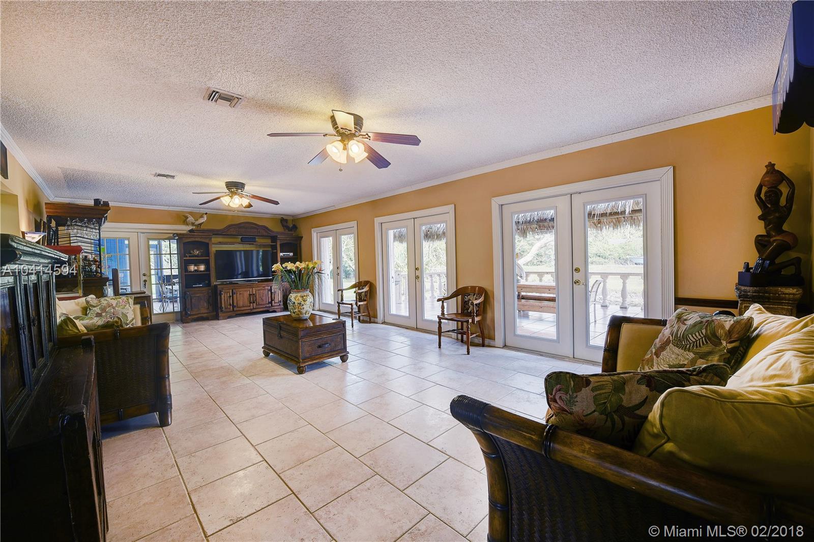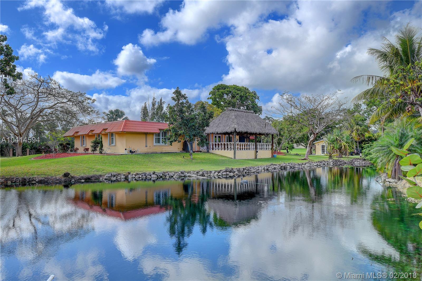 Beautiful Davie Ranch home. 1.03 acre lot with a private pond. Gorgeously updated bathrooms, formal dinning rm, large updated kitchen with granite counters & professional series SS appliances. Beautiful porcelain style flooring. HUGE family rm for the largest of gatherings with triple full view french doors leading out to an AMAZING & HUGE tiki hut featuring a big screen TV with breathtaking views of the private pond. Custom electric double gated entry to driveway. 2 CG plus attached storage room. Home boast an amazing & enclosed key west style lounging patio with a built-in custom grill. Additional detached CBS storage room with double french doors. Home is nestled on a gorgeous lot with beyond ample room for boats, RV's, etc. Call show assist for showings. Agents, read broker remarks.