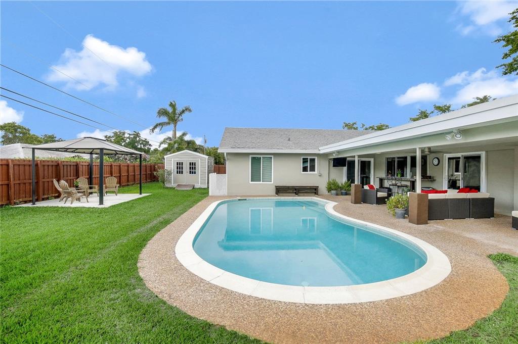This one will NOT last! TONS OF UPGRADES! Contemporary remodeled home with great outdoor living space. Upgrades include hurricane impact windows, new AC, new tile flooring, new electric panels, tankless water heater, flat ceilings, LED lighting. Large kitchen with wall of windows/pass thru to outside patio & bar. Guest bath renovated with spa-like finishes. Large covered patio makes a perfect place for entertaining. Large 10x12 shed w/power in back yard plus gazebo. Walking distance to elementary school.