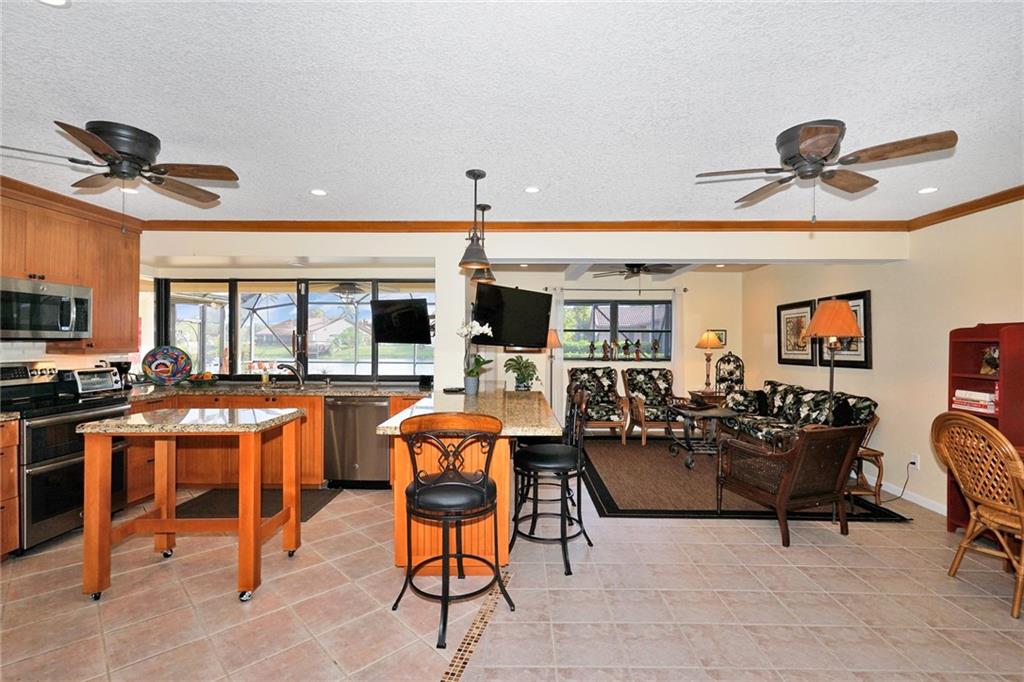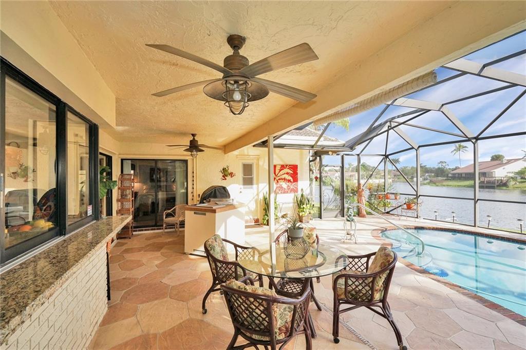Wonderful 3 bedroom 2 bath pool home with a great lake view. Extras include paver driveway, barrel roof, upgraded landscaping, heated & screened pool and large patio with convenient outdoor kitchen. 50K was just spent updating the wet bar and eat-in kitchen! Awesome floor plan with inviting entry, large corner window in front bedroom and sliders off master bedroom to pool area. Nice flooring throughout. Furniture is optional. This home has none of the pieces of the puzzle missing and will not last!
