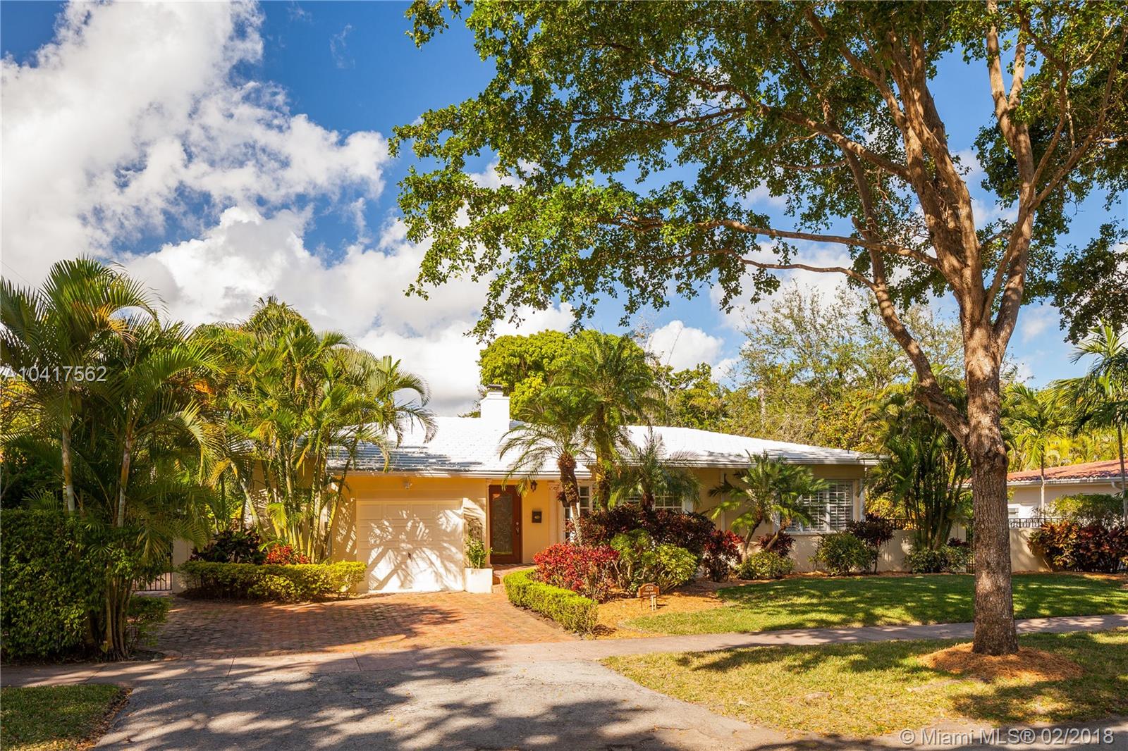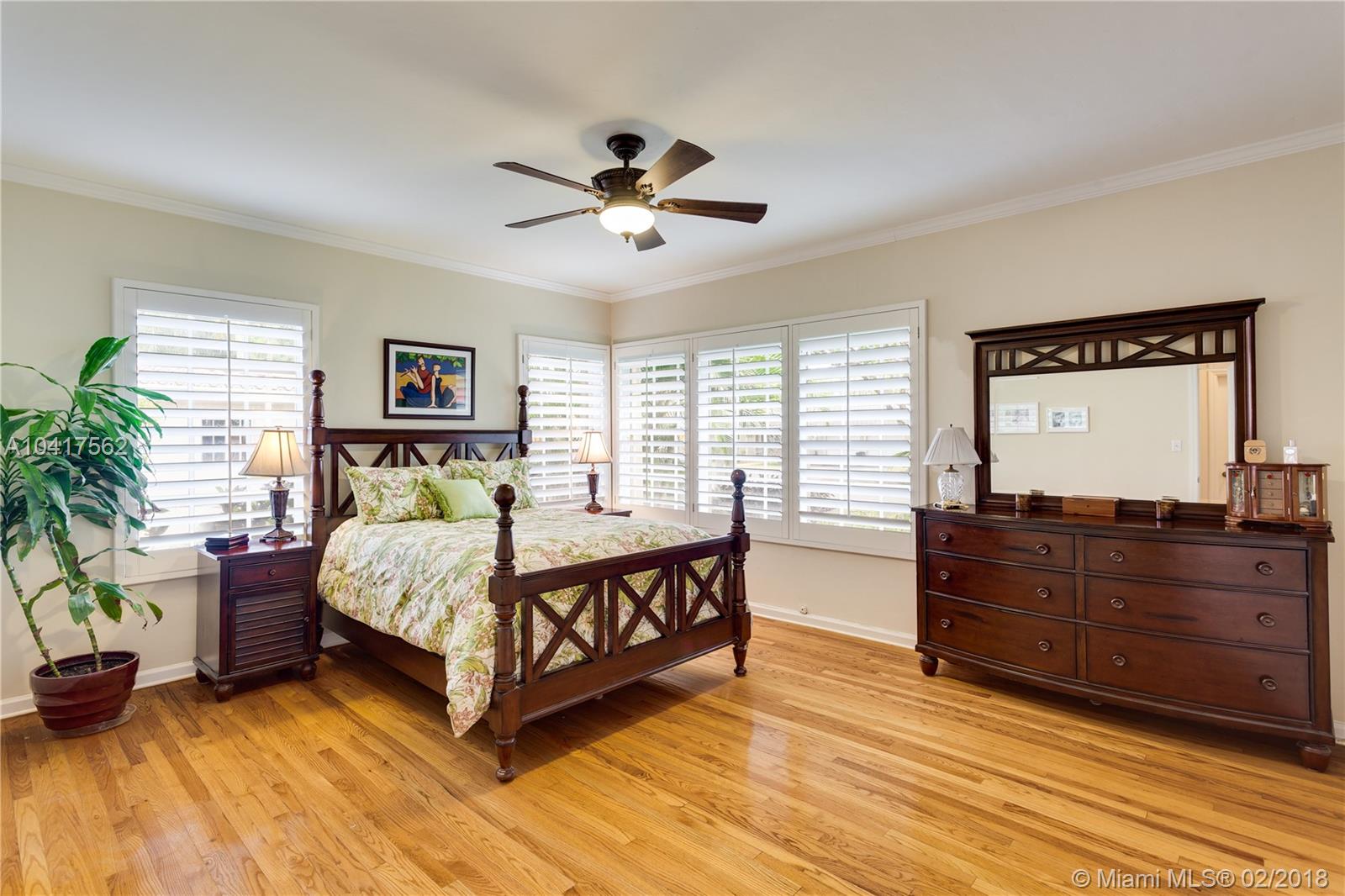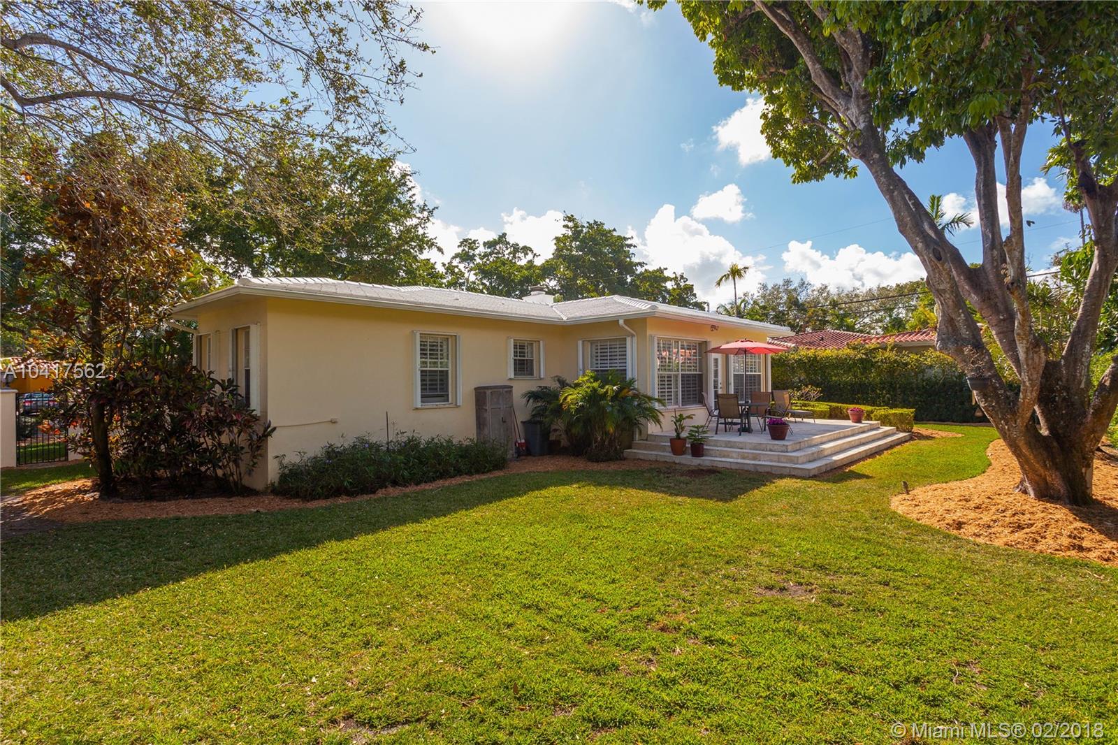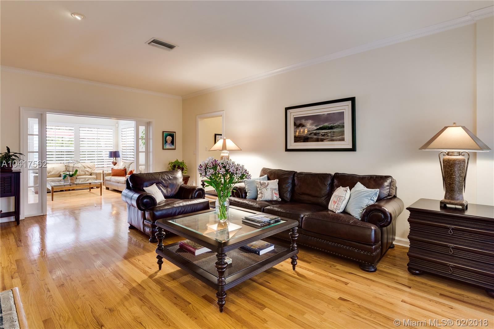 The pleasing combination of gorgeous wood floors, crown moldings, and plantation shutters are absolutely charming in this updated Coral Gables beauty. A handsome fireplace is the focal point of the living room while the sun-kissed family room overlooks the garden that has ample room for a pool. Beautifully updated kitchen with wood, granite & ss appliances provide a delightful cooking space. The dining room can comfortably fit a large crowd. Newer roof. Chicago pavers add to the picturesque quality of this 1-story home. A very special home.