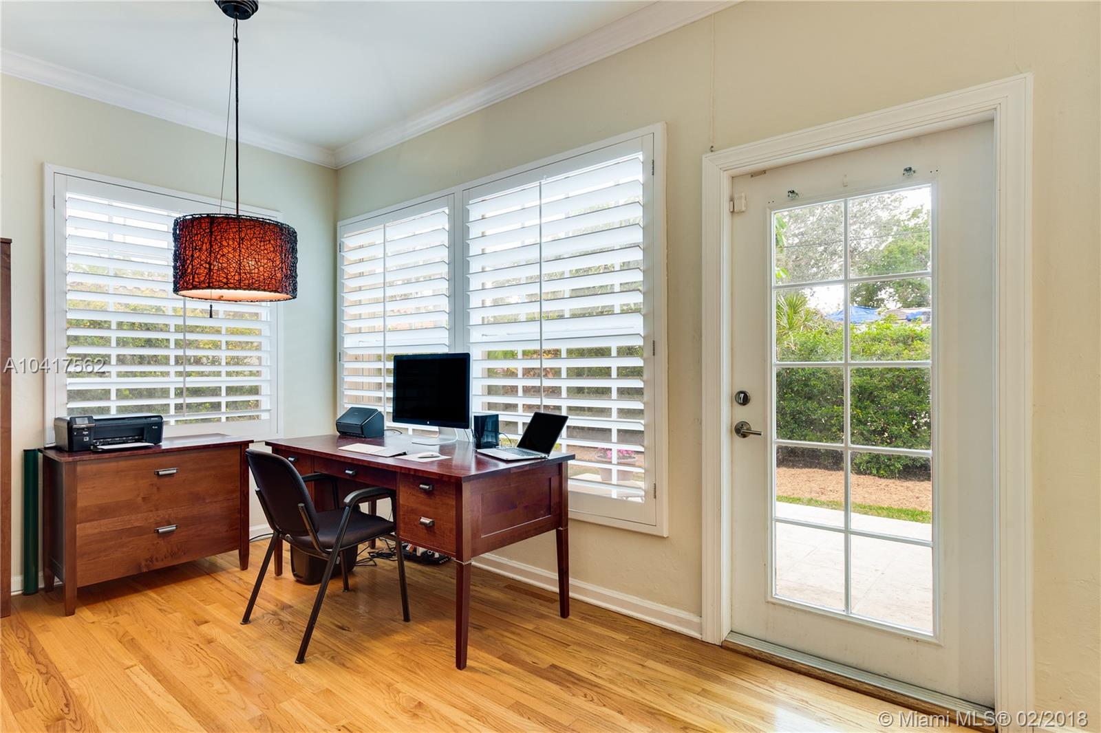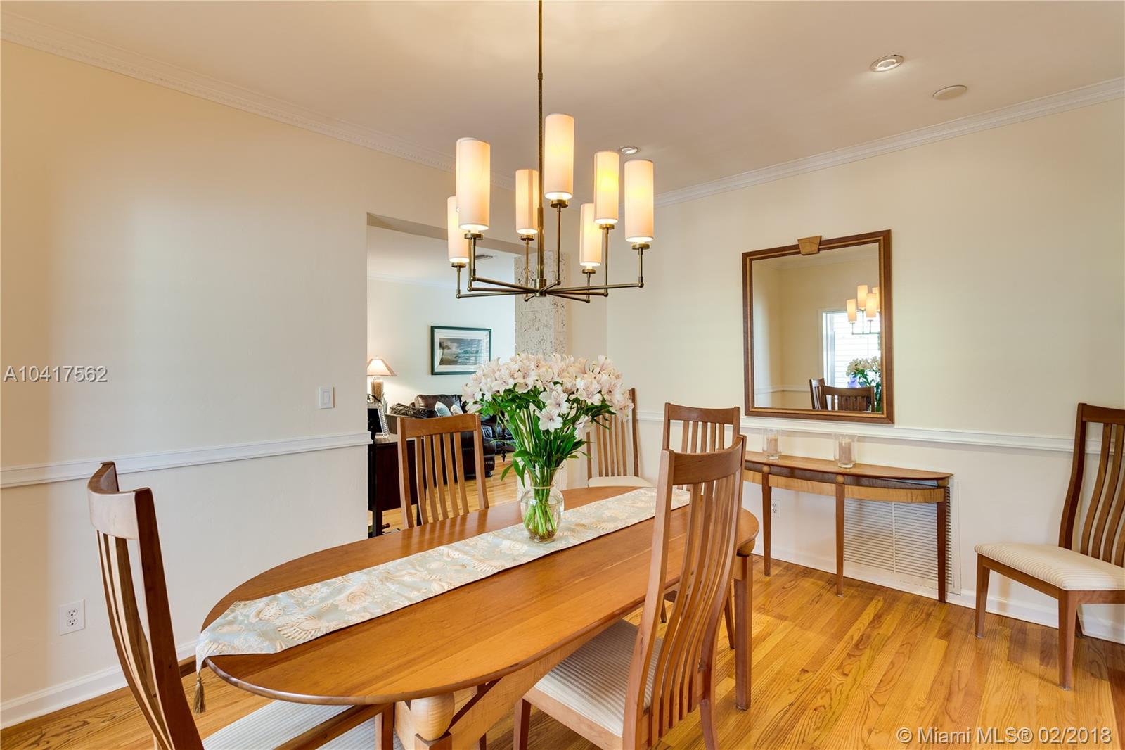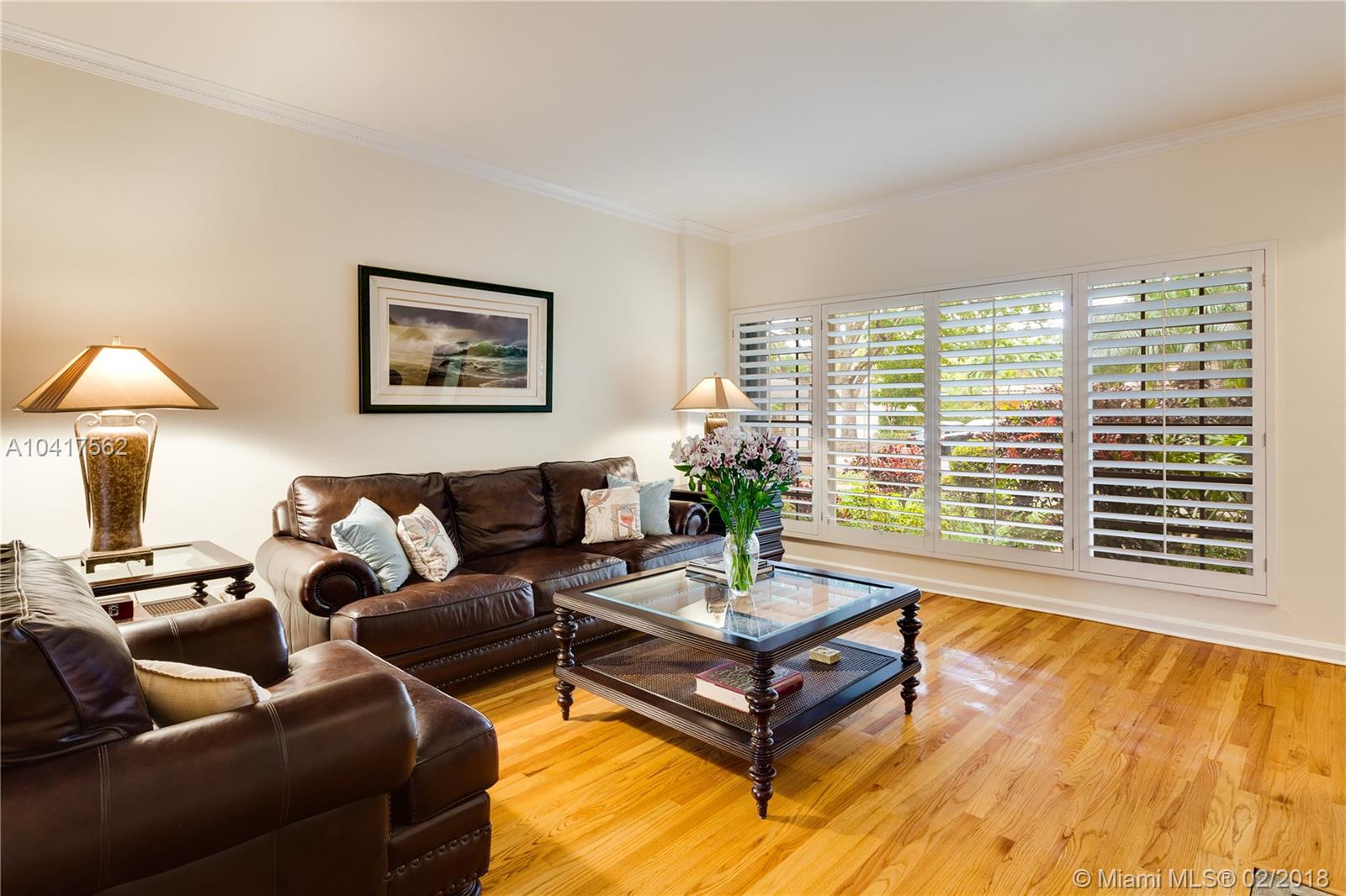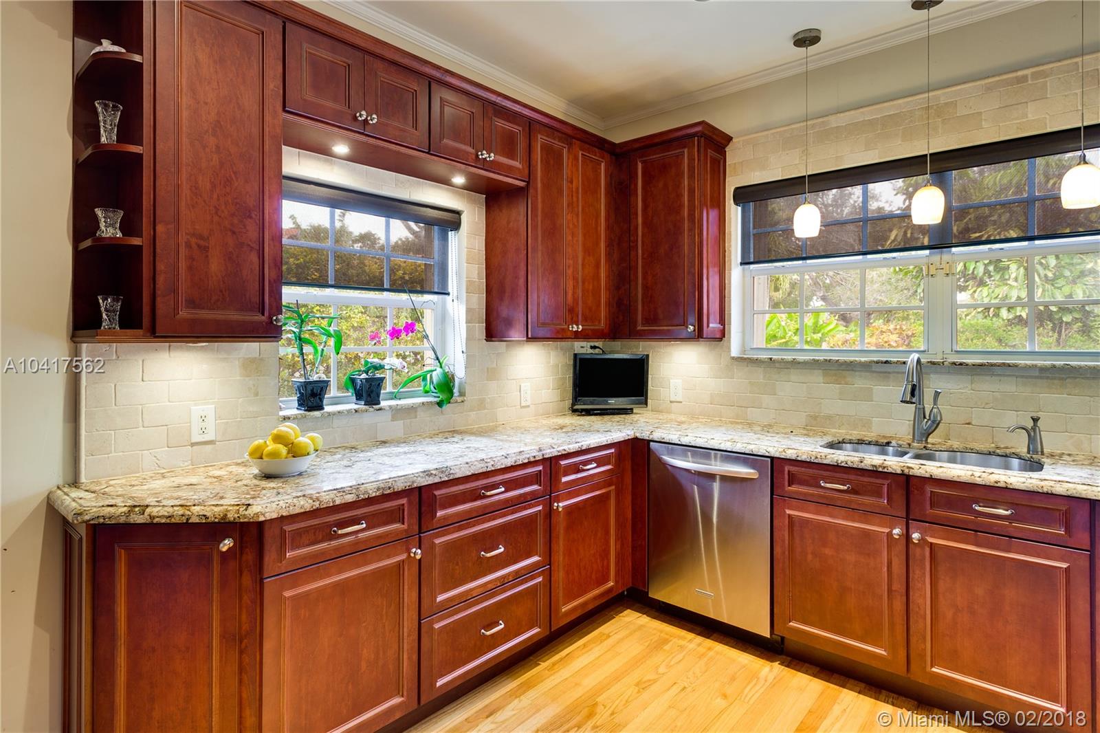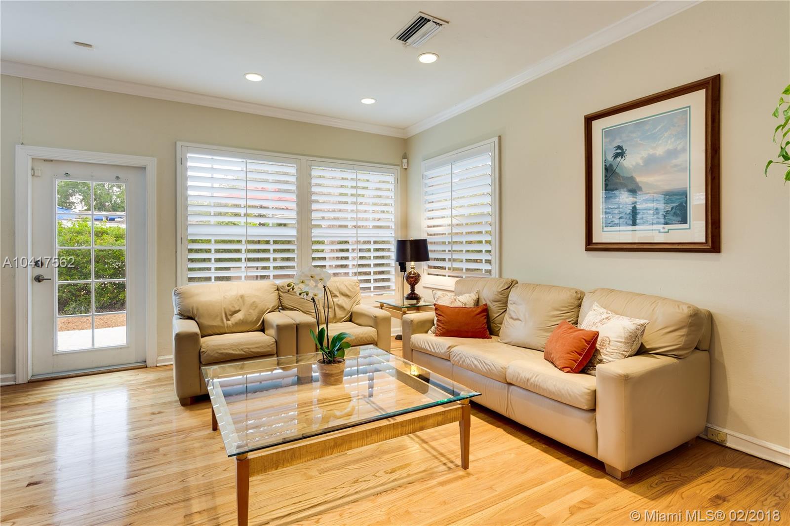 The pleasing combination of gorgeous wood floors, crown moldings, and plantation shutters are absolutely charming in this updated Coral Gables beauty. A handsome fireplace is the focal point of the living room while the sun-kissed family room overlooks the garden that has ample room for a pool. Beautifully updated kitchen with wood, granite & ss appliances provide a delightful cooking space. The dining room can comfortably fit a large crowd. Newer roof. Chicago pavers add to the picturesque quality of this 1-story home. A very special home.