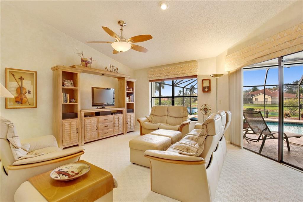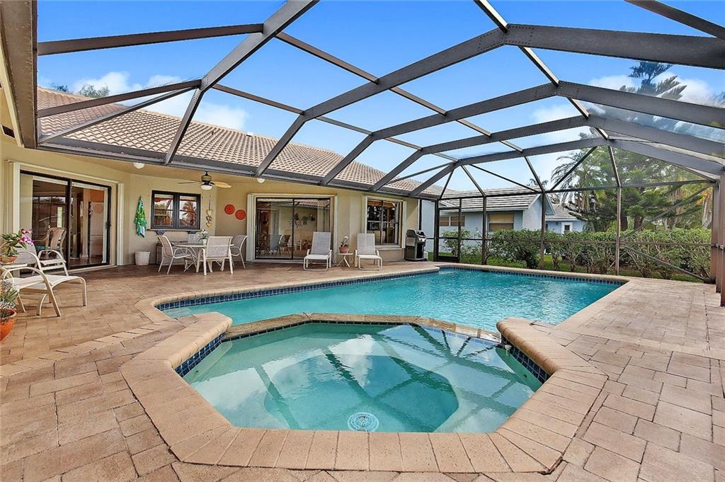Beautiful wide water tri-canal view! Spacious split floor plan is light, bright, Storm Safe: Impact windows, Accordians,07 Roof/Screen, Garage Door '17! Stylish updates: bathrooms, soaking tub, spacious master suite, 2 walk-in closets, vanity/dressing area, wood blinds, hi-hats, surround sound, gourmet eat in kitchen: Warm Wood cabinets, Granite counter tops, dble sinks. Spacious yard, pavers, Diamond brite pool, foyer garden & bubbling fountain, newer A/C, Hot Water Tank 2014, Home Warranty Plan, Low HOA