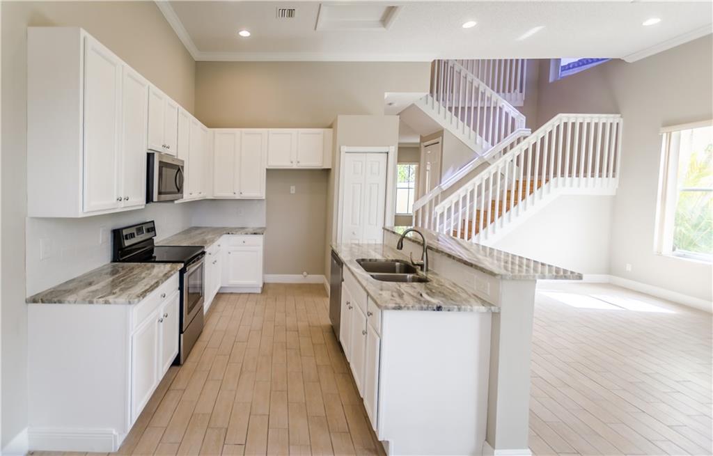 Fabulous lakefront 3 bedroom 2 1/2 bathroom house in exclusive gated Monarch Lakes community! This home has a beautiful private screened in pool nestled away right on the water! Huge, open floorplan, freshly painted inside and out, brand new fantasy brown marble countertops and new stainless steel appliances in kitchen, too much to list! Upstairs has huge loft area and laminate floors. Community also has pool and playground. See it fast, won't last long!